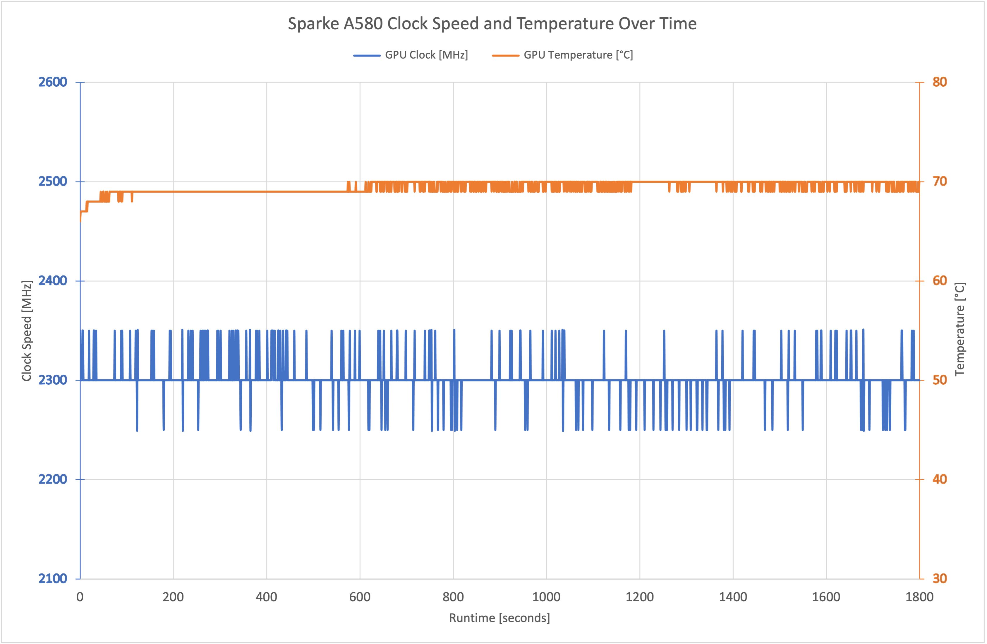 Clock speed for the A580 Orc fluctuates in 50MHz steps. By and large it held stable at 2300MHz, but with occasional drops to 2250MHz, or spikes up to 2350MHz.
