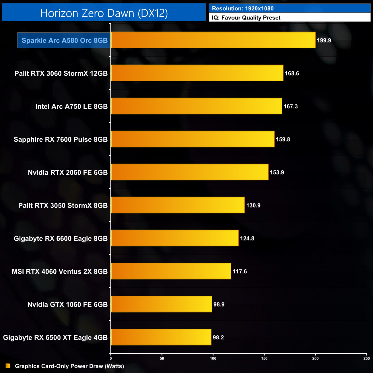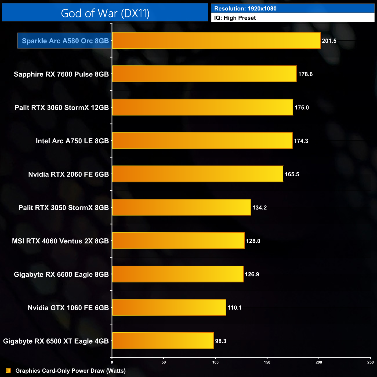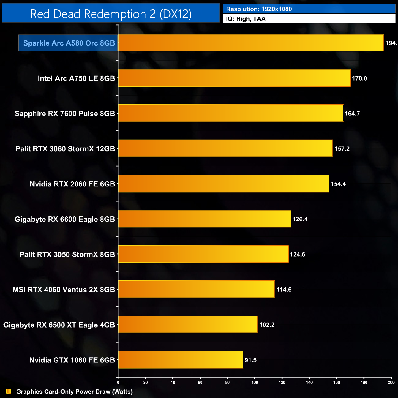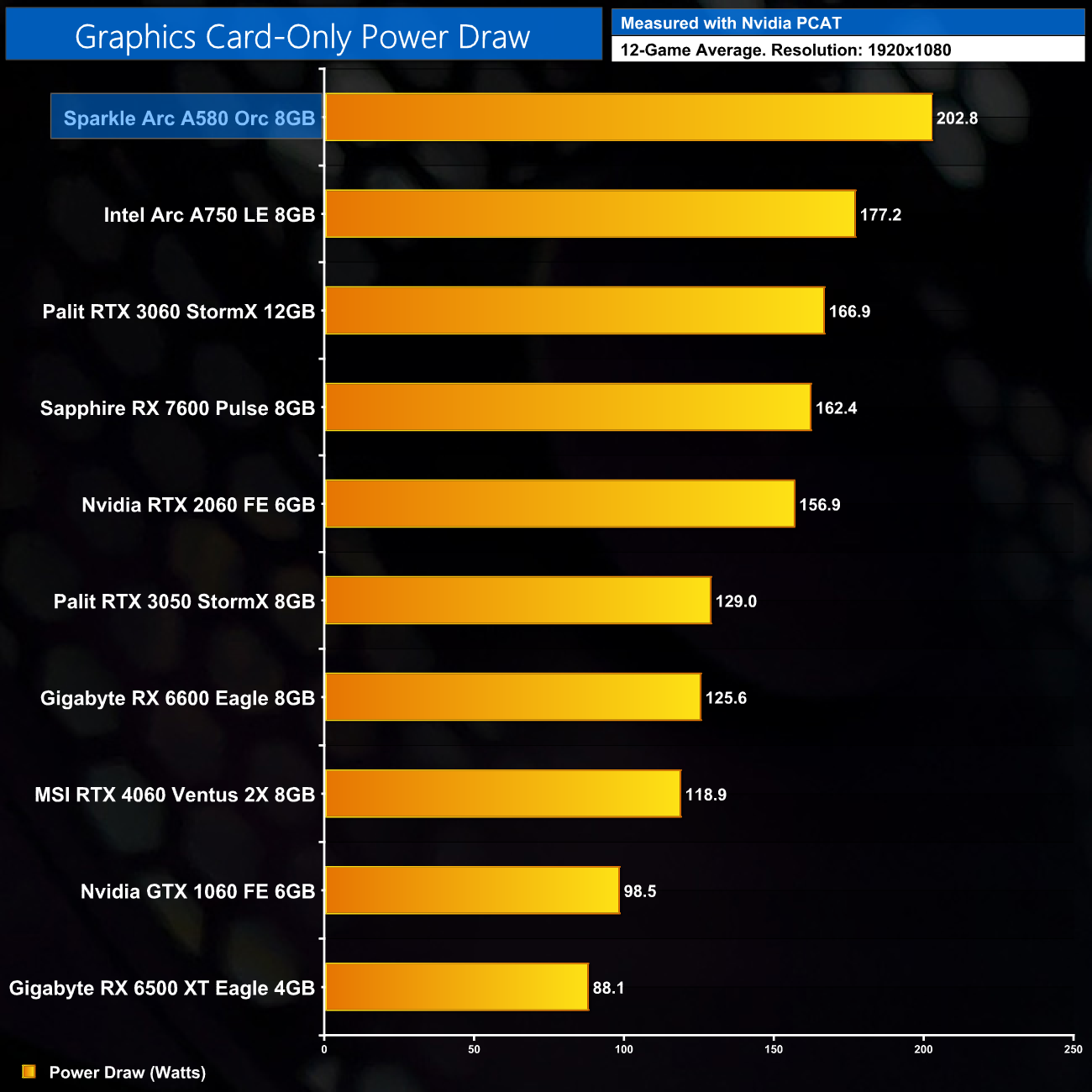 Averaged over all 12 games tested, it drew 202.8W, which is a 14% increase over the A750, or a massive 61% increase over the RX 6600. This does not bode well for efficiency…