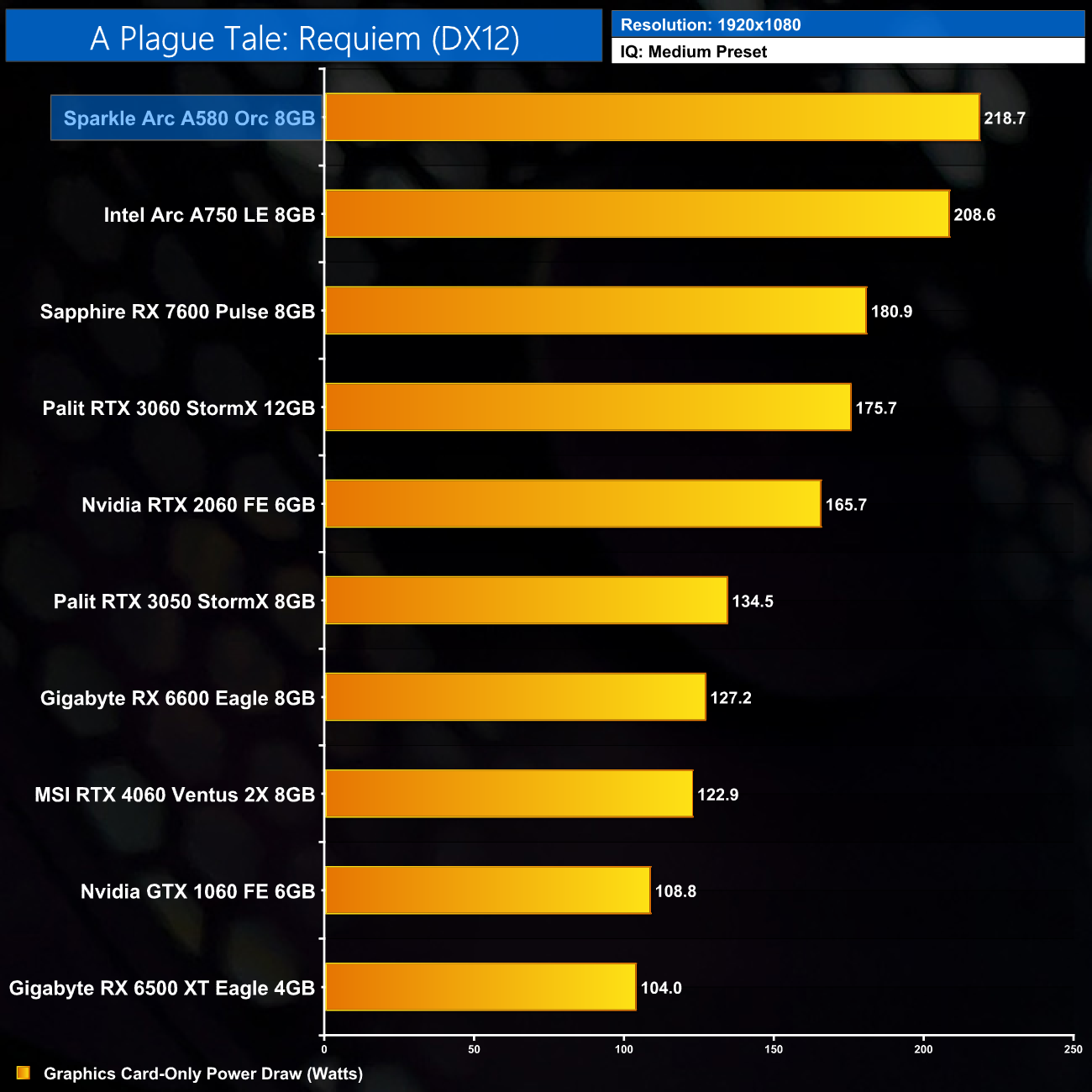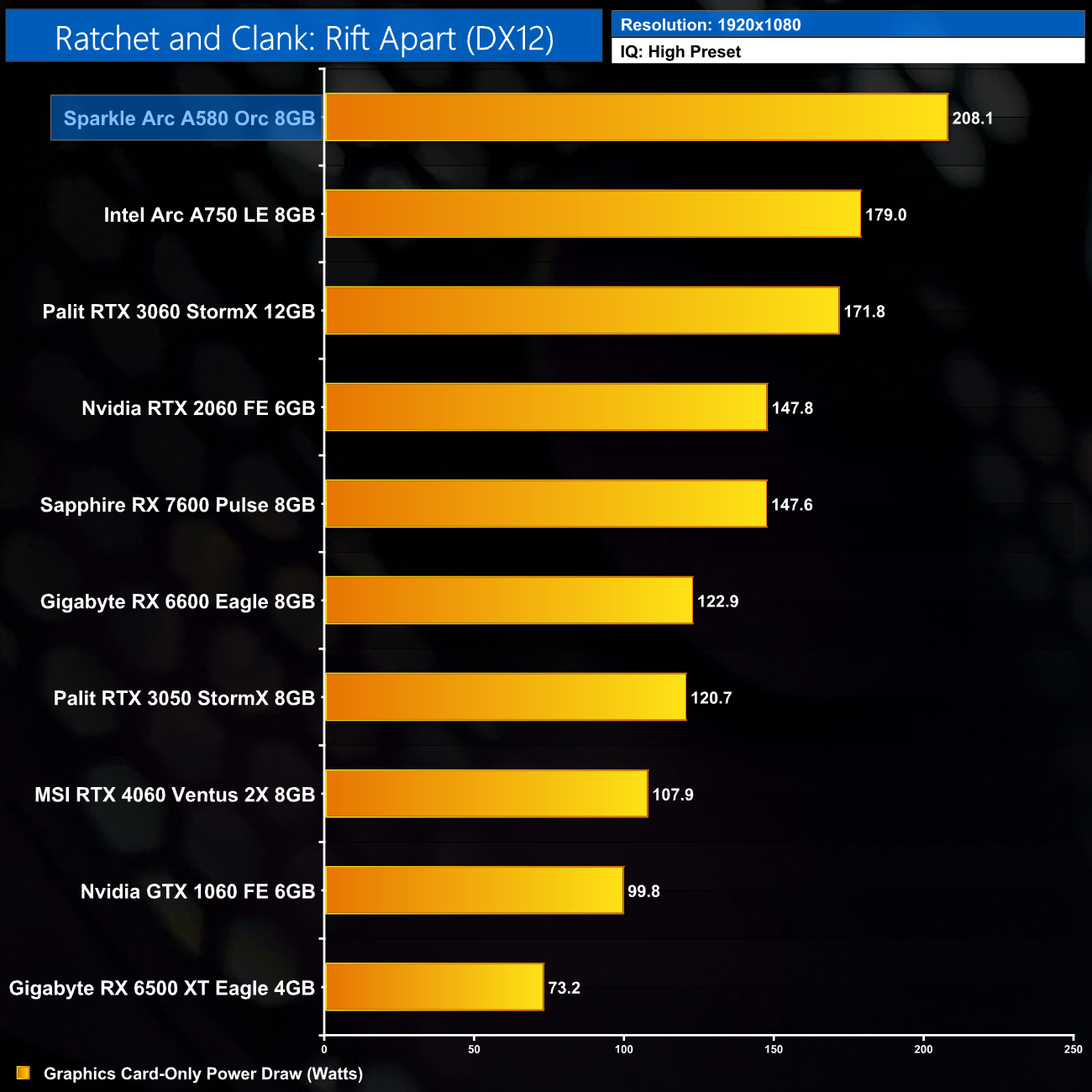 In terms of power draw, as discussed at the start of this review on page 4, Sparkle has increased the power limit significantly. Intel's reference spec suggests a 185W baseline, but the Orc appears to target 215W. It doesn't draw this much in every game we tested, but it always drew more power than the A750 Limited Edition, often by 30 or 40W.