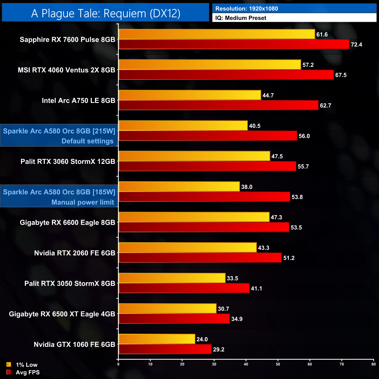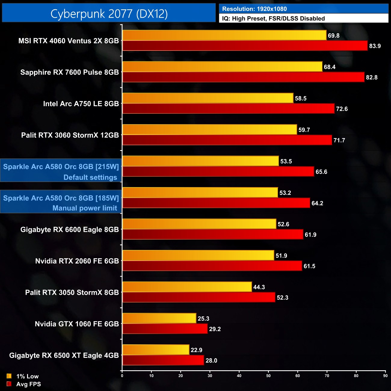 Before we dive into the benchmarks, we should clarify how we've tested the Sparkle Arc A580 Orc today. Usually, we test all of our comparison GPUs at reference specifications for these reviews – that's easier when we get the Nvidia Founders Edition, or Intel Limited Edition boards for review. The Sparkle Orc is an AIB card and not only has it been factory overclocked from 1.7GHz up to 2GHz, but it quickly became clear from our testing that Sparkle has significantly increased the power draw – Intel claims the A580 should hit 185W, but we saw 215W power draw from the Orc.
