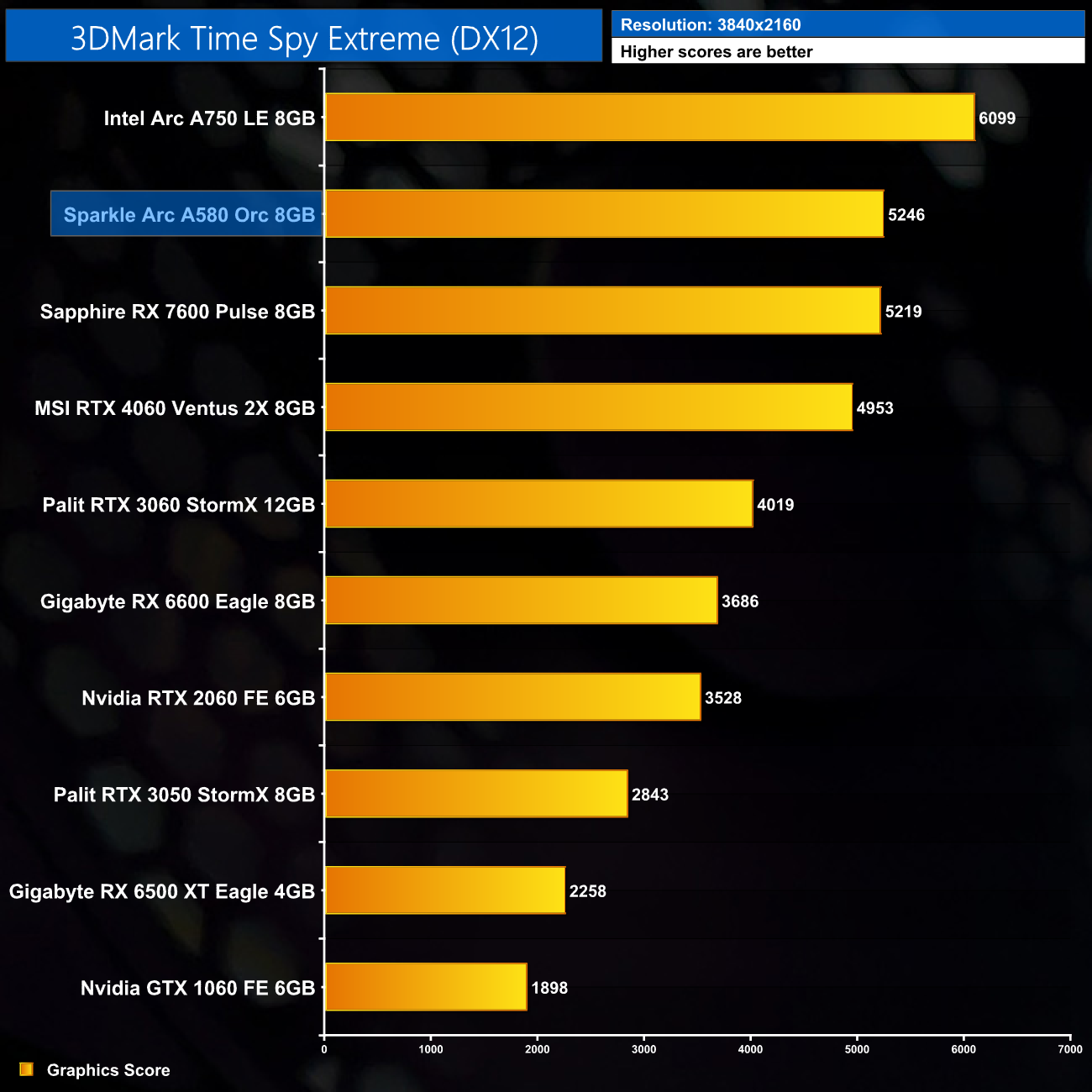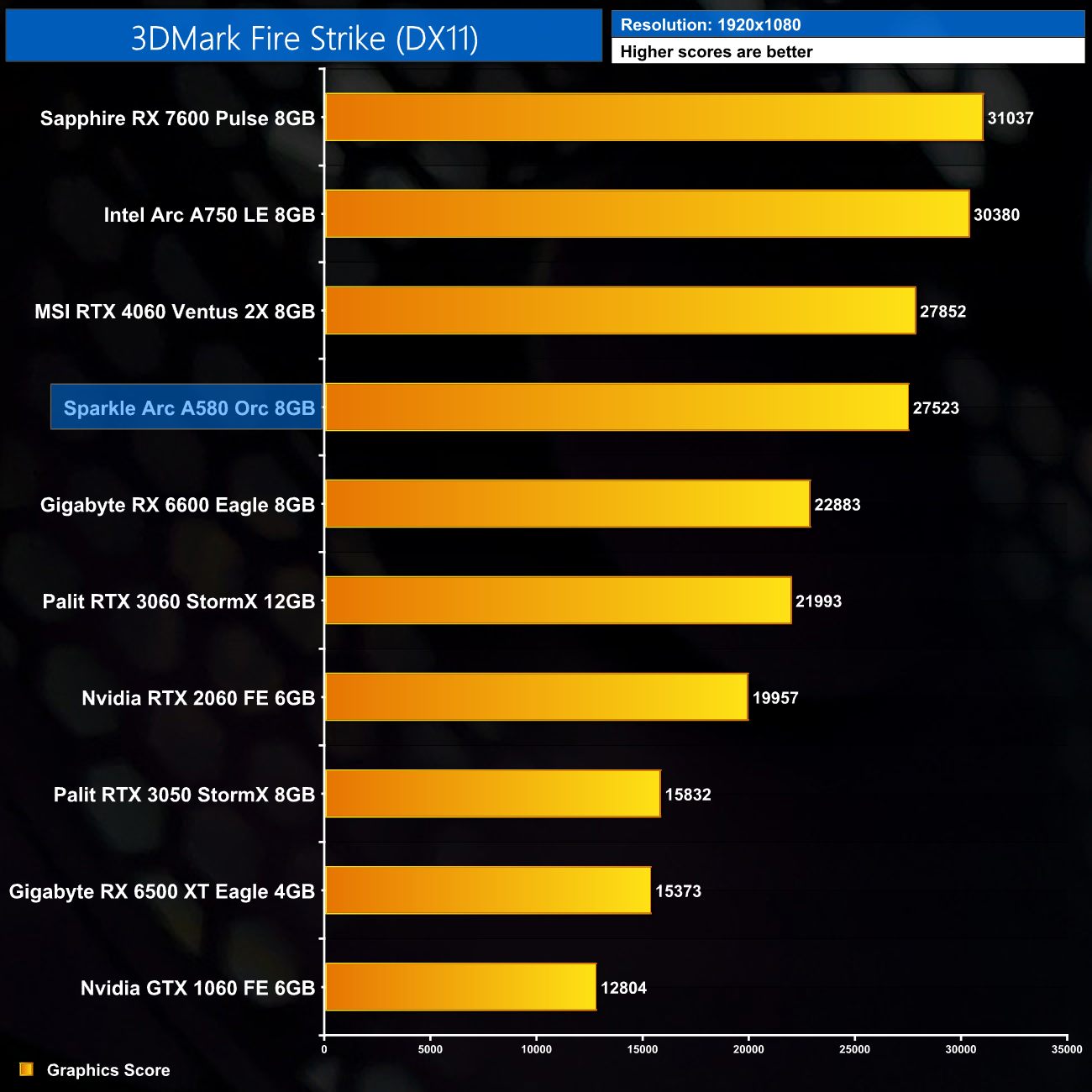 We get our first look at performance indicators in 3DMark, where the A580 scales very well – it's 20% faster than the RX 6600 in Fire Strike, but we'll have to see if that plays out in our game benchmarks.