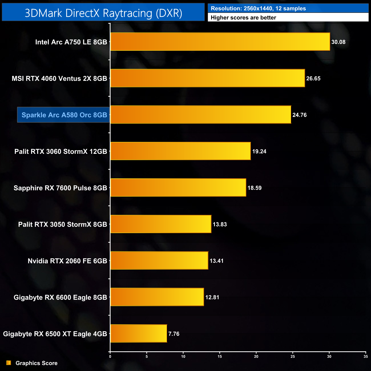 3DMark's DXR Featuretest also shows very promising performance, with the A580 only a couple frames behind the RTX 4060, while it's well clear of the RTX 3060.