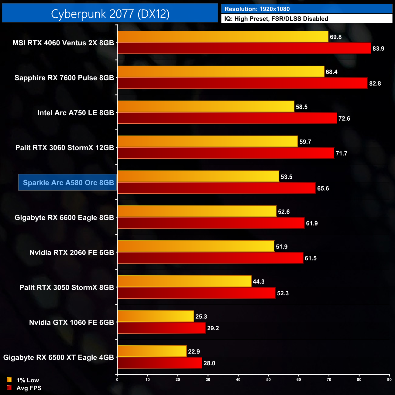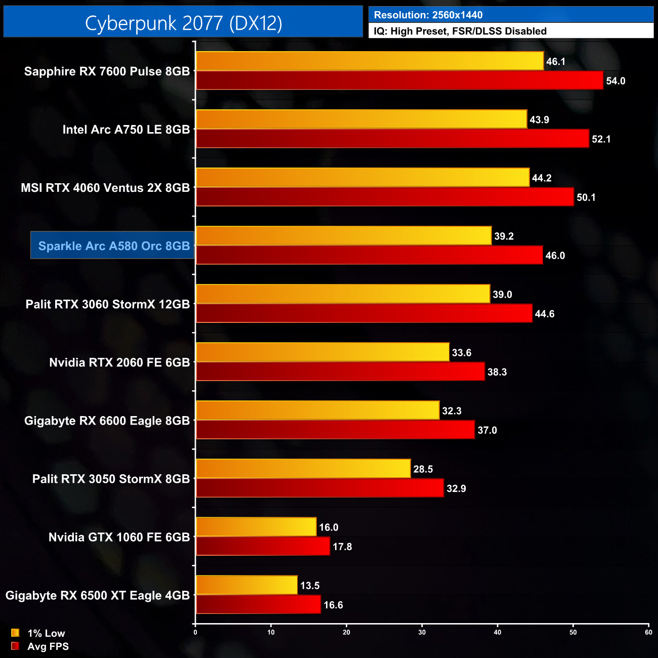 As for Cyberpunk 2077 using the new 2.0 update, the A580 looks better here, delivering 66FPS on average and holding a 6% lead over the RX 6600, while it's in a different league to the RTX 3050.
