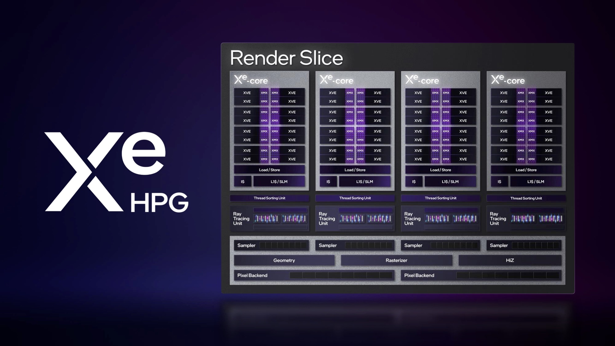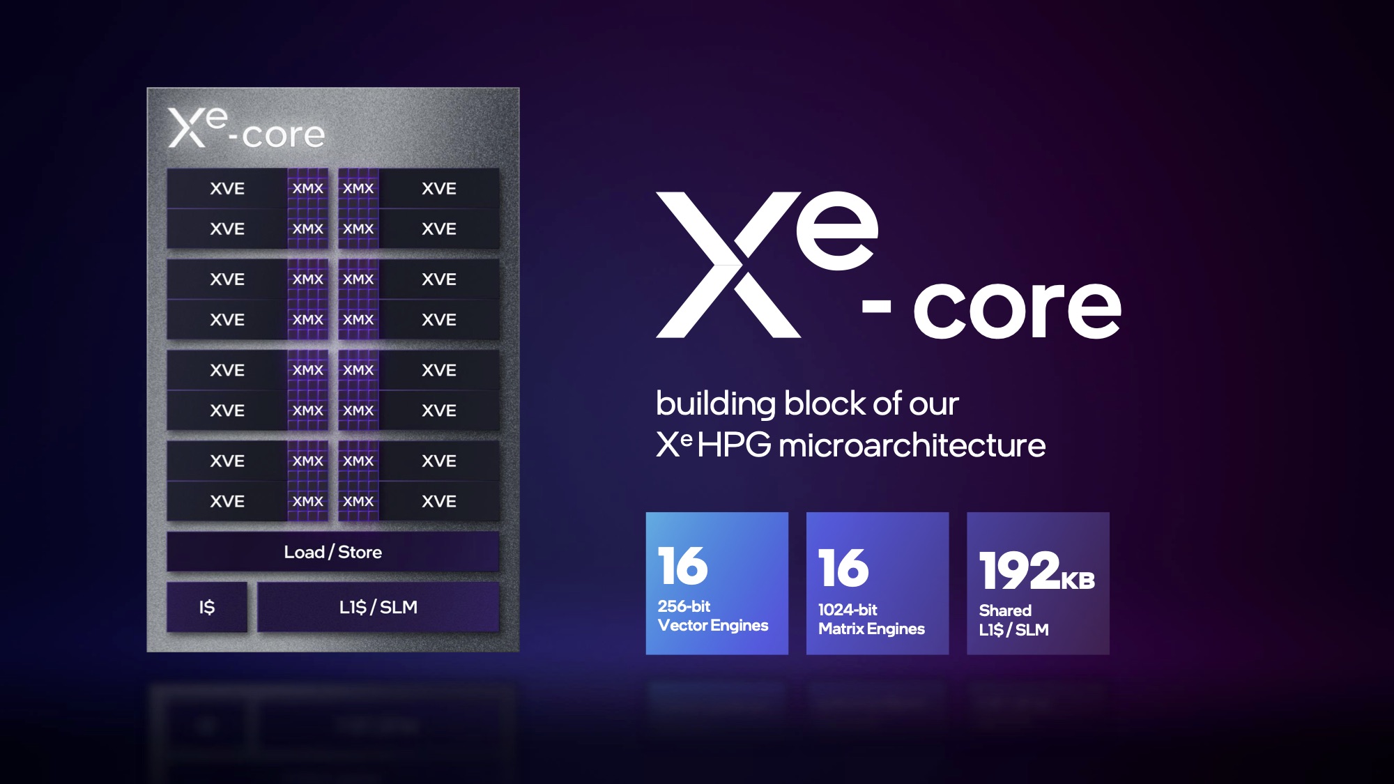 We've taken a look at the Xe HPG architecture in the past, but to remind ourselves of what we are looking at today, above we can see a comparison of the core spec of the A750 and A770. Both SKUs are built on Intel's ACM-G10 silicon, but the A750 is shaved down slightly. While the full die offers 32 Xe cores, the A750 ships with 28 Xe cores, where each core offers 16 vector engines, with each vector engine housing 8 FP32 ALUs, for a grand total of 3584.