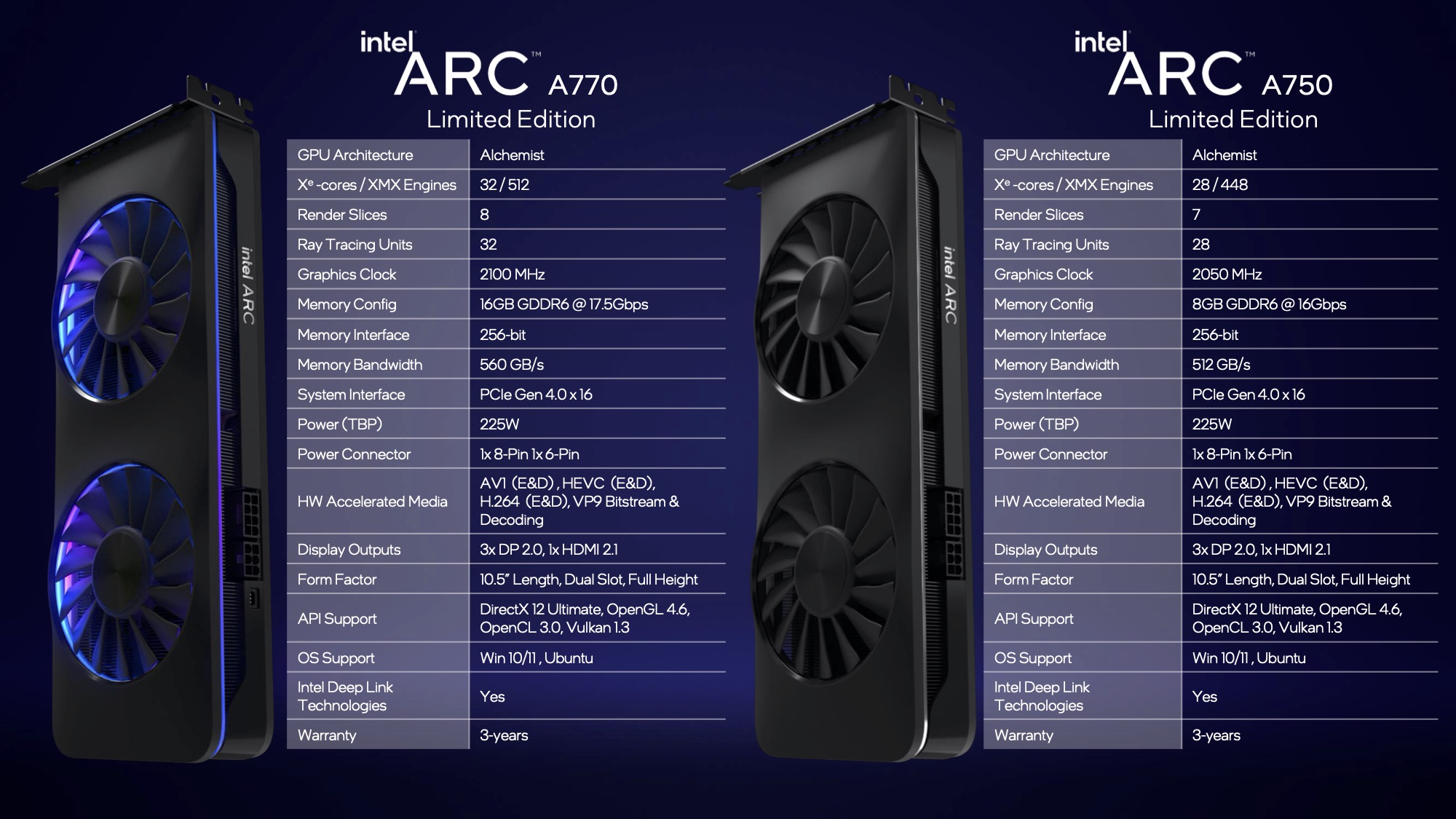 It's also worth clarifying that today we are reviewing the Limited Edition cards. Despite the name, these are not limited in quantity and you can instead think of the Limited Edition as the equivalent to Nvidia's Founders Edition – boards manufactured by Intel and sold directly to consumers. Intel was firm with us that the Limited Edition models will be available at the announced prices, so $289 for the A750 and $349 for the A770, with the A770 Limited Edition only available with 16GB VRAM. Partner cards with 8GB VRAM will start at $329.
