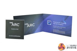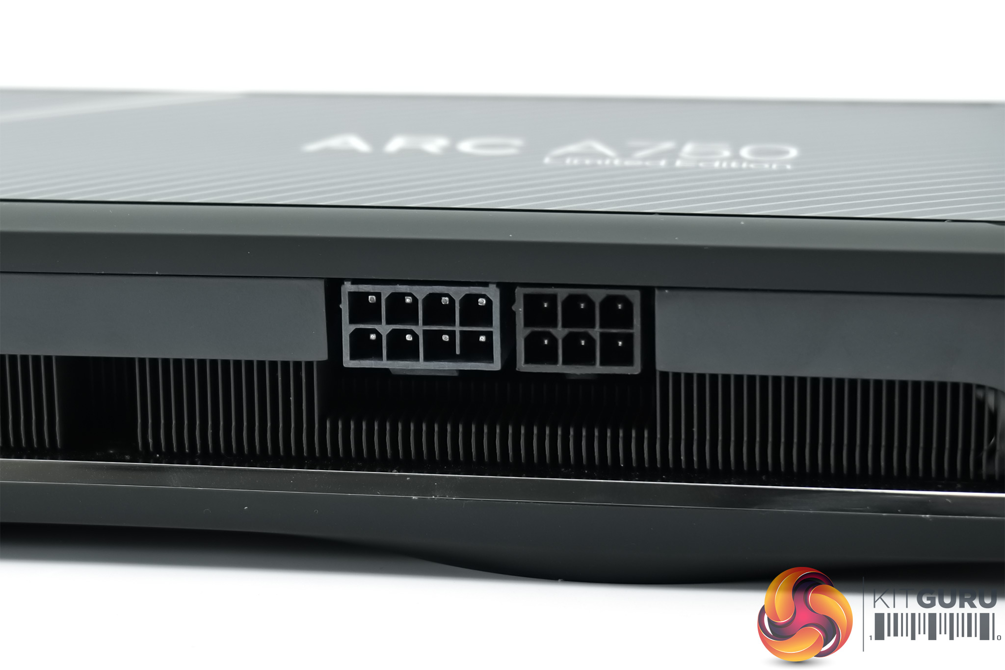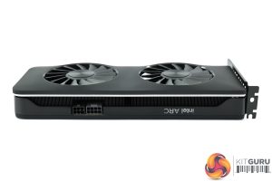 That logo is visible above, along with the front of the shroud. Intel's backplate design is also eye-catching, with a pin-stripe design. The backplate itself is made from plastic and doesn't feel particularly sturdy, but it certainly looks the part.
