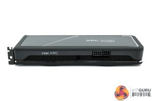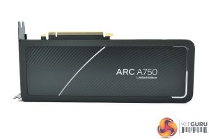 That's also true in terms of dimensions, as the Limited Edition is just 2-slots thick and a standard 10.5″, or 266.7mm, length. A metallic silver strip runs the length of the card, replacing the RGB strip that is present on the A770. There is no RGB lighting on the A750, just a white LED that illuminates the Intel Arc logo on the front of the card.