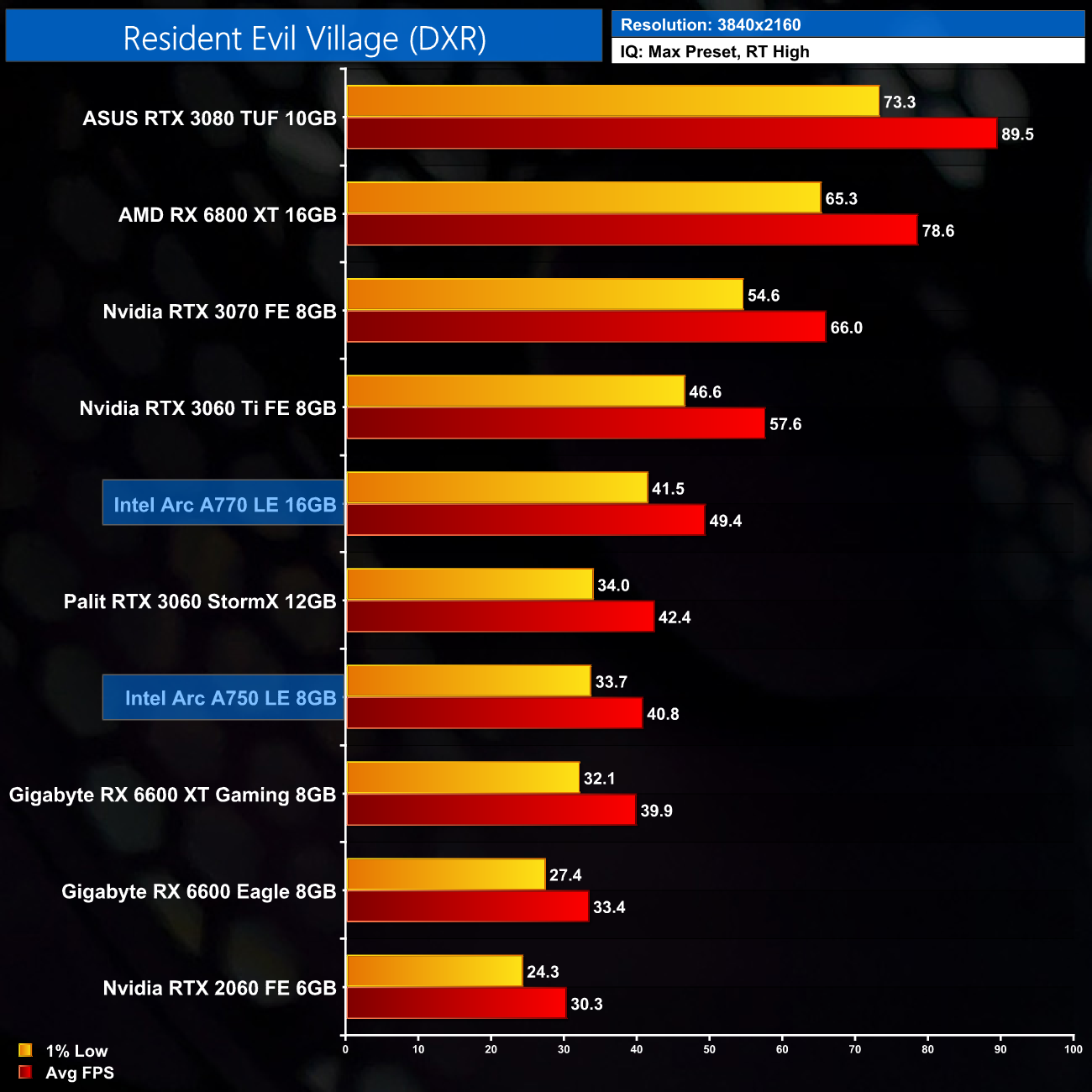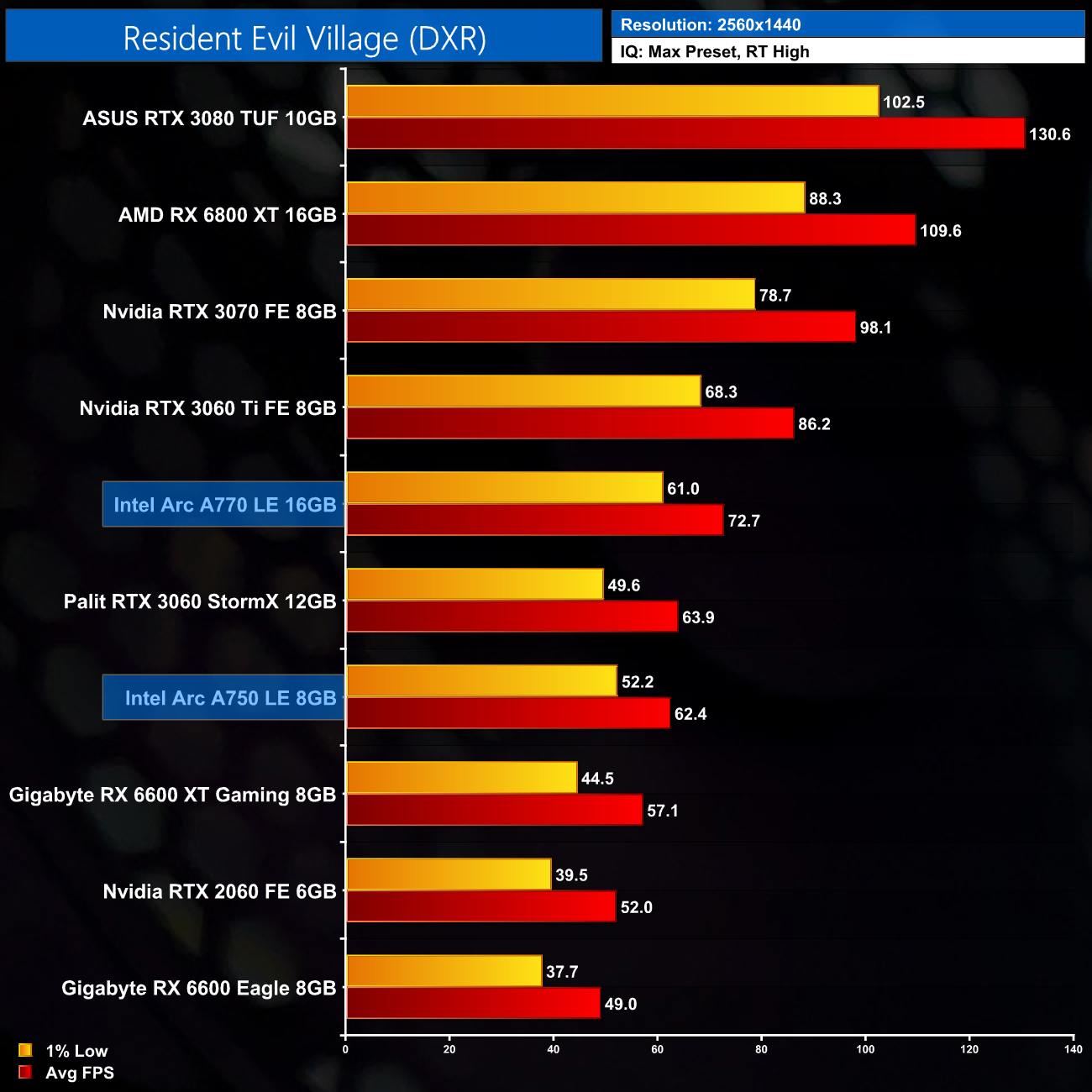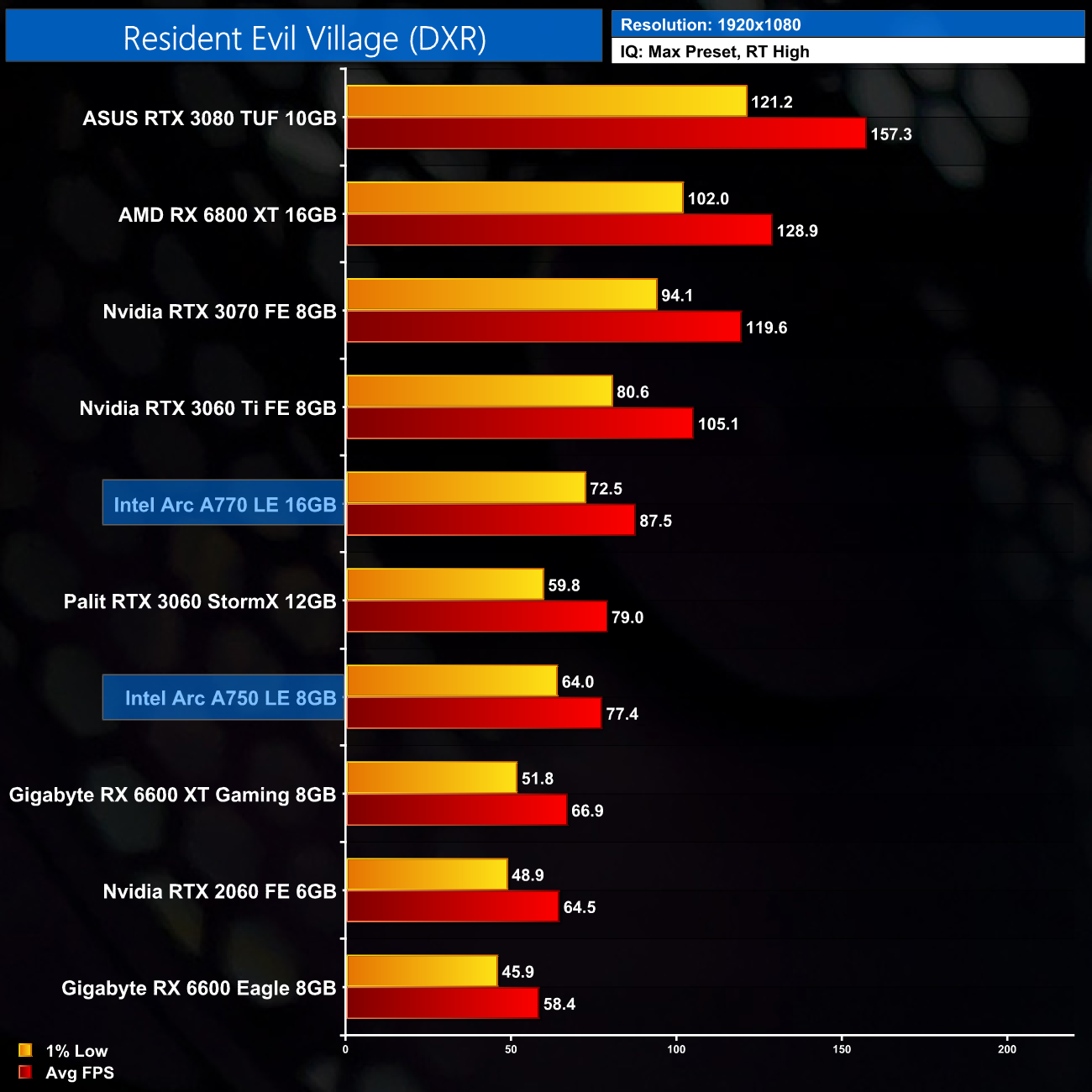Resident Evil Village also shows the A750's ray tracing performance to be at a similar level to the RTX 3060, with both cards averaging just below 80FPS at 1080p, and around 60FPS at 1440p.