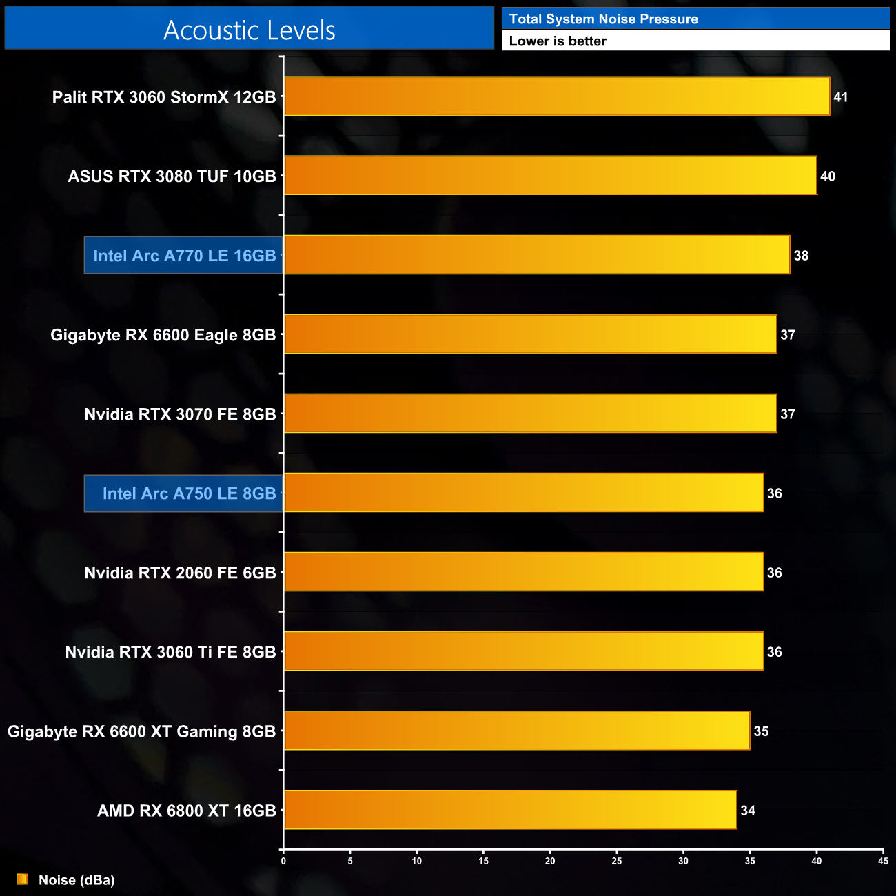 We take our noise measurements with the sound meter positioned 1 foot from the graphics card. I measured the noise floor to be 32 dBA, thus anything above this level can be attributed to the graphics cards. The power supply is passive for the entire power output range we tested all graphics cards in, while all CPU and system fans were disabled. A reading under load comes from running Cyberpunk 2077 for 30 minutes.