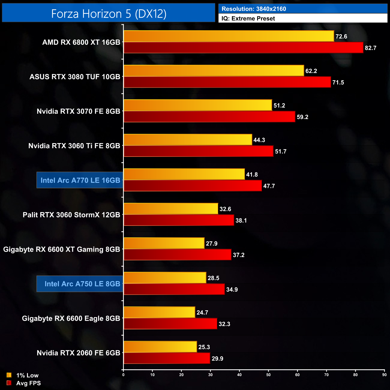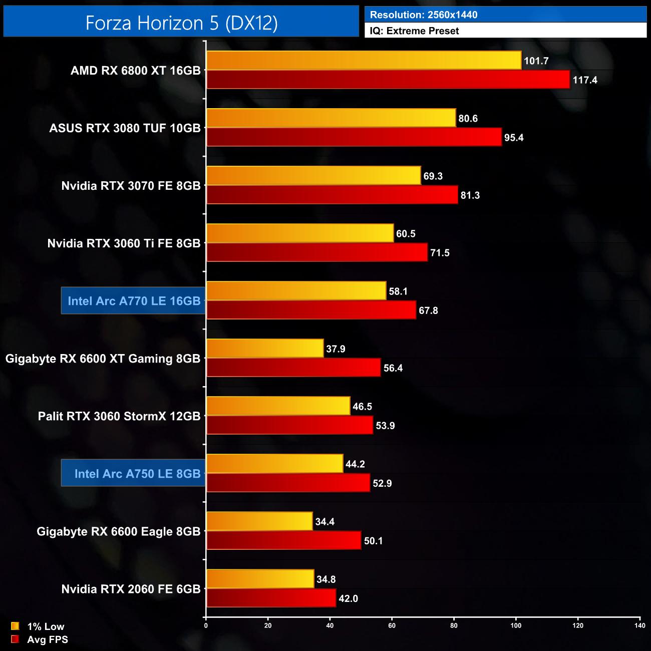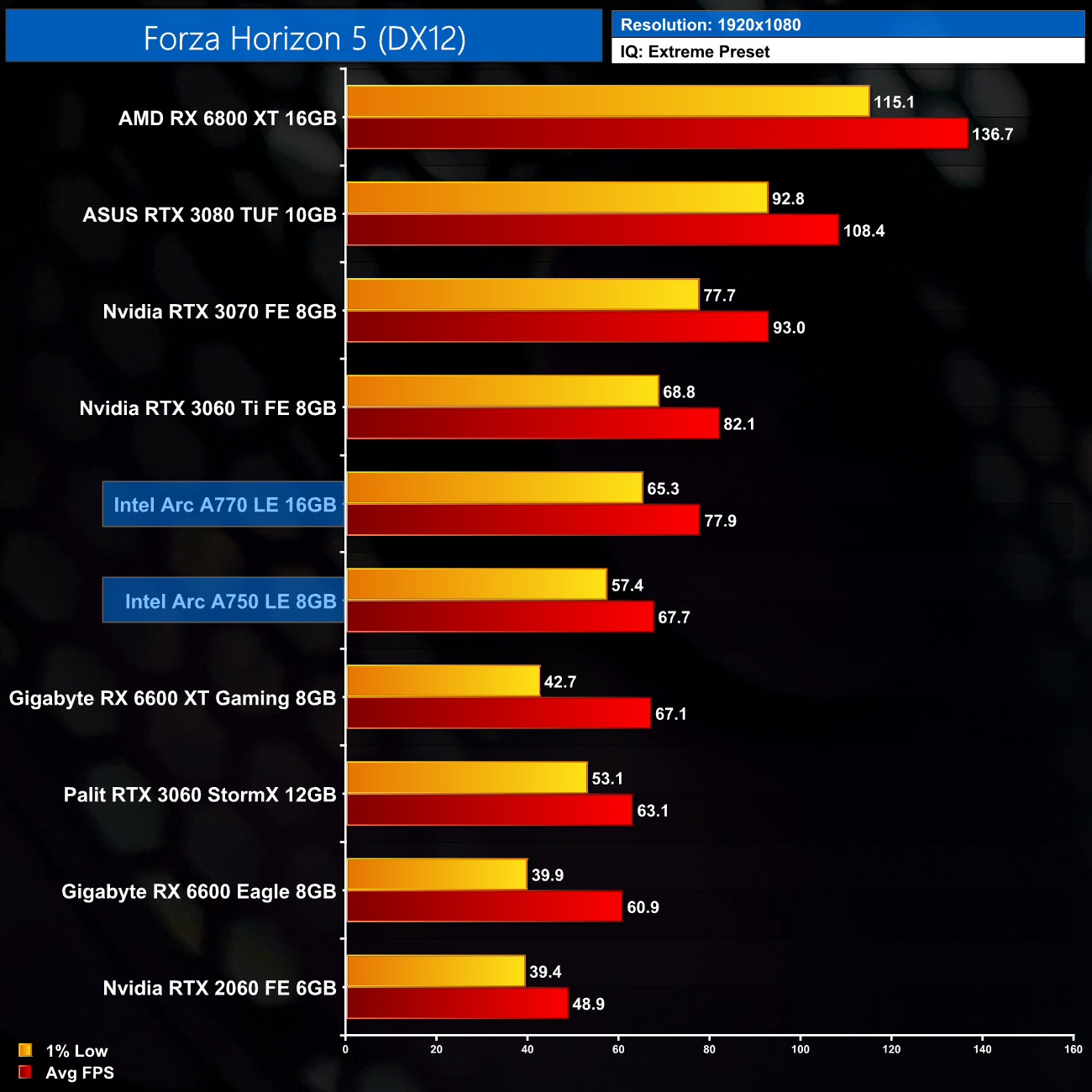 Forza Horizon 5 is highly demanding using the Extreme preset and is particularly VRAM intensive even at 1080p. We can see the A770 takes a lead of 15% over the A750 here – the biggest margin between the two we will see today – with VRAM a likely factor. At 1440p, the A770 pulls away further and comes in a whopping 28% ahead of the A750, so it does show there are at least some games which benefit from more than 8GB VRAM, even in this performance segment.