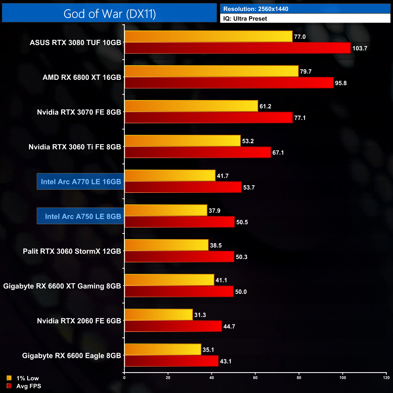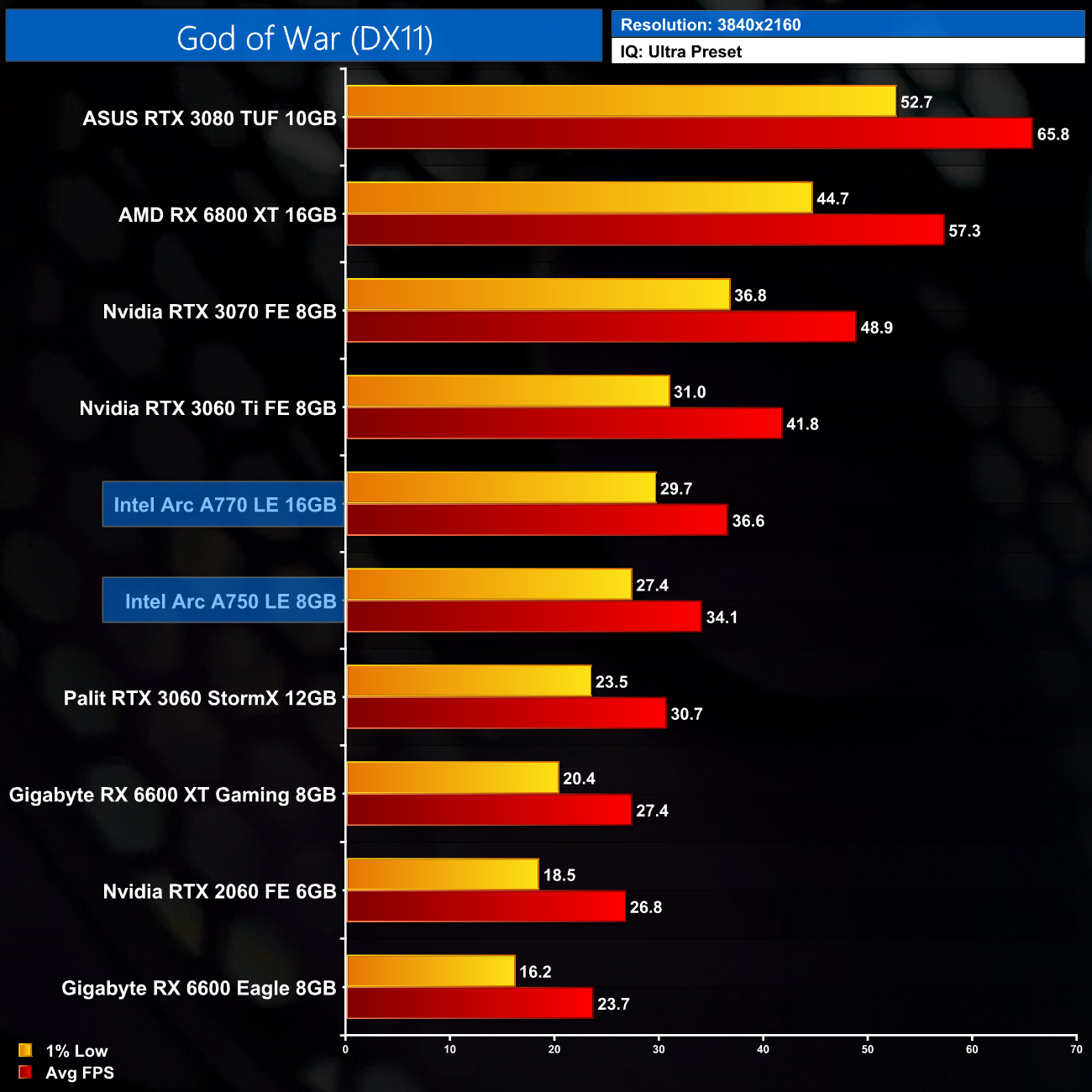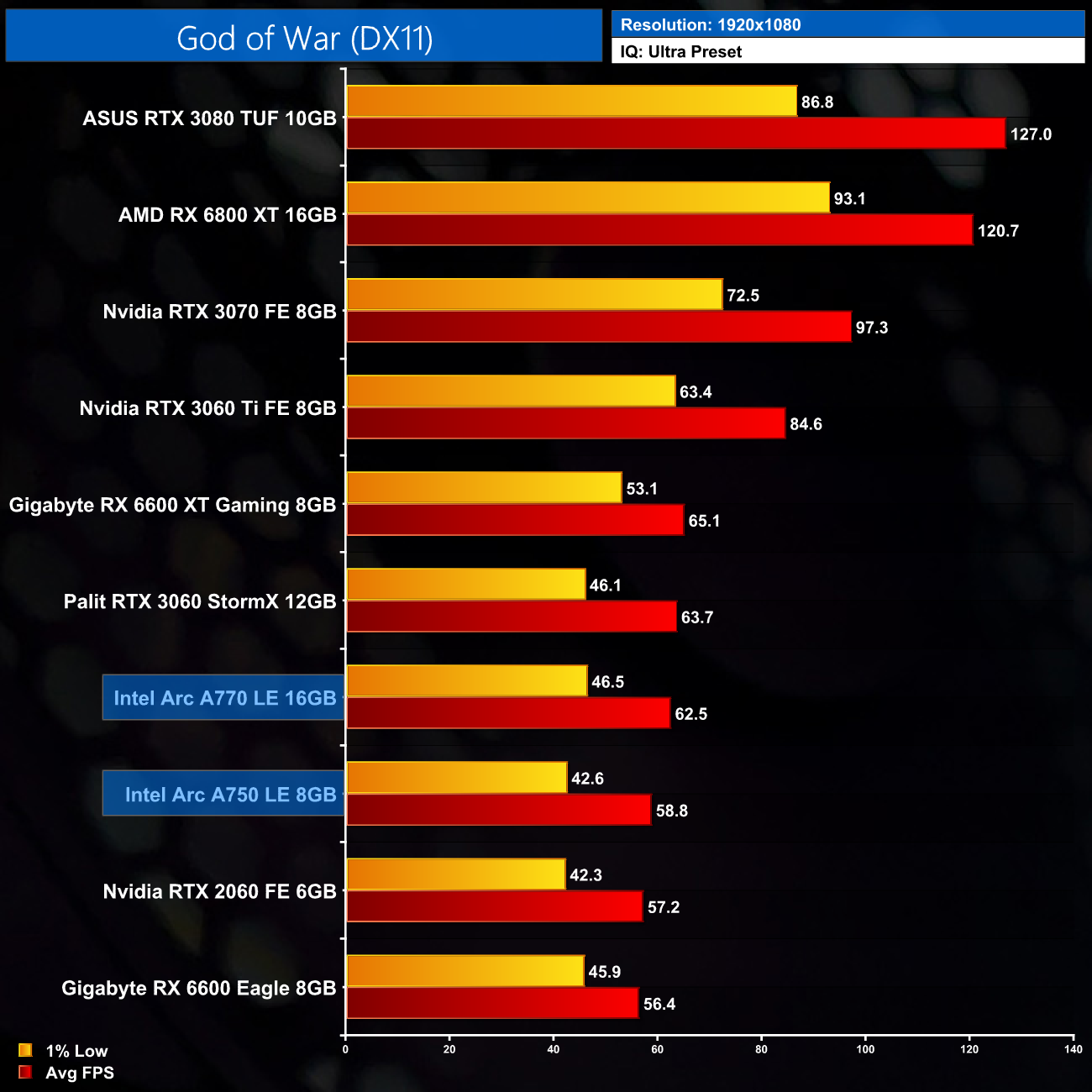 Being a DX11 title, an area of performance that we analyse in more detail later on, I was honestly pleasantly surprised to see the frame rates on offer here from the A770. It's only a couple of frames behind the RTX 3060 and RX 6600 XT at 1080p, and even edges out both of those GPUs as we step up the resolution to 1440p. As a major DX11 title released this year, I would imagine the Intel software team has optimised the driver for God of War, at least to a greater extent than some of the other examples that we will see later in the review.