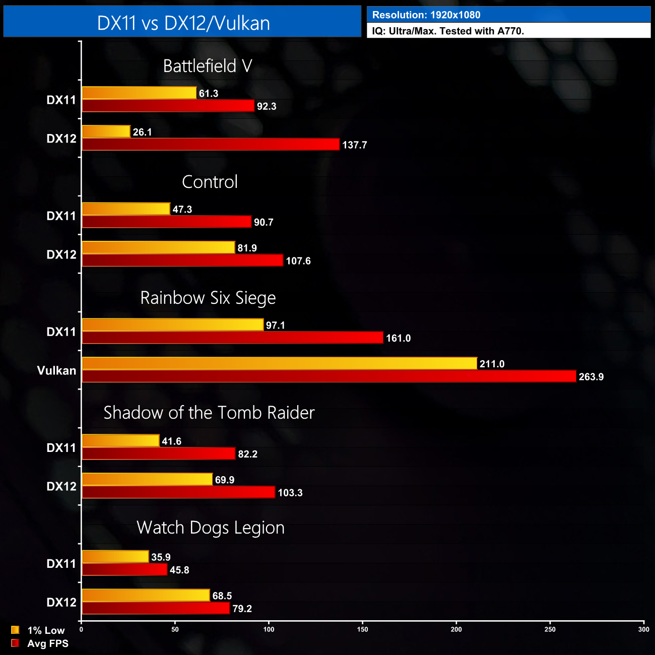Still, DX11 is generally much worse across the board. Some titles, like Control, see fairly similar average frame rates but with a huge reduction to 1% low performance when using DX11. Other games, such as Rainbow Six Siege, get significantly slower across the board.
