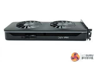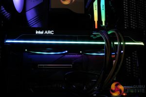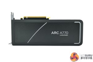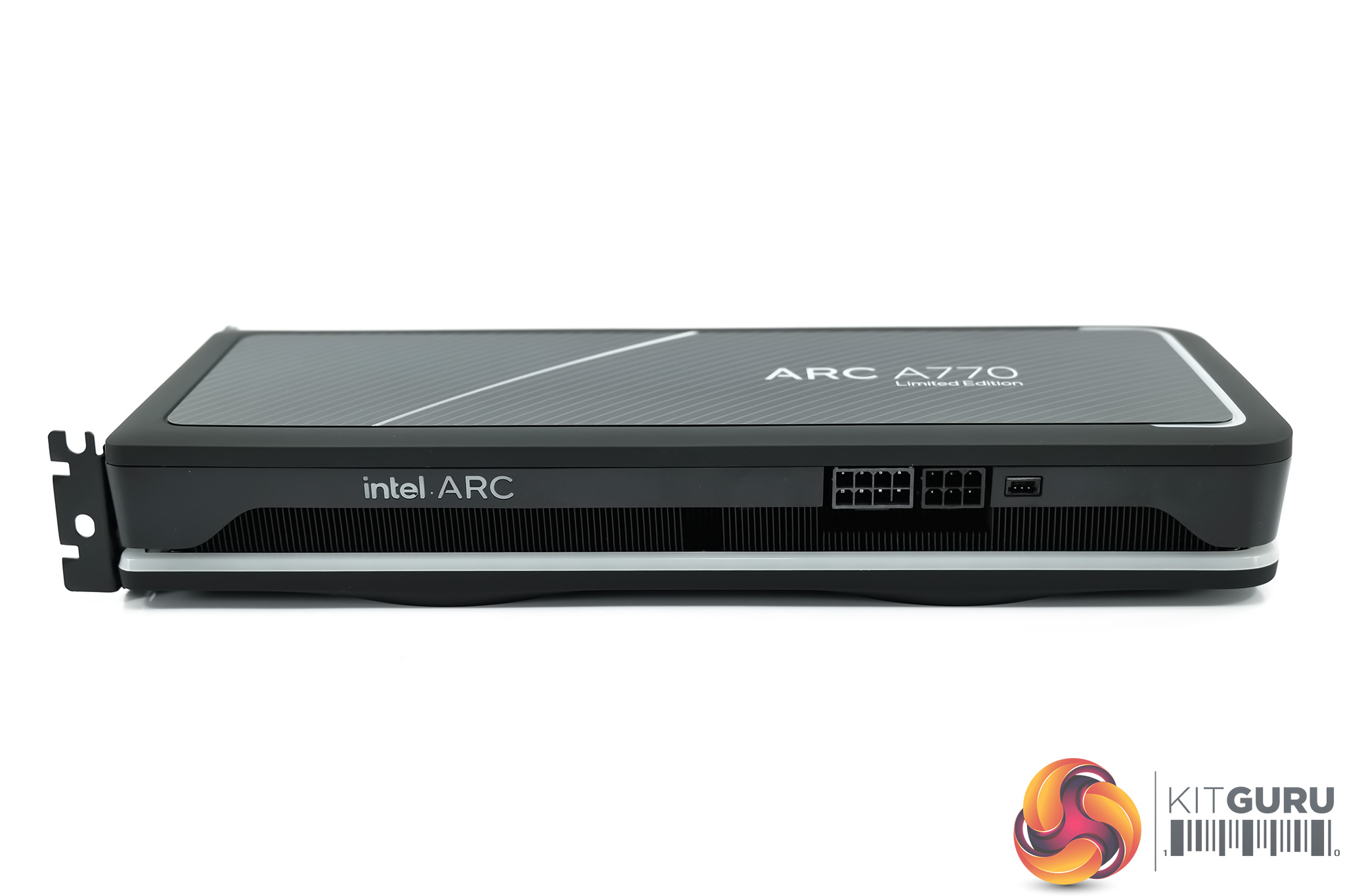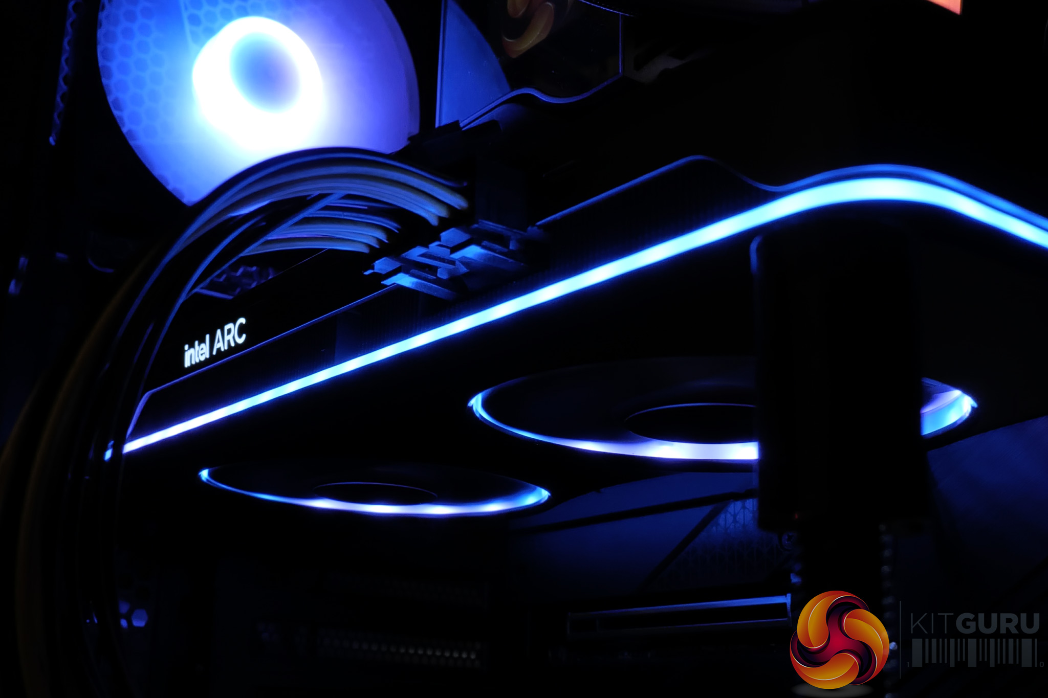 That's also true in terms of dimensions, as the Limited Edition is just 2-slots thick and a standard 10.5″, or 266.7mm, length. We can see the RGB lighting strip that runs the length of the card, with the fan rings, Intel Arc logo and backplate also acting as RGB zones.