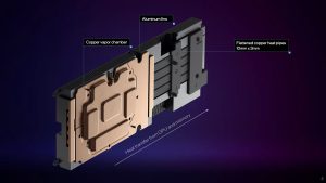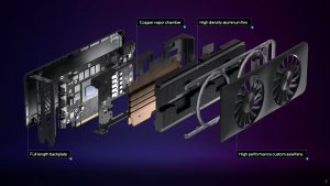 I've not yet disassembled the cards themselves but above we can see the renders supplied by Intel. The cards use a copper vapour chamber and aluminium fin stack, with a total of four flattened 10mm heat pipes. Air from the two fans blows down onto the cooler and escapes through the back and sides of the card.