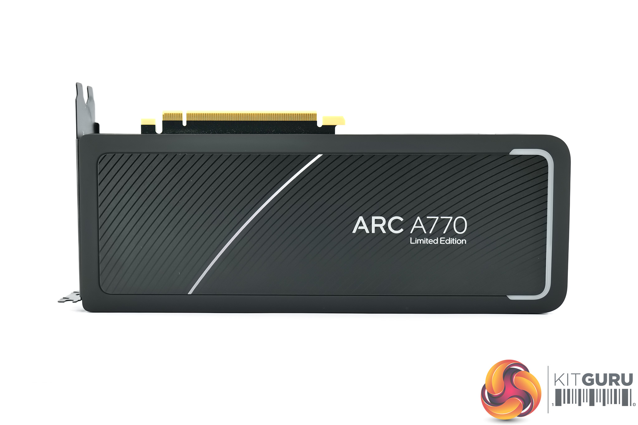The Intel Arc logo is visible on the front side of the card, while we also get a look at the rest of the front of the shroud. Intel's backplate design is also eye-catching, with a pin-stripe design. The backplate itself is made from plastic and doesn't feel particularly sturdy, but it certainly looks the part.