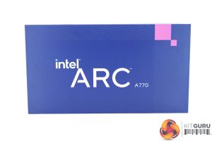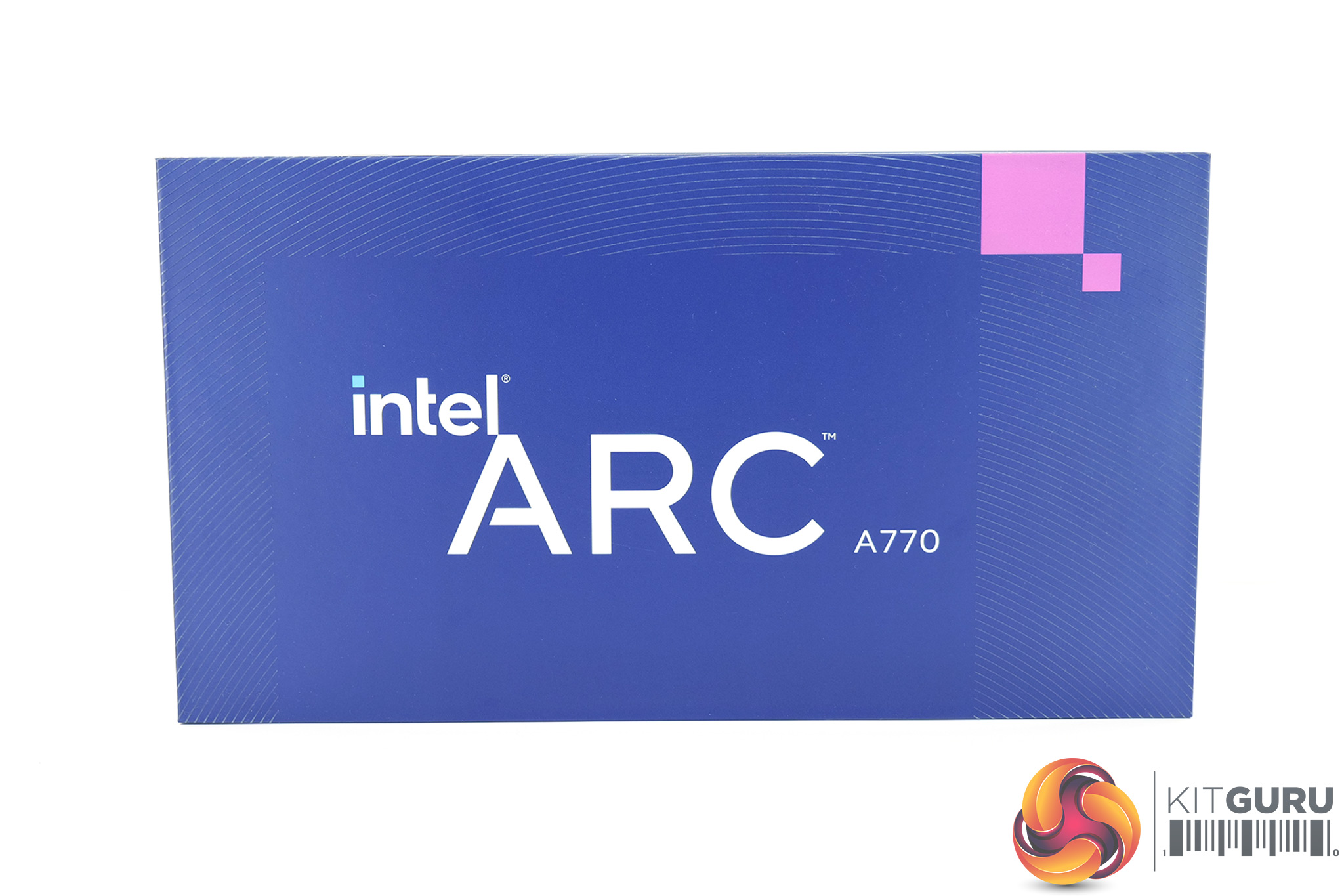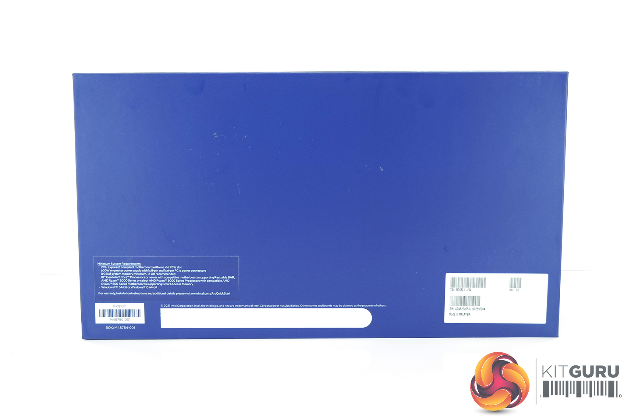 The Arc A750 Limited Edition ships in a compact blue box, with the Arc branding positioned prominently on the front. The back of the box is almost entirely plain, apart from a very small section of ‘minimum system requirements' in the bottom left corner.