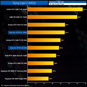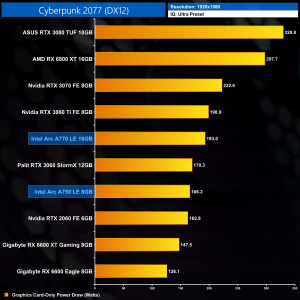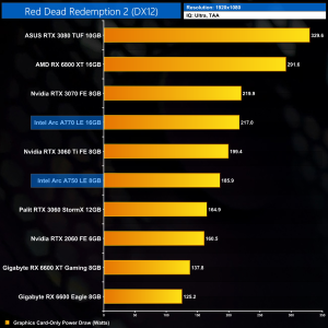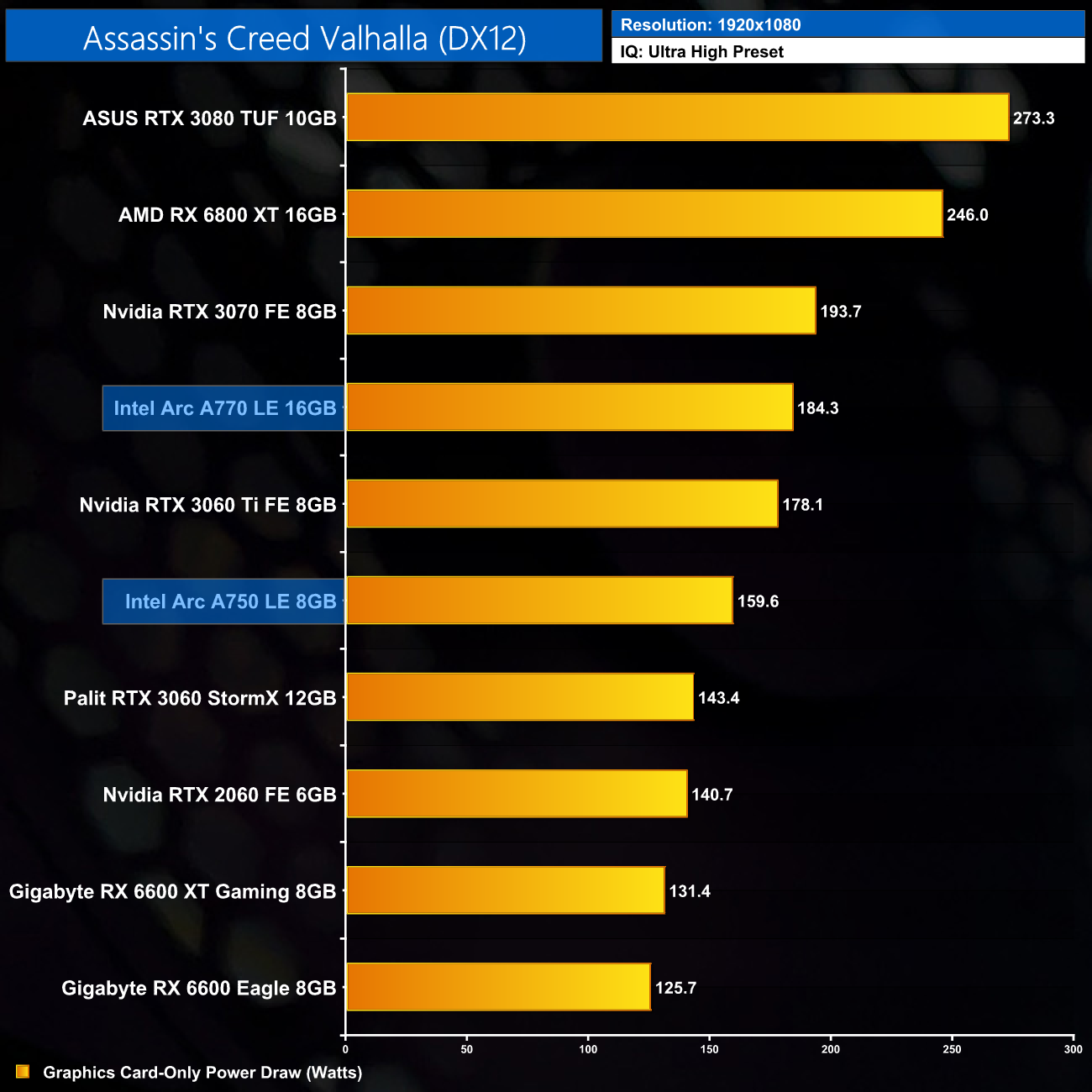 Power draw for the A770 isn't far off the rated 225W figure. It does vary from game to game, as you can see above, but we see an average power draw of 208.2W at 1080p.