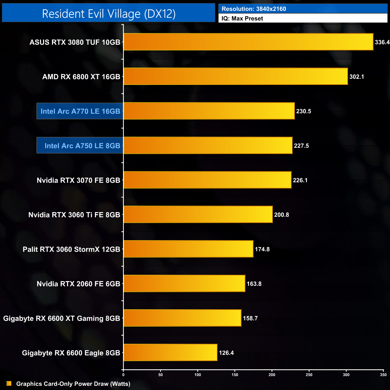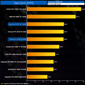 Lastly, 4K power draw is fairly consistent across the board, with the A770 drawing an average of 227.6W over the ten games we tested.