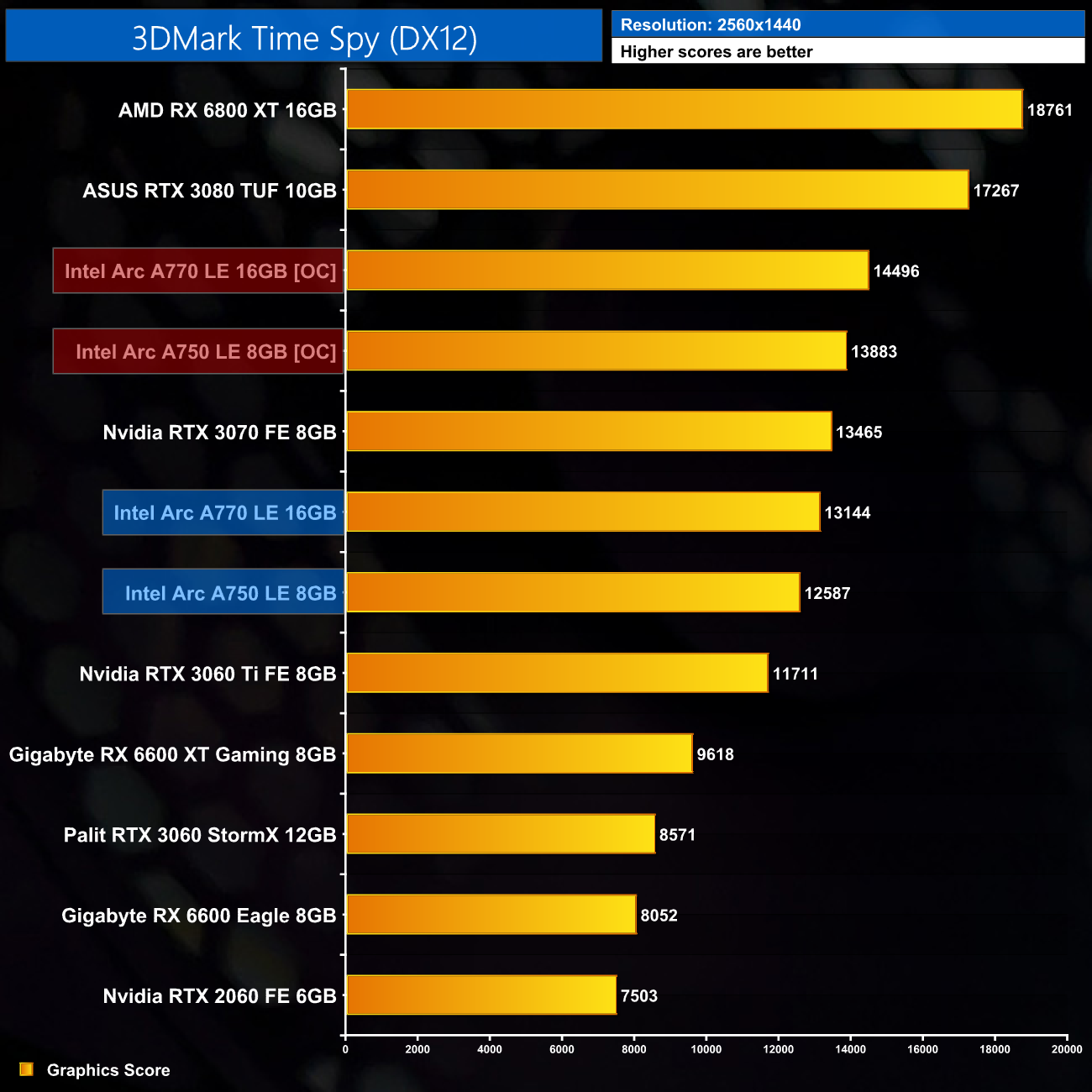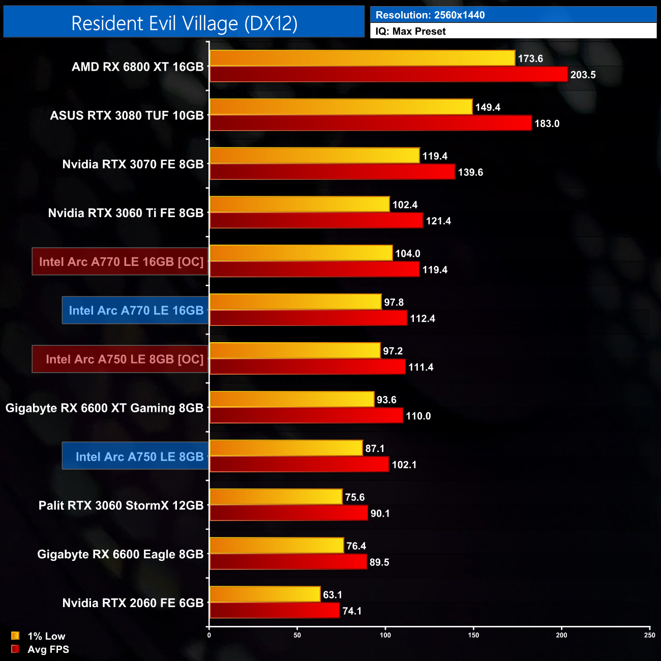 This overclock resulted in a 10% boost to the Time Spy GPU score. Resident Evil Village didn't scale as well, but we still observed a 7% increase in the average frame rate, which is better than nothing.