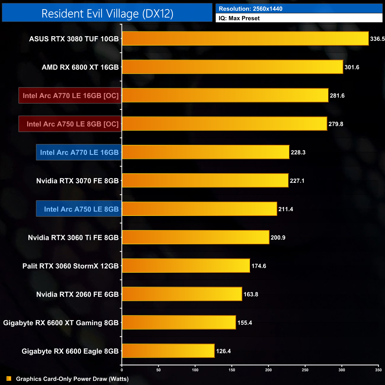 Power draw did increase while overclocked, averaging just over 280W, further reducing the A770's performance per Watt.