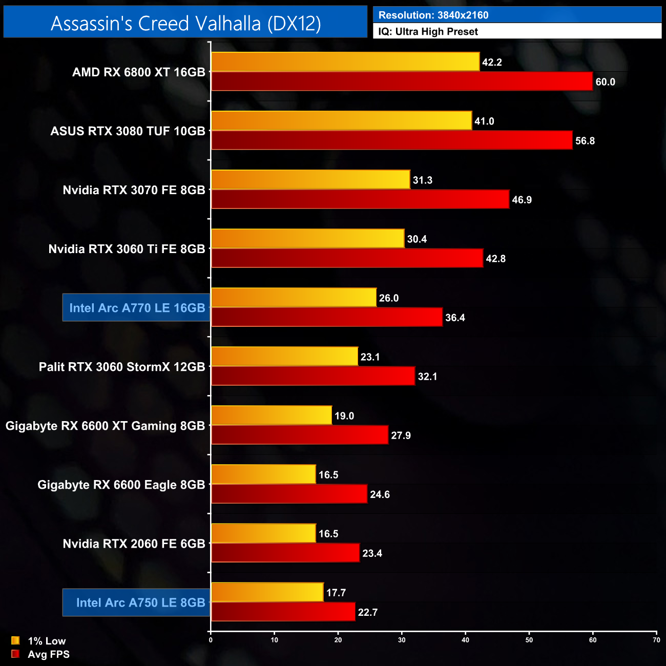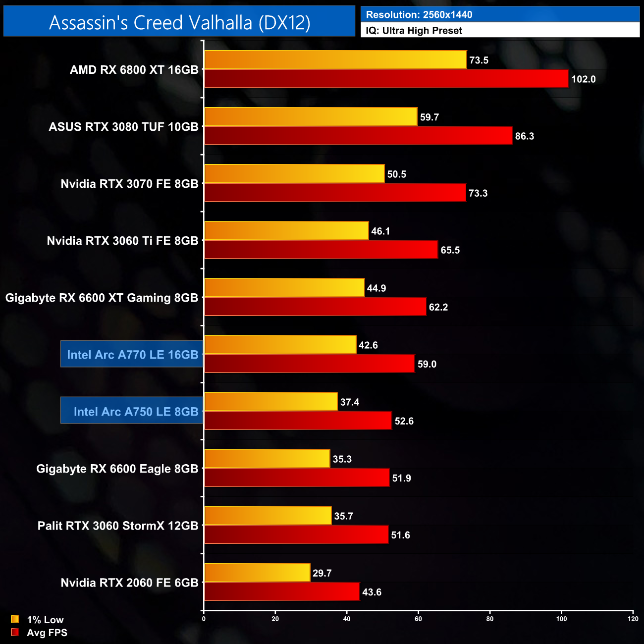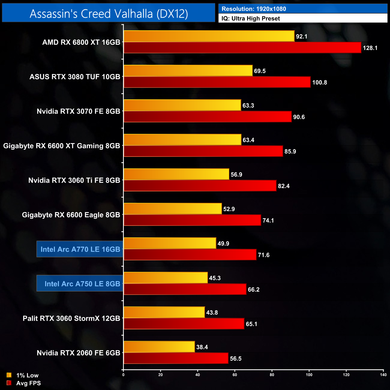 Assassin's Creed Valhalla gets us up and running with the gaming benchmarks, with the A770 delivering 72FPS on average at 1080p. It's 10% faster than the RTX 3060 here, but still lags significantly behind the RX 6600 XT. At 1440p, it closes the gap on the 6600 XT to just 5%, while it is also 14% faster than the RTX 3060.
