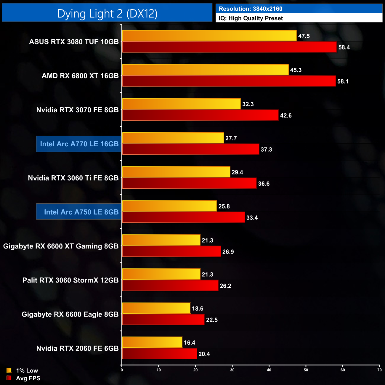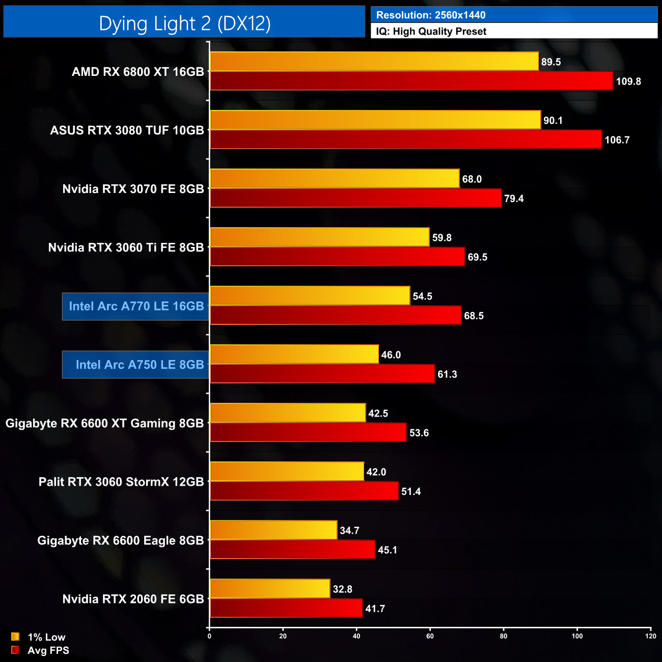 Dying Light 2 represents a huge win for the Intel Arc GPUs. At 1080p we see a crushing 27% performance advantage over the RTX 3060, while the A770 is 17% faster than the RX 6600 XT as well. At 1440p, both of those margins improve further, with the A770 now outperforming the RTX 3060 by 33%, and the 6600 XT by 28%. It's breathing right down the neck of the RTX 3060 Ti in both instances, which is highly impressive stuff.