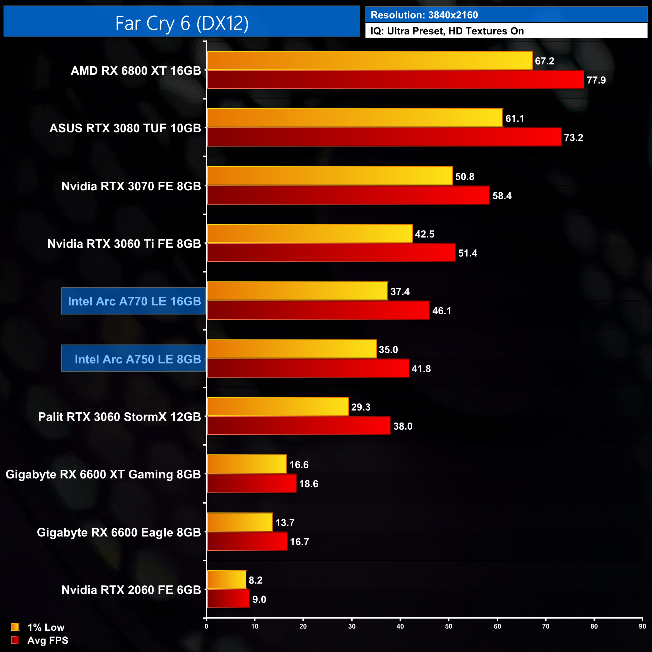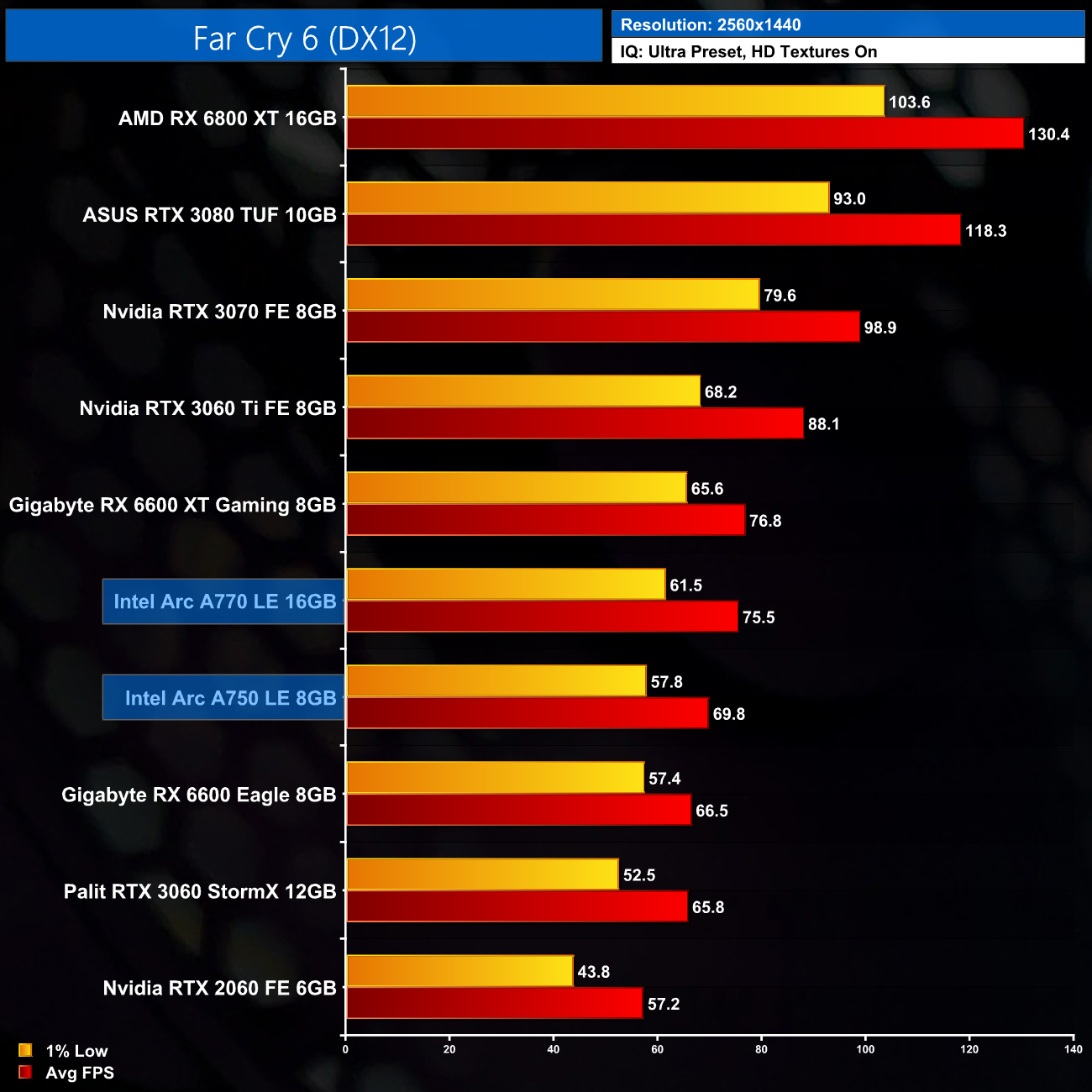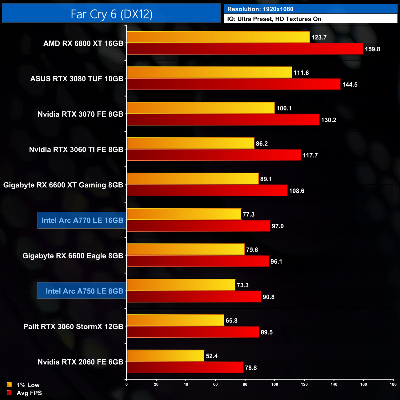 As for Far Cry 6, this isn't quite so jaw-dropping as Dying Light 2 but the A770 still does well. It manages to deliver 97FPS on average, putting it 8% ahead of the RTX 3060 at 1080p, though it's 11% slower than the RX 6600 XT. At 1440p, it's now 15% faster than the 3060 and only 2% behind the 6600 XT, so we can see how Arc scales better at the higher resolution.