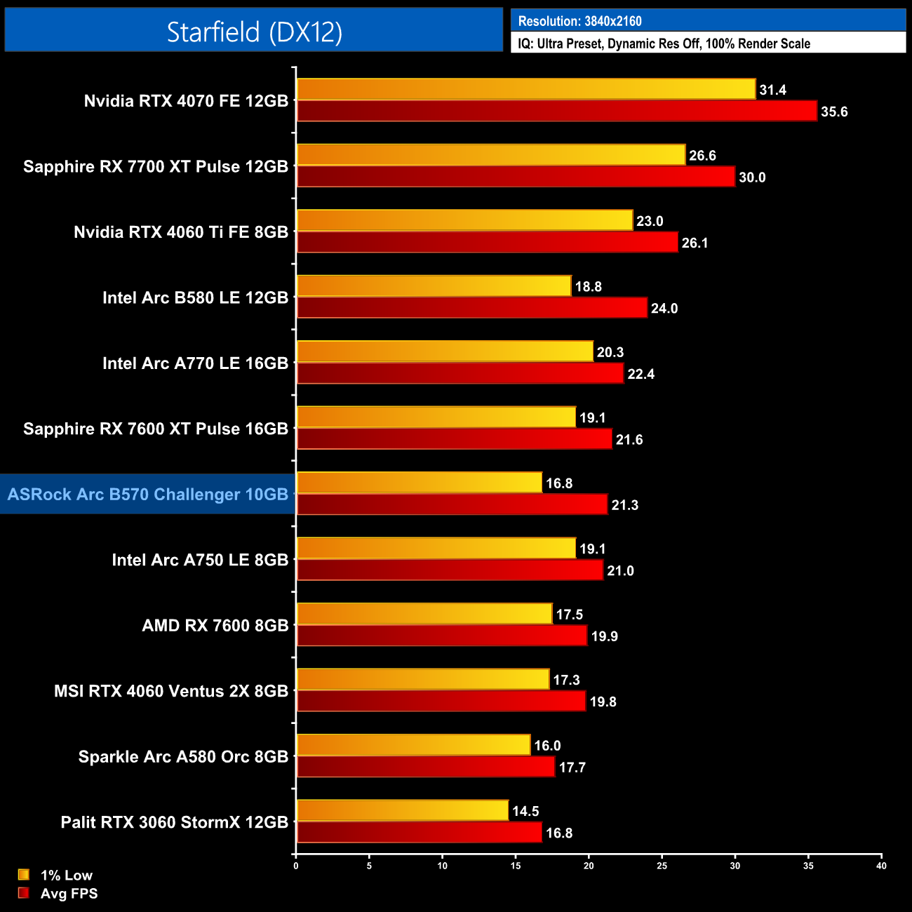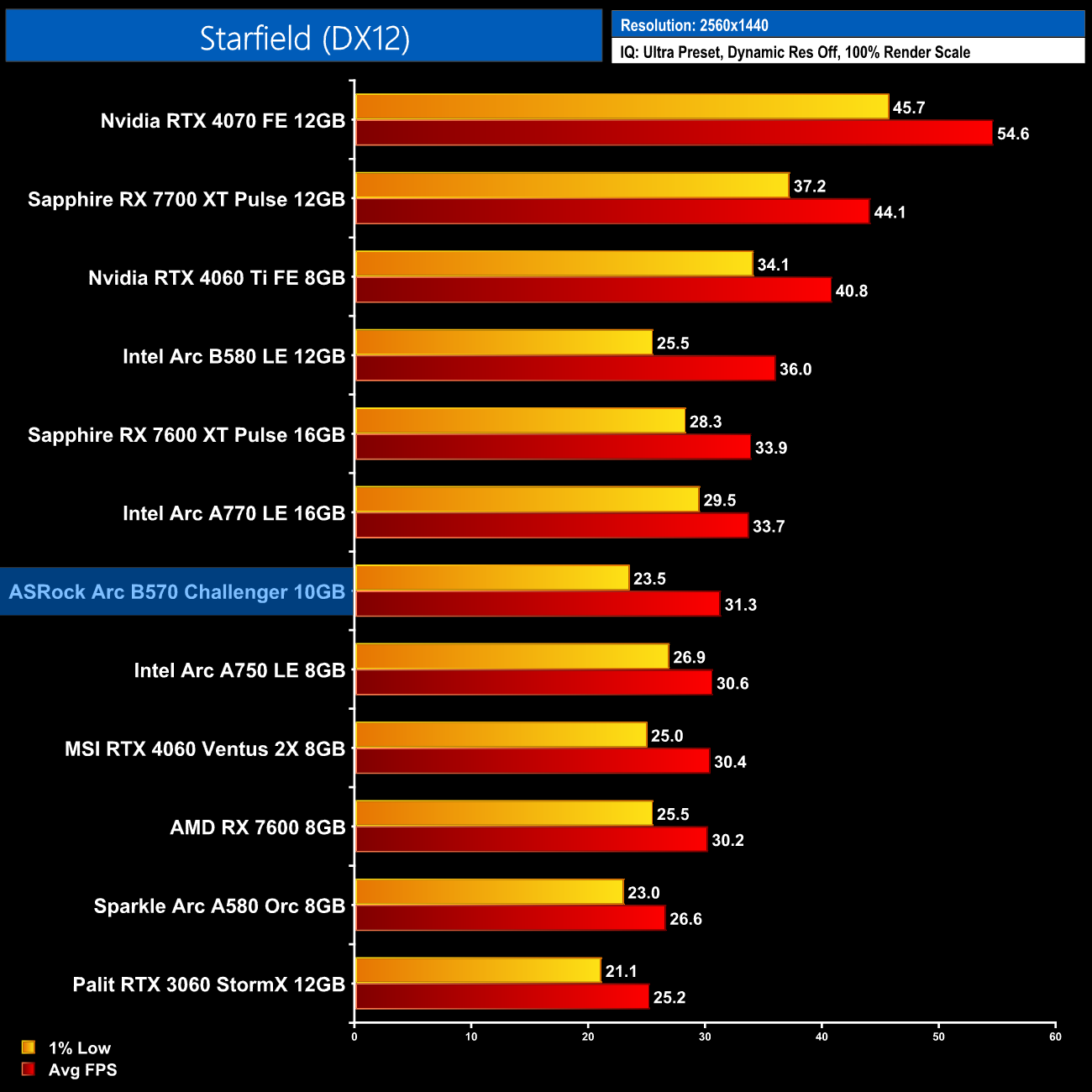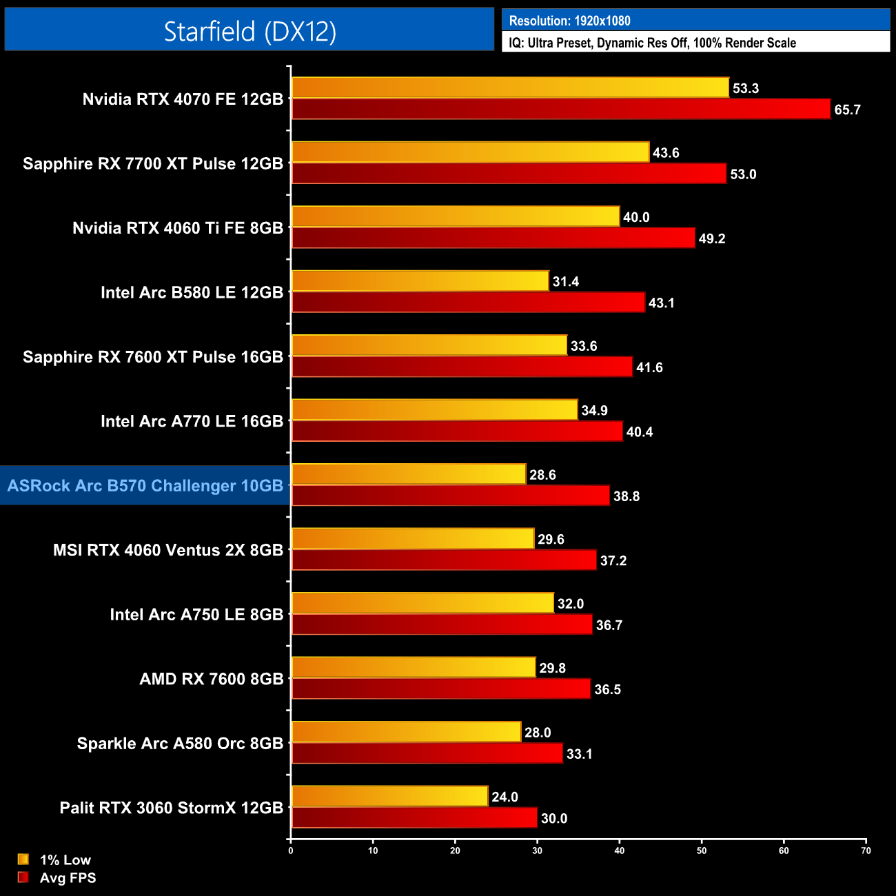 Starfield is next, and in terms of averages, the B570 does relatively well, coming in ahead of both the RTX 4060 and RX 7600 by single-digit margins. The 1% lows are more of a struggle however, coming in worse than either of those two GPUs, which isn't an issue we can see with Intel's Alchemist GPUs, so some work could be done to improve things here.
