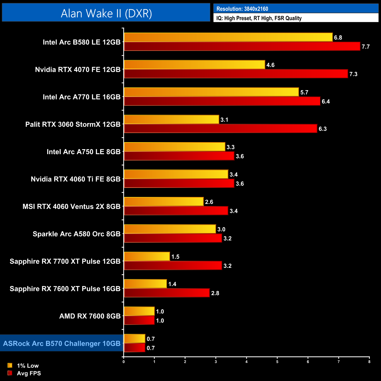 As for ray tracing, we start with Alan Wake 2, and even with quality upscaling you're not going to be enabling the High preset here – it's just too much for this class of GPU to handle, with the B570 barely hitting 20fps on average.