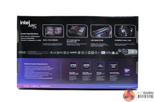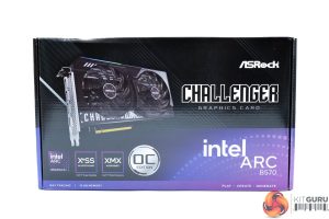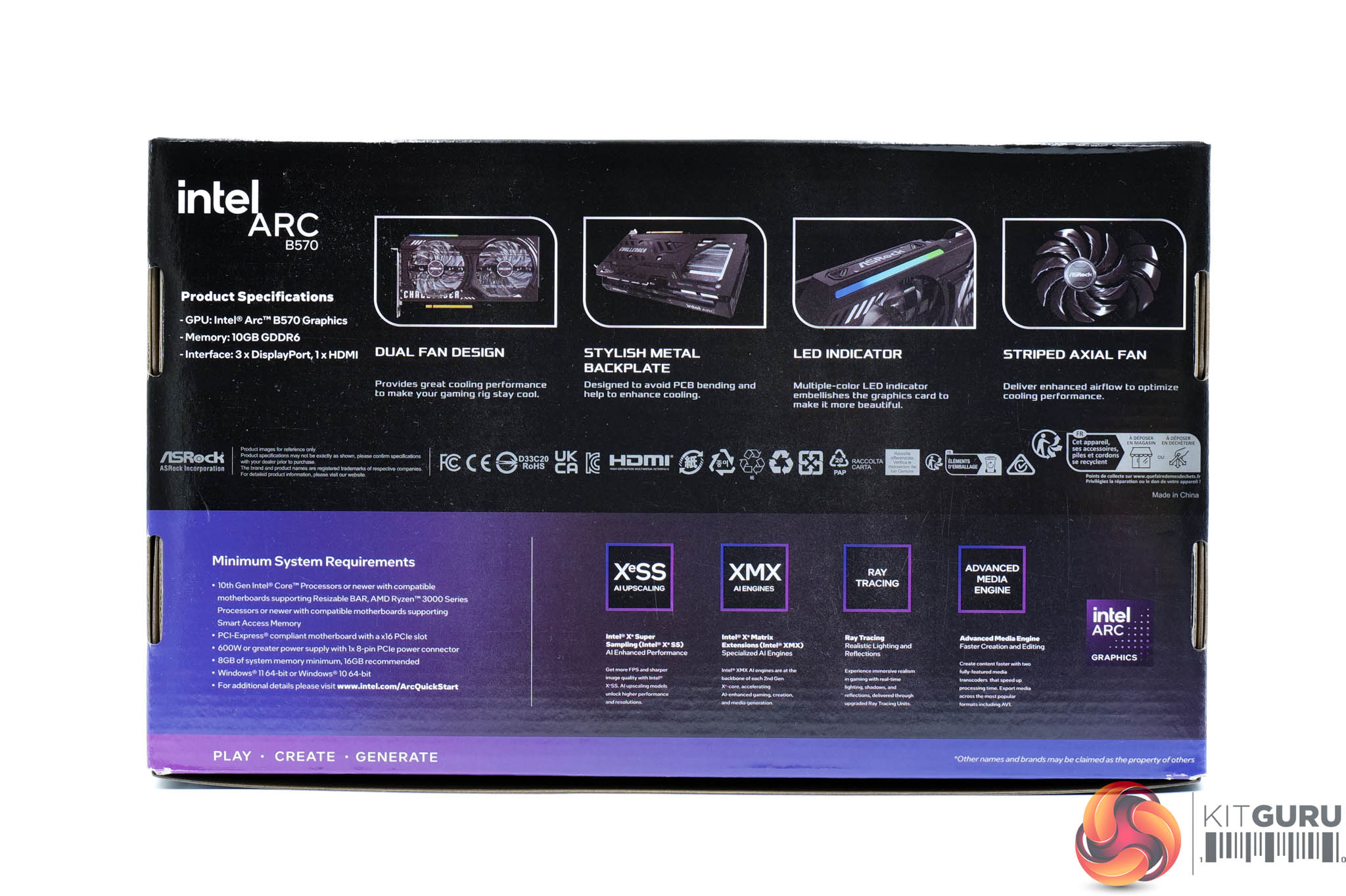 The ASRock Arc B570 Challenger ships in a mostly black box, but with the Arc branding in the bottom right corner giving us a splash of colour. On the back, ASRock highlights various key features of the card itself.