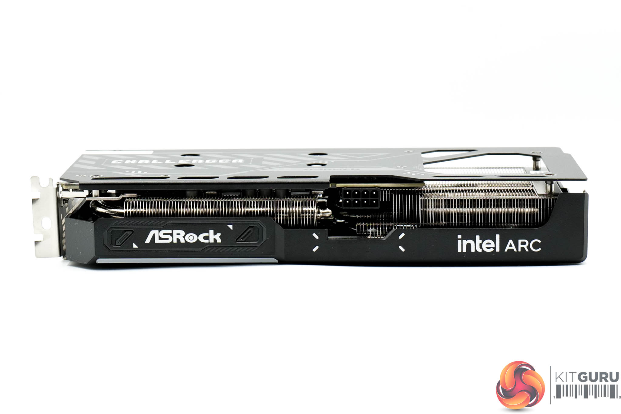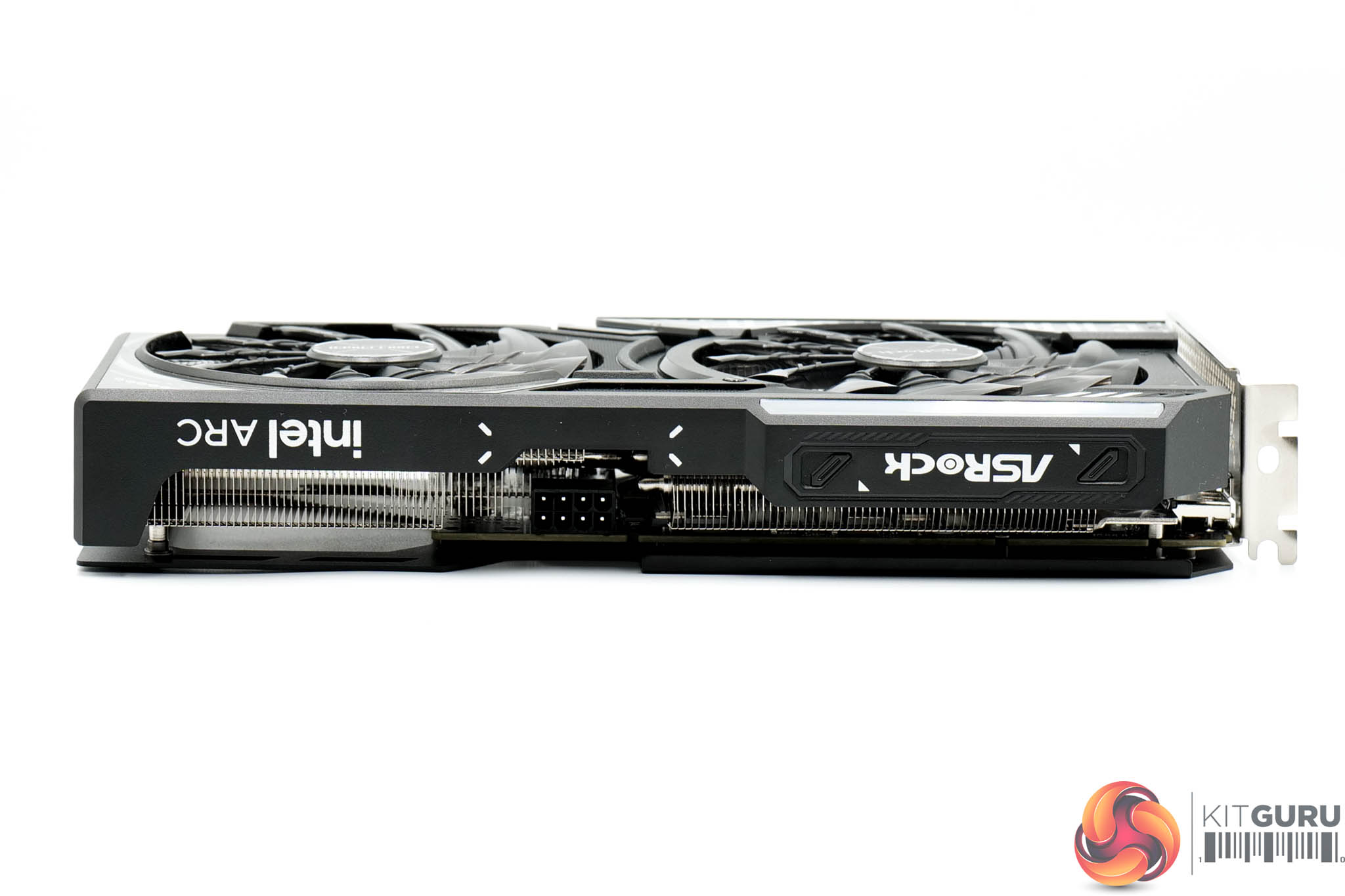 The front side of the card is home to the ASRock and Intel Arc logos, plus there's a small blue/green LED strip which you can see in our video review.