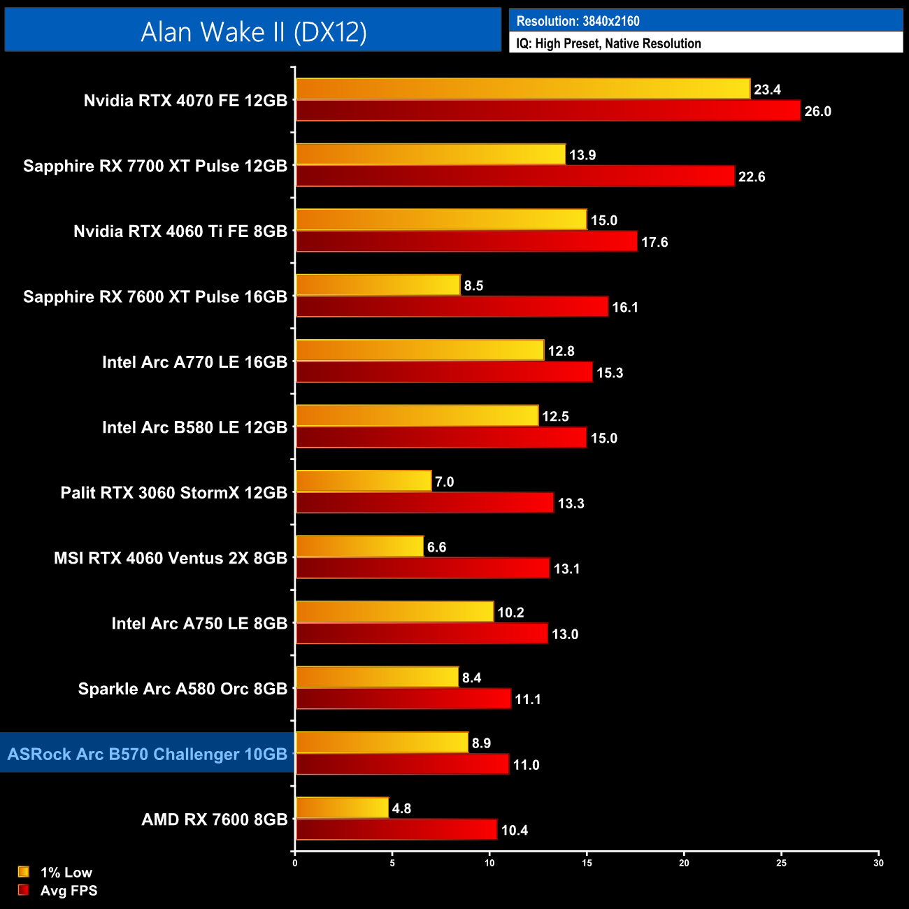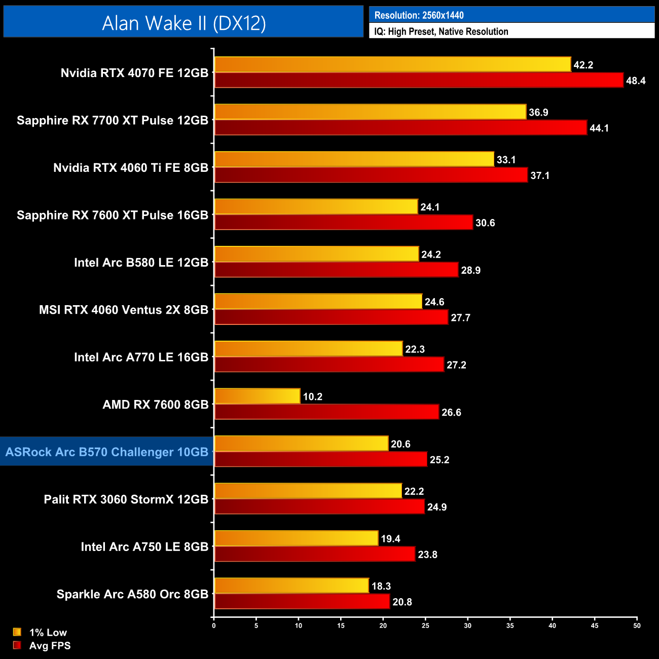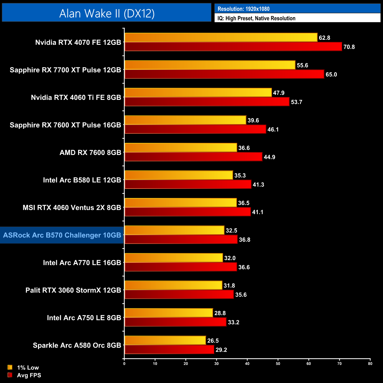 Kicking off with Alan Wake 2, at 1080p the B570 delivers 37fps using the High preset, making it 11% slower than both the B580 and RTX 4060. It's also dead level with the Arc A770, and just a frame faster than the RTX 3060 12GB.
