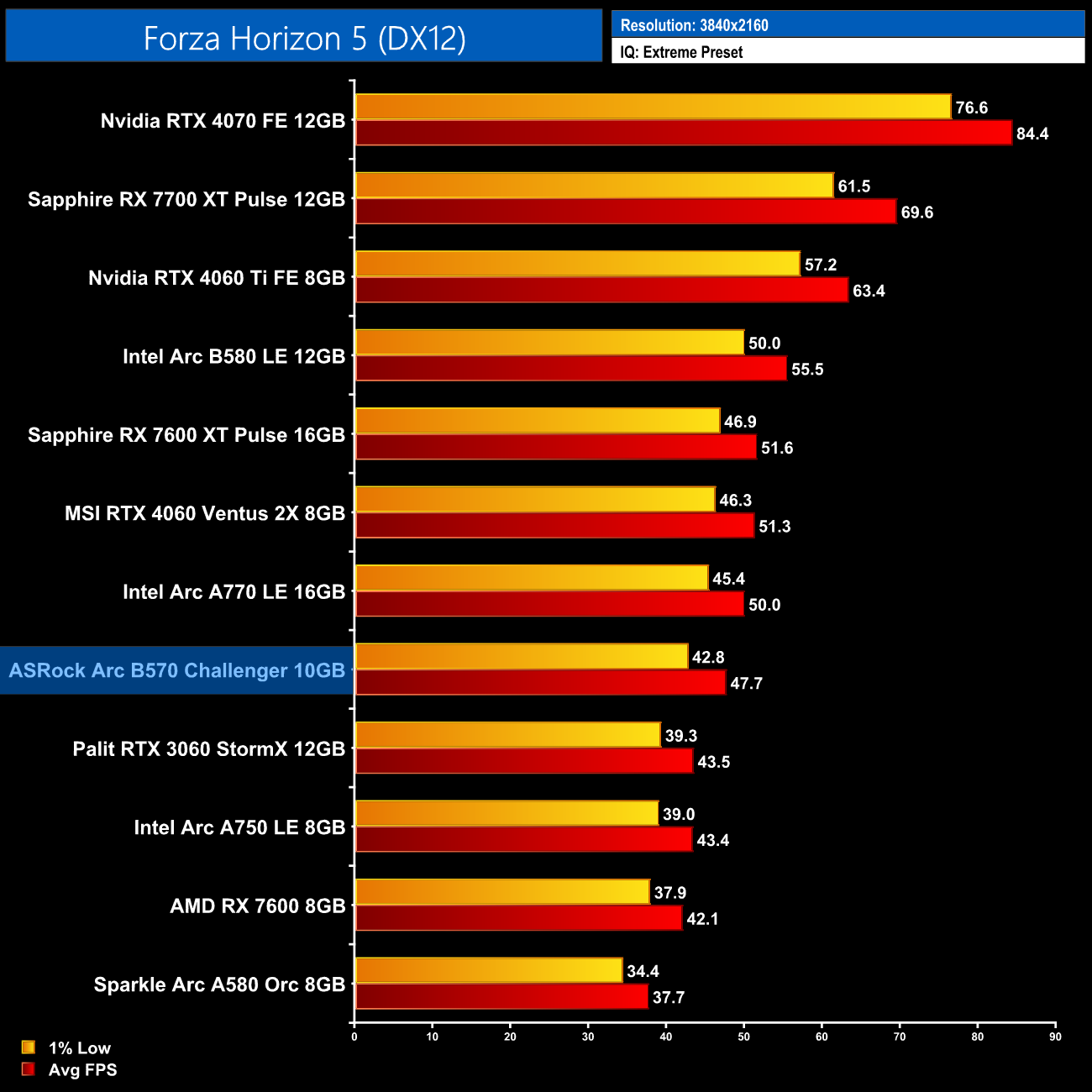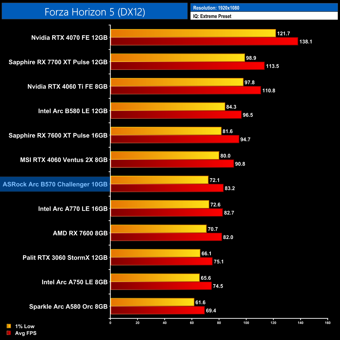 Forza Horizon 5 is next and this is such a well optimised title, it is no surprise to see the B570 hitting 83fps at 1080p Extreme settings, putting it level with the A770 and RX 7600. It's 14% behind the B580, and only 8% slower than the RTX 4060.