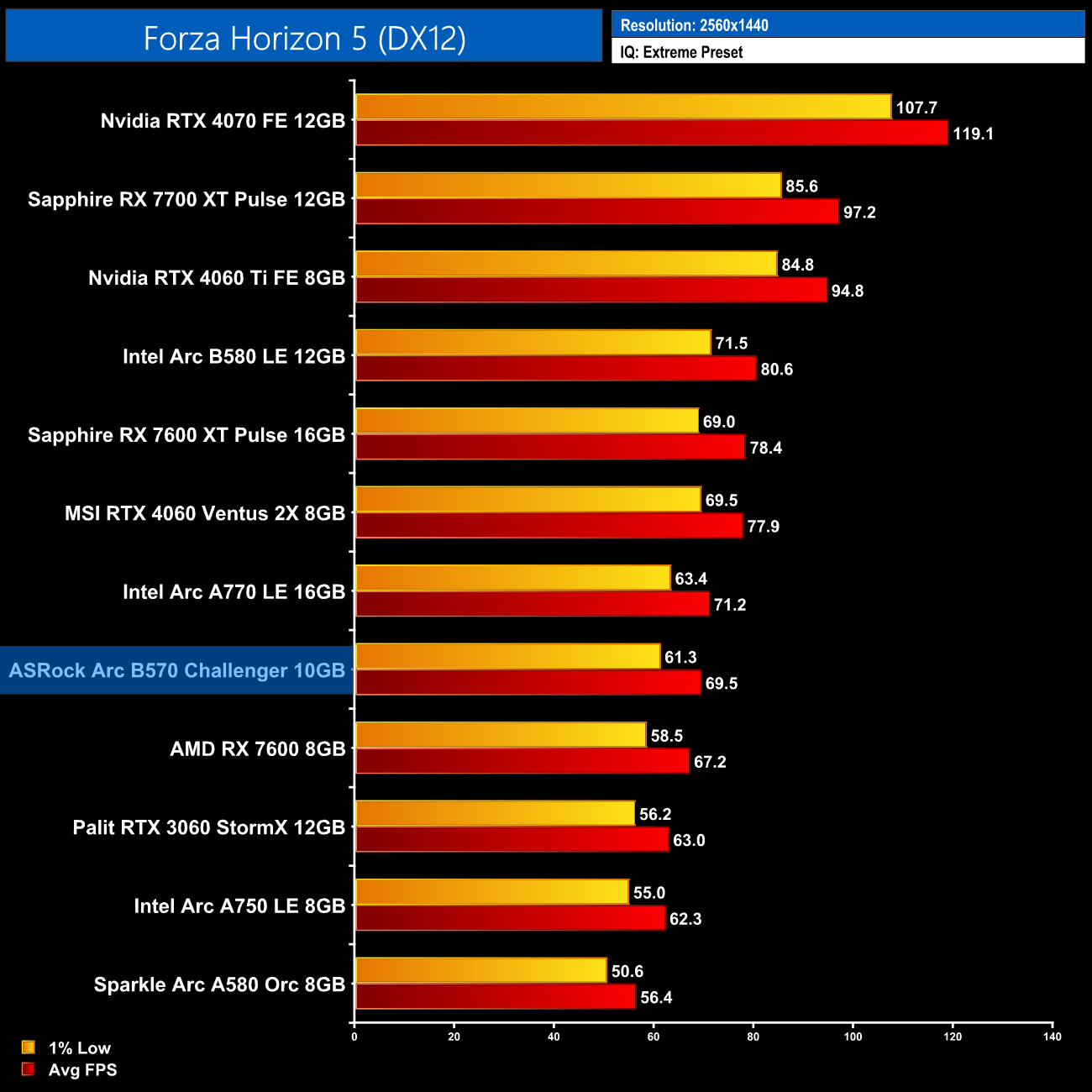 1440p is no problem either, this time averaging 70fps, once again sandwiching the B570 between the A770 and the RX 7600.