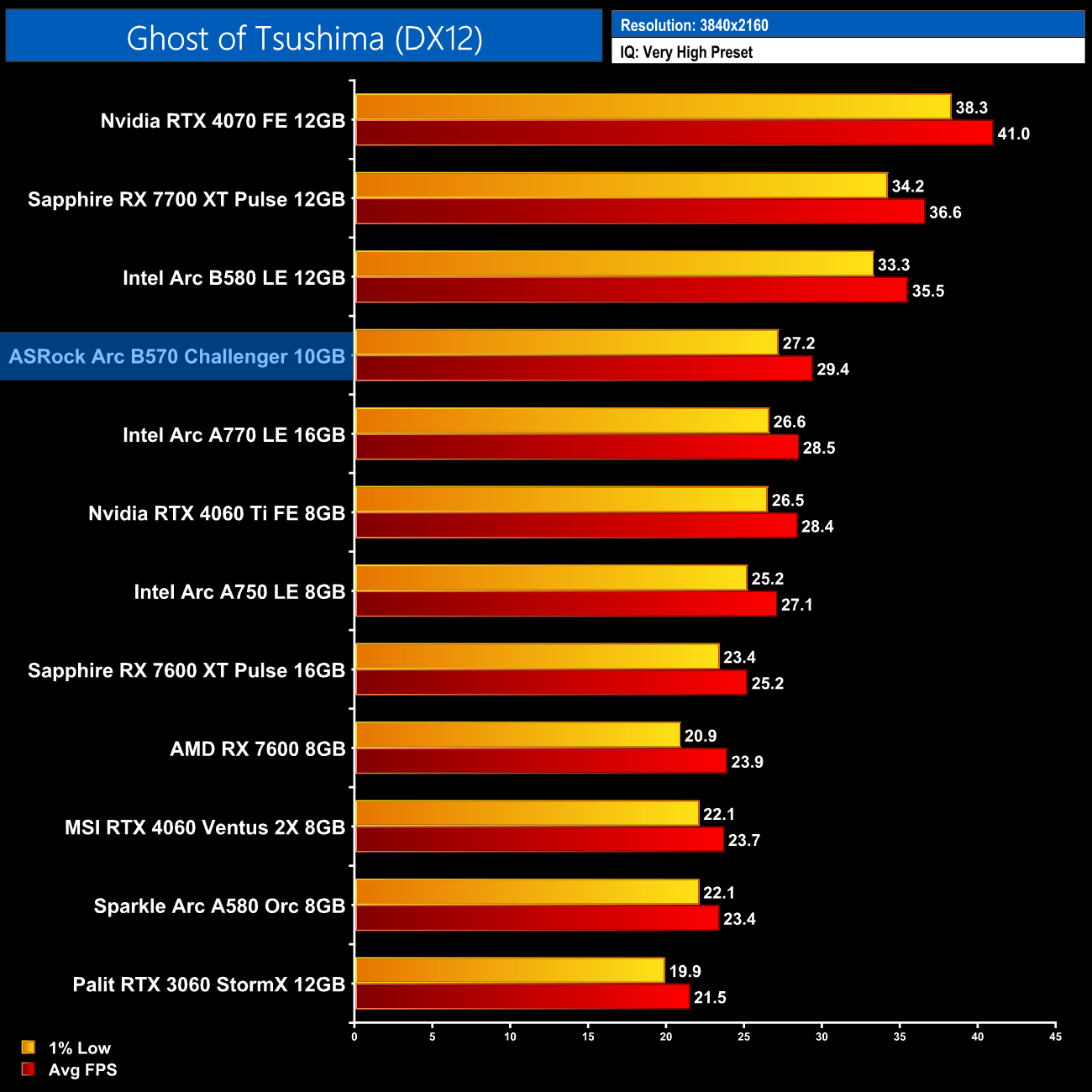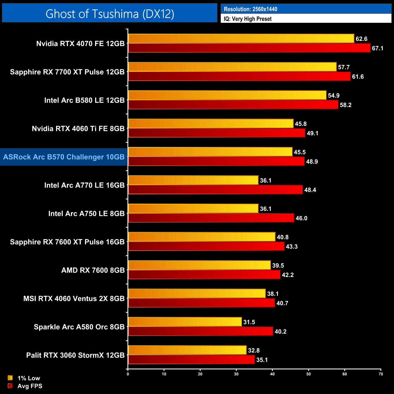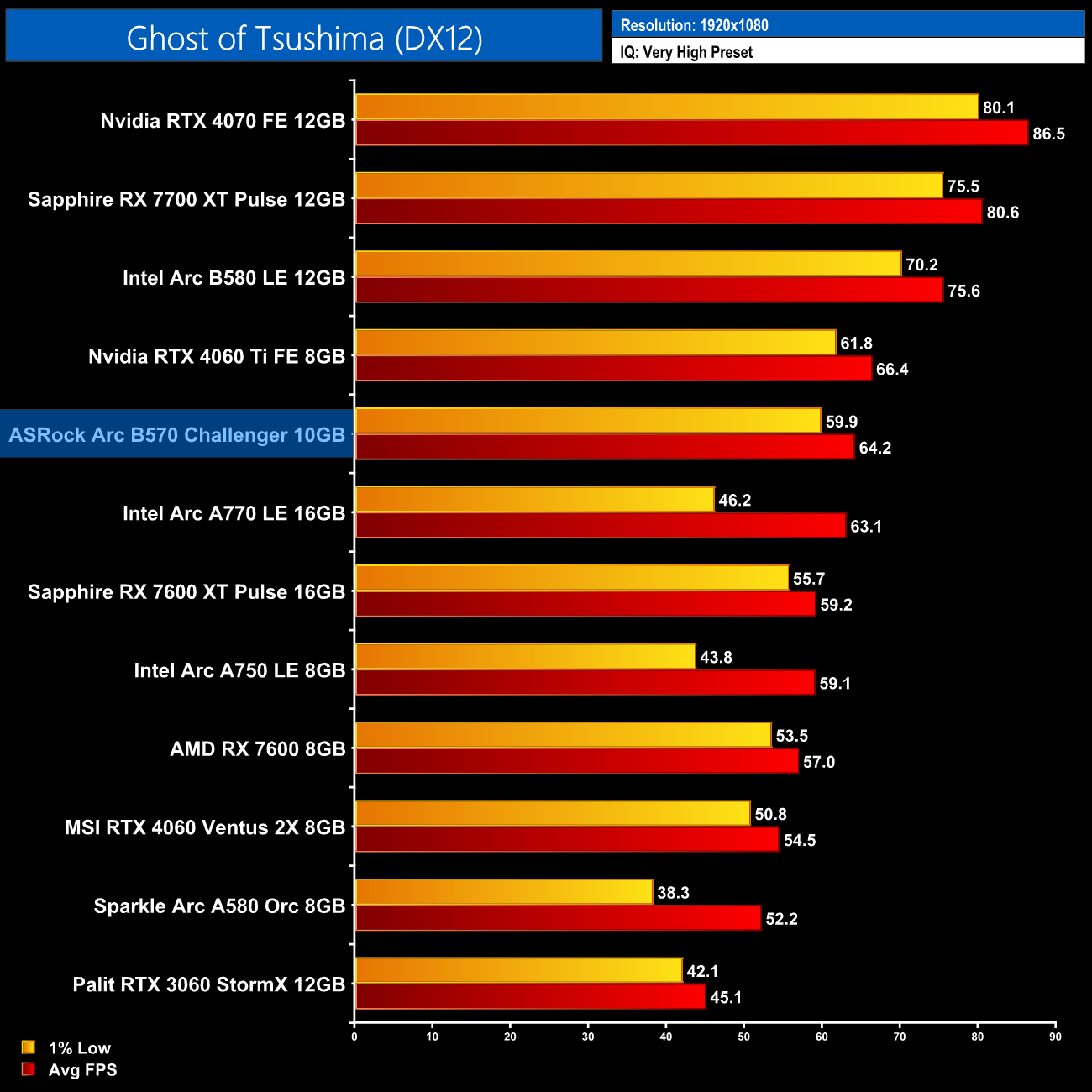 Ghost of Tsushima is another title that runs very well on Battlemage – at least, after the initial stuttering issues were fixed last month! At 1080p the B570 hits 64fps on average, putting it just behind the RTX 4060 Ti no less – a hugely impressive result considering the price difference.