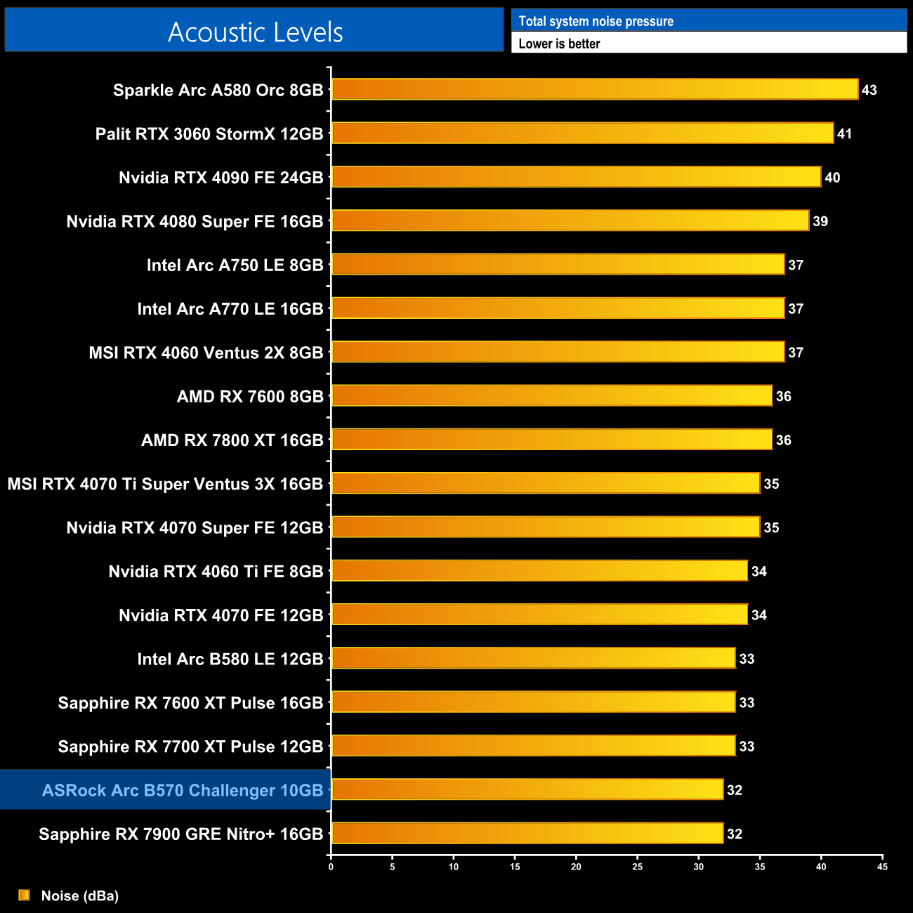 We take our noise measurements with the sound meter positioned 1 foot from the graphics card. I measured the noise floor to be 32 dBA, thus anything above this level can be attributed to the graphics cards. The power supply is passive for the entire power output range we tested all graphics cards in, while all CPU and system fans were disabled. A reading under load comes from running A Plague Tale: Requiem for 30 minutes.