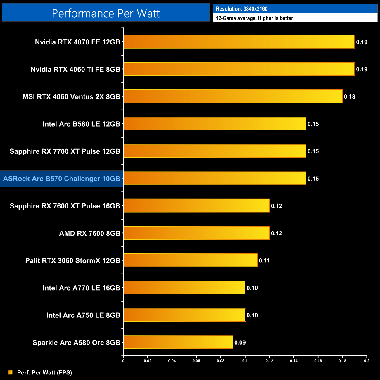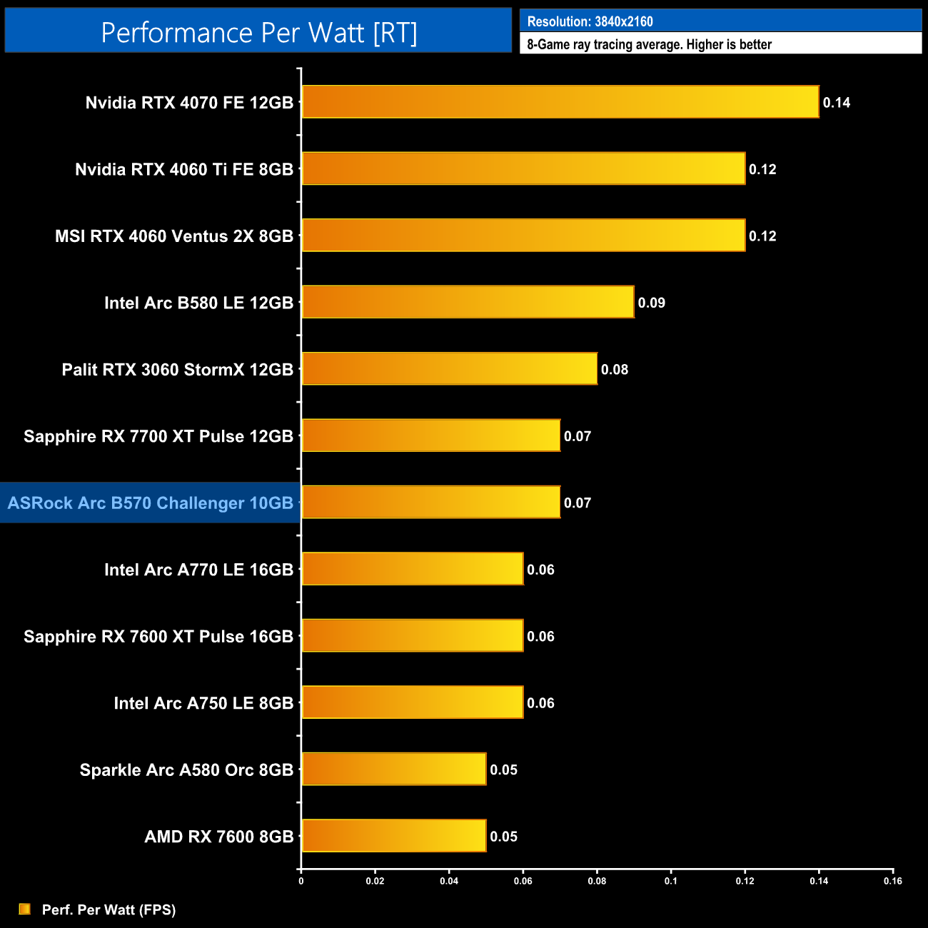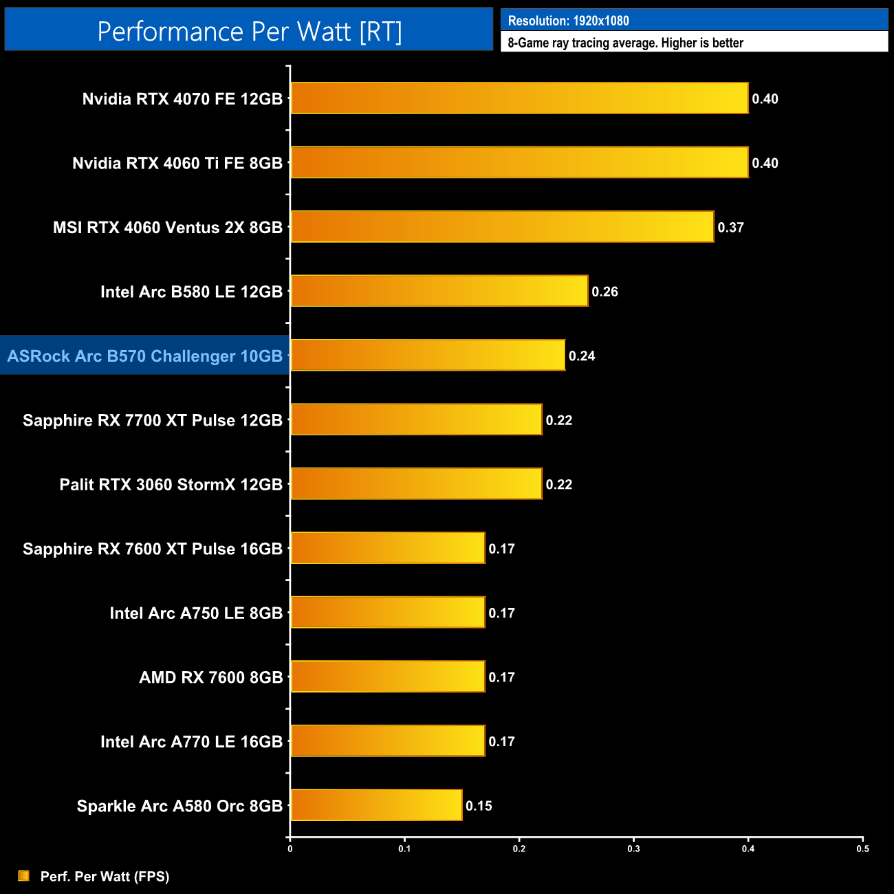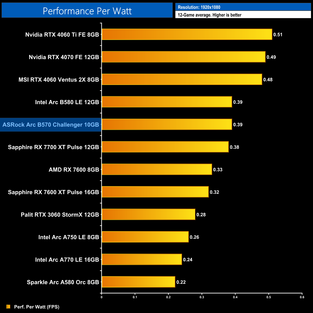 Now we're looking at performance per Watt, a simple calculation where we divide frame rate by the power draw for each game, and then present the average result here. The B570 is just as efficient as the B580, putting it on a similar level to the RX 7700 XT. It's a good step up from the Alchemist series, delivering exactly 50% more performance per Watt compared to the A750, but it does lag behind Nvidia and the RTX 40-series.
