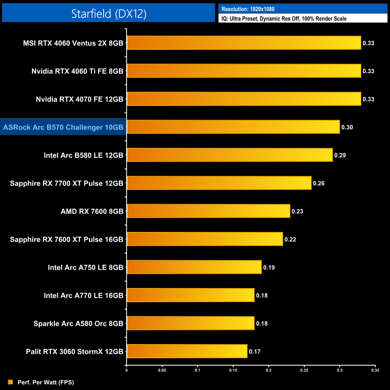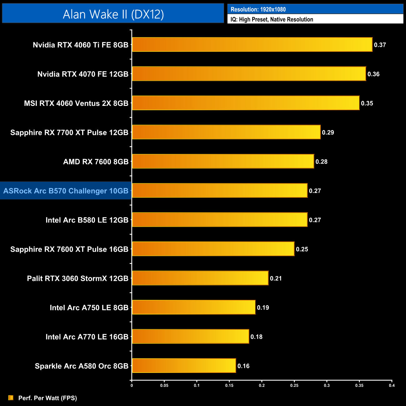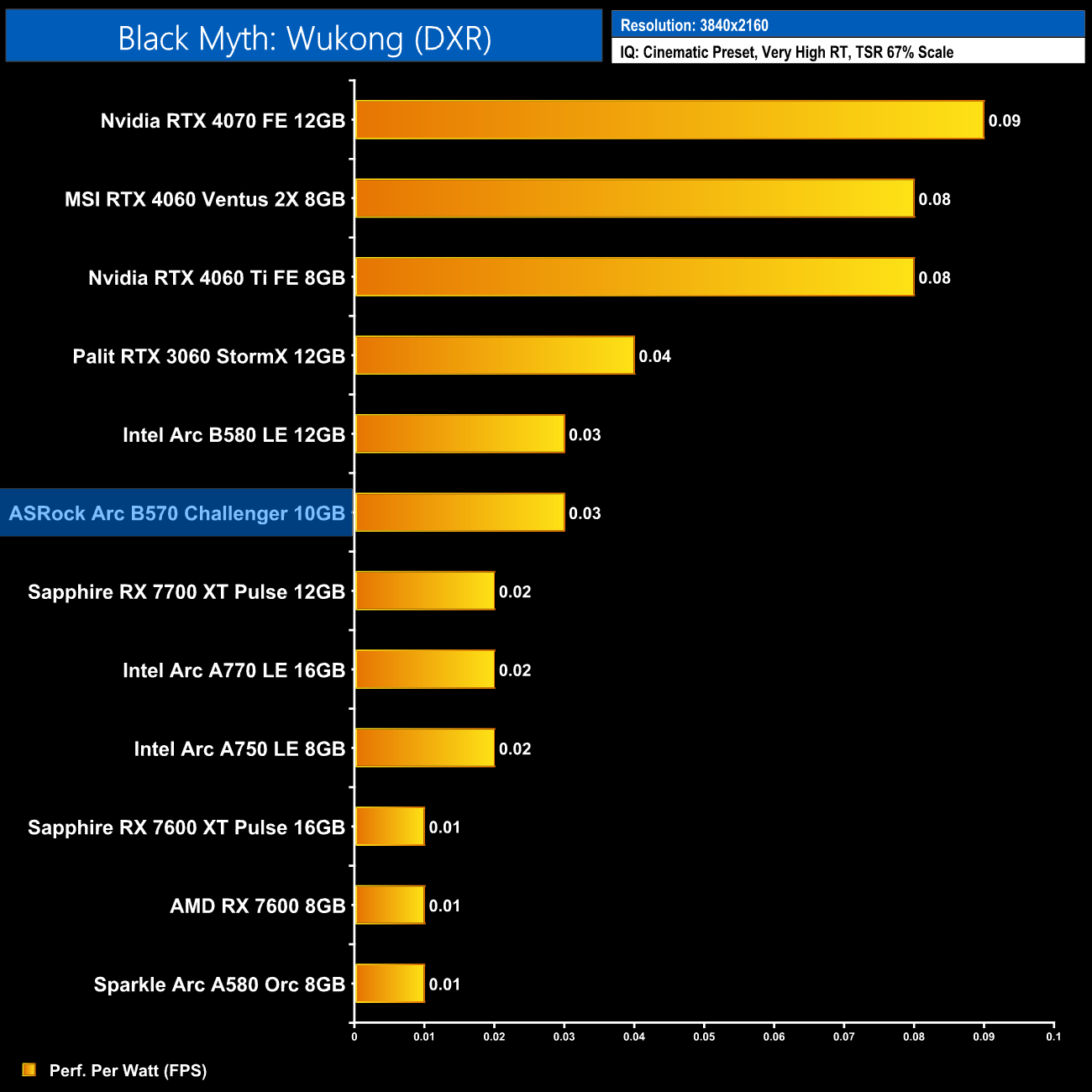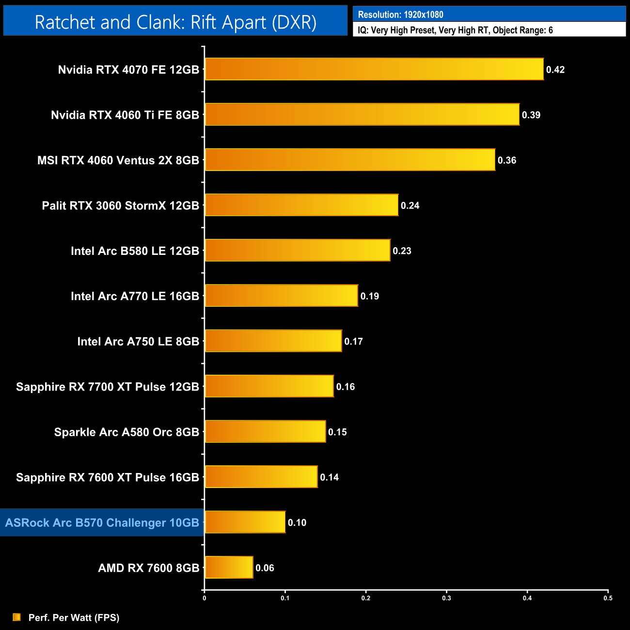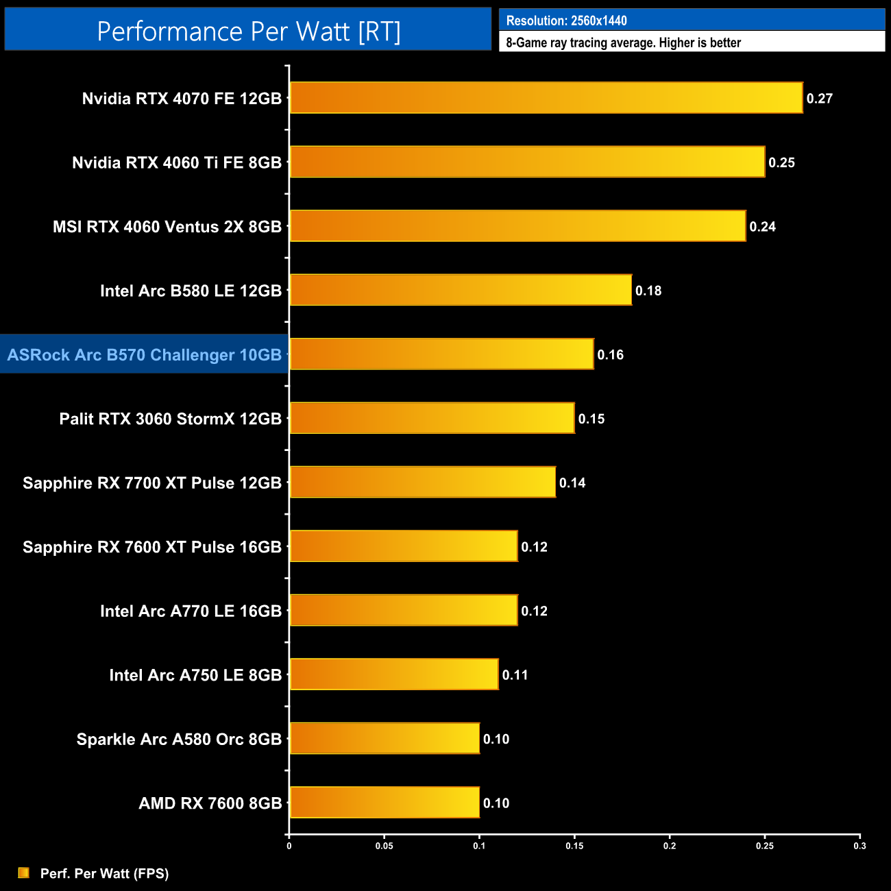 Now we're looking at performance per Watt, a simple calculation where we divide frame rate by the power draw for each game, and then present the average result here. The B570 is just as efficient as the B580, putting it on a similar level to the RX 7700 XT. It's a good step up from the Alchemist series, delivering exactly 50% more performance per Watt compared to the A750, but it does lag behind Nvidia and the RTX 40-series.