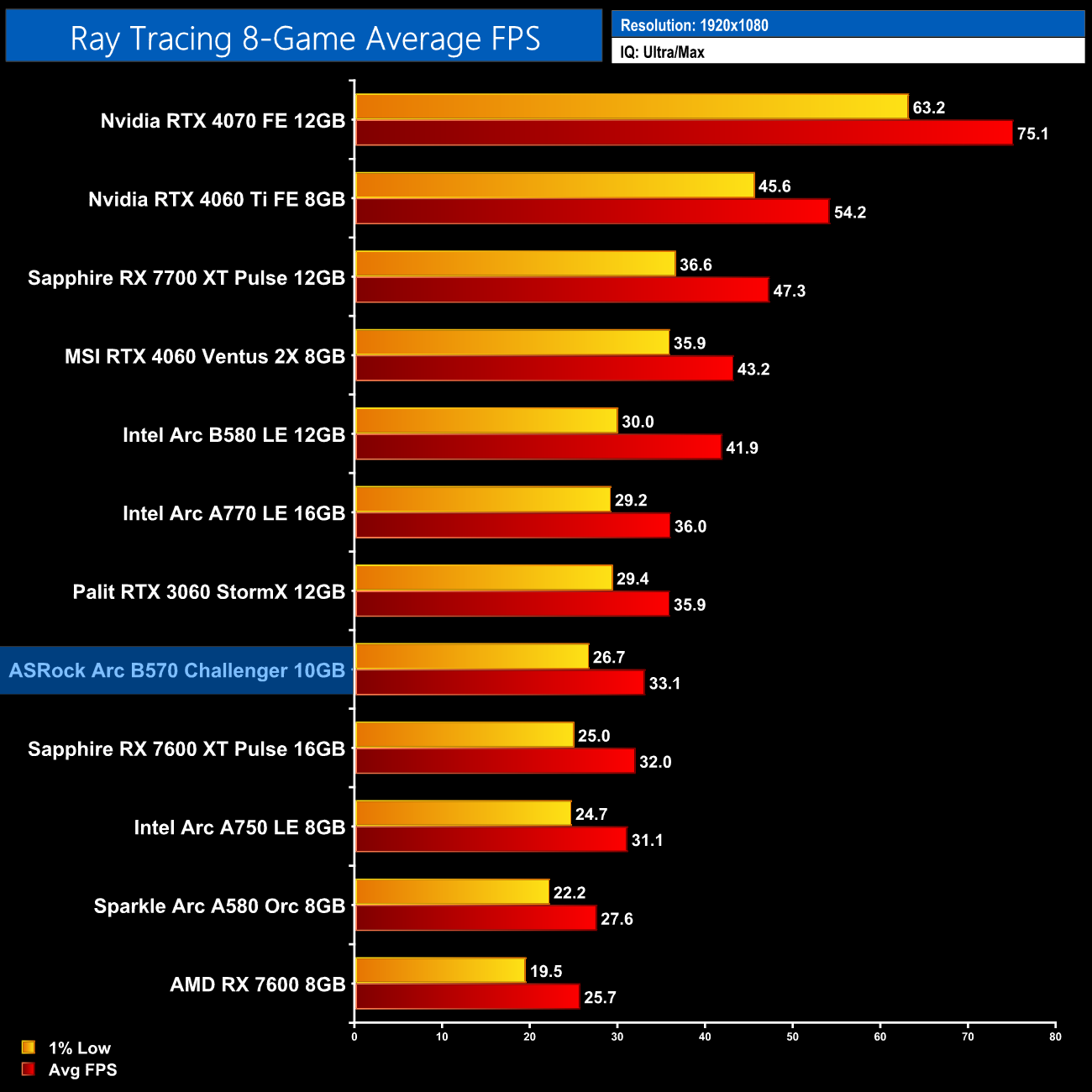 Over the twelve games we tested, the Arc B570 managed an average frame rate of 51fps at 1080p. That makes it 13% slower than the B580, 5% behind the RTX 4060, but dead level with the RX 7600. It's also a hair faster than the A770, and it's 12% faster than the RTX 3060 12GB.