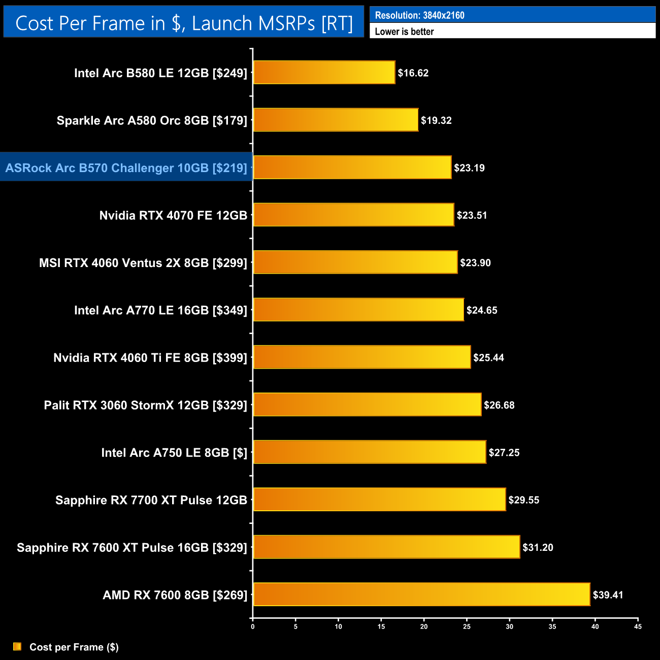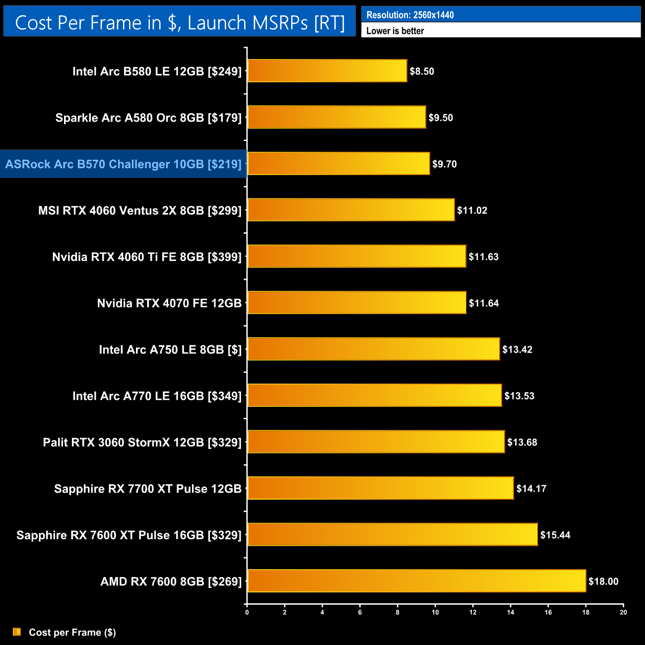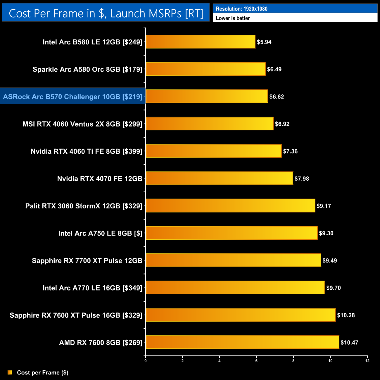 A quick look at ray tracing cost per frame shows the B570 is certainly competitive, but it can't match the B580 here which really is quite the performer when it comes to ray traced games.