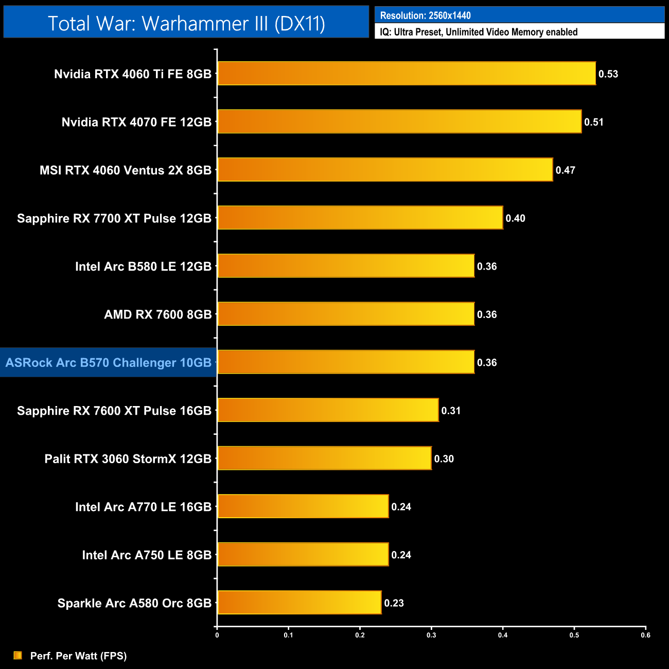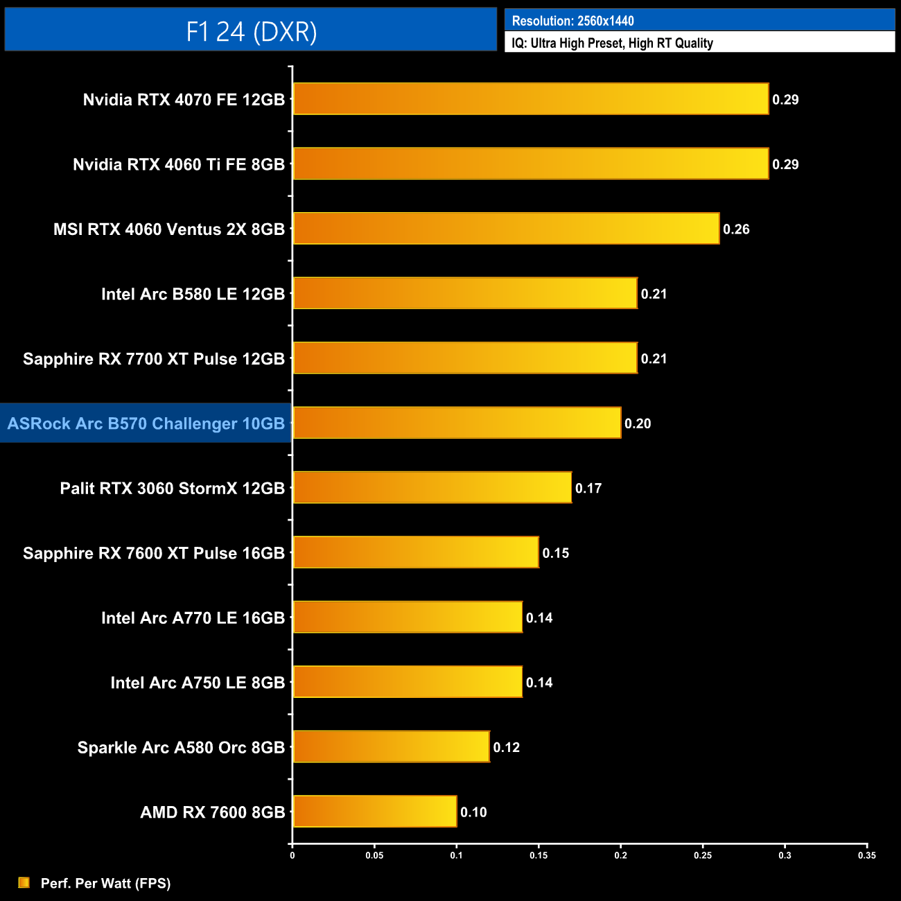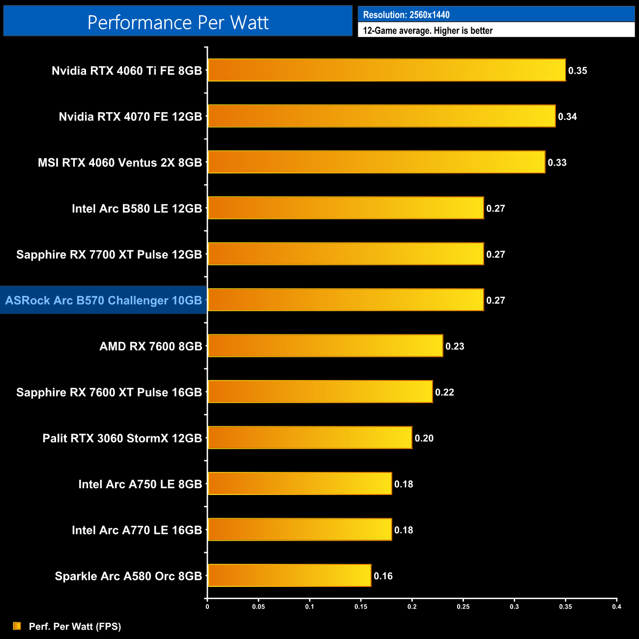 Things stay much the same at 1440p, with the B570 level with the B580 and RX 7700 XT in terms of average efficiency, but the B570 is 18% less performant per Watt compared to the RTX 4060.