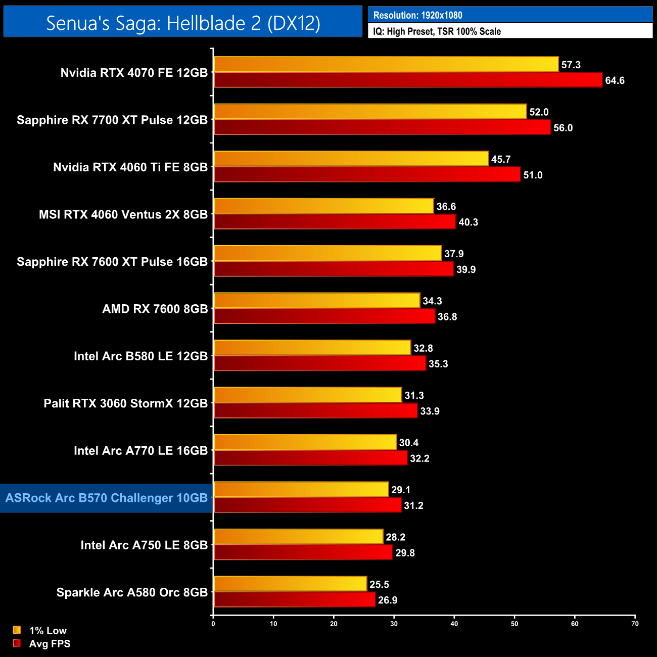 Returnal performs significantly better and is a genuinely good experience with maxed out ray tracing at 1080p. It only utilises two RT effects – shadows and reflections – but hitting nearly 60fps on average is a very solid result for the B570 given it's about level with the RTX 4060.