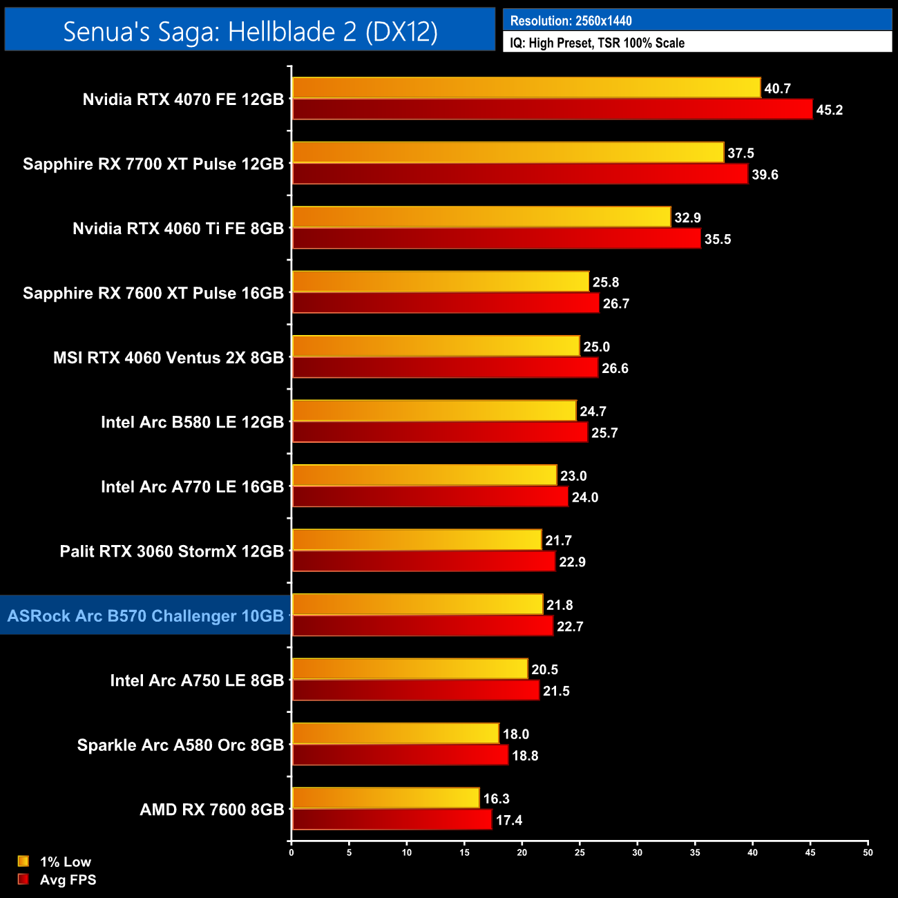 At 1440p we still get a solid 56fps, too, putting the B570 within just 1% of the RX 7600.