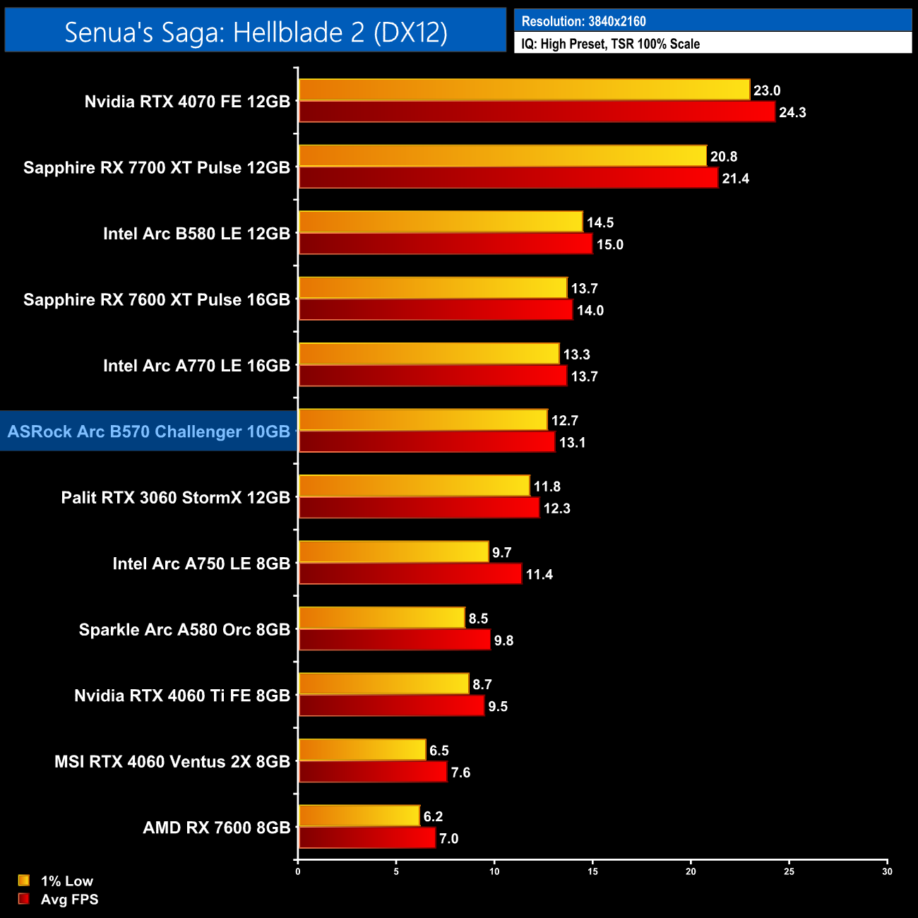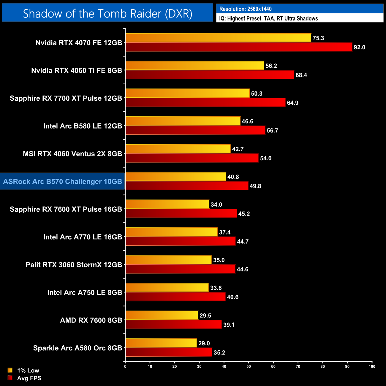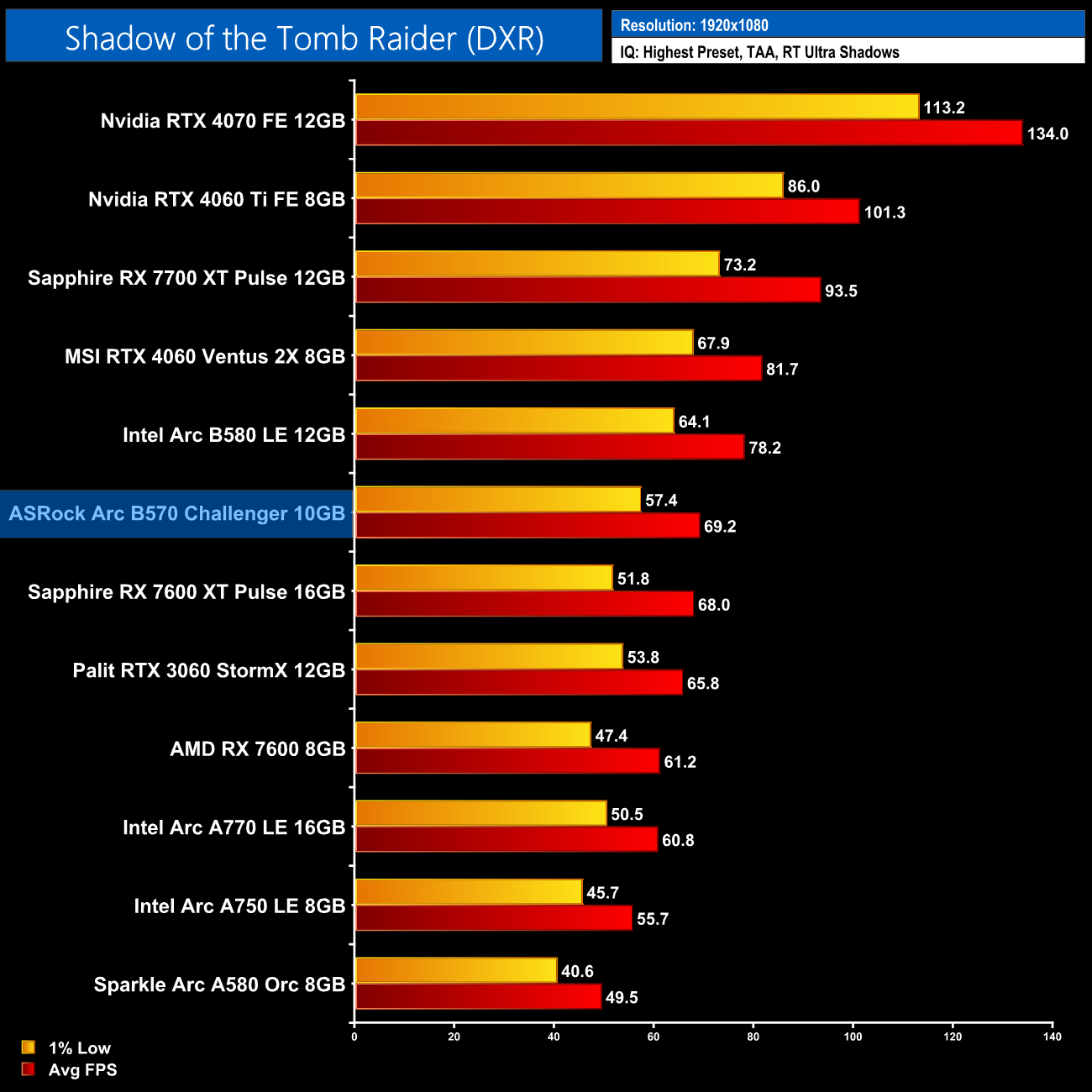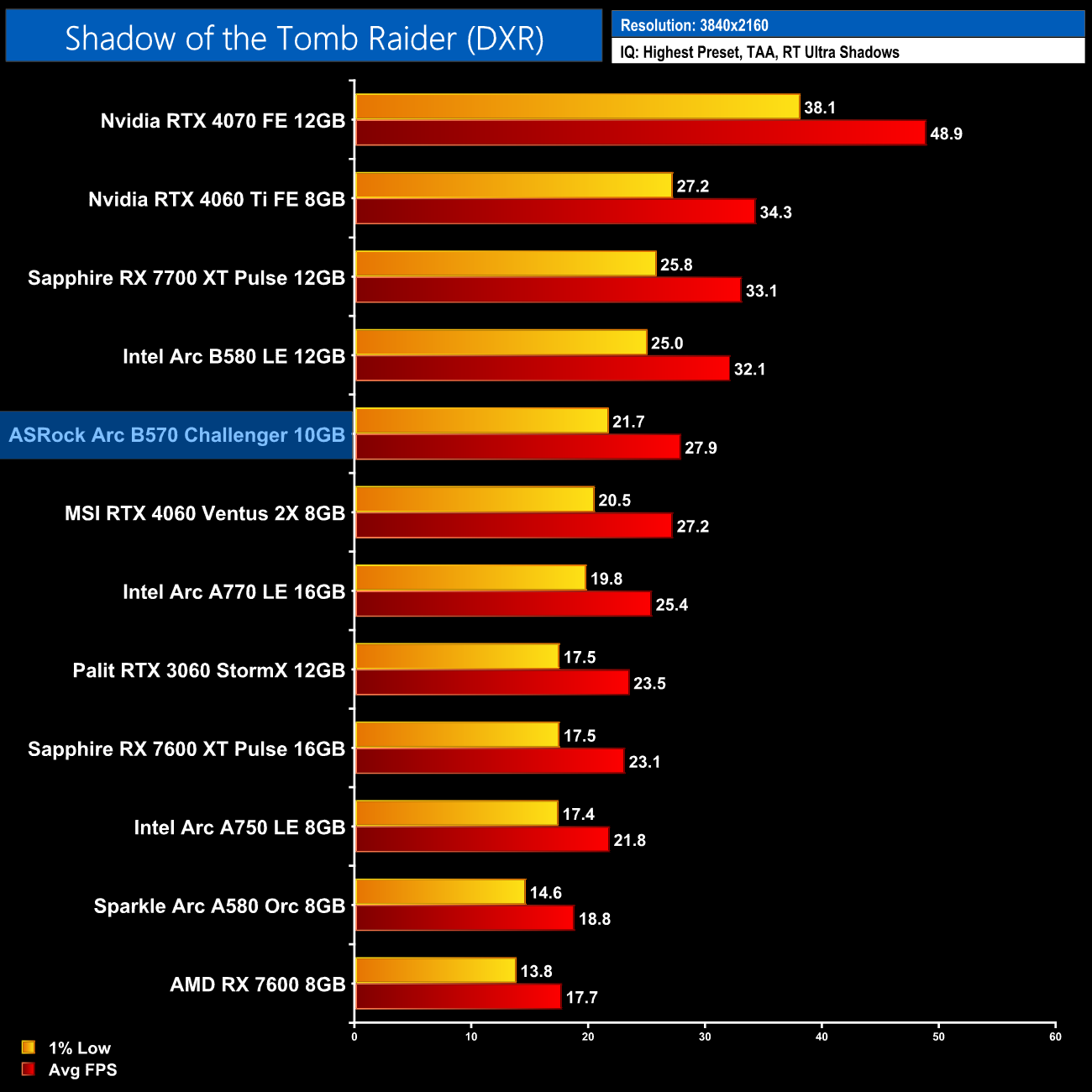 Shadow of the Tomb Raider plays as well as you'd expect given it's well over six years old and only features ray traced shadows. Even then, the fact the B570 is level with the RX 7600 XT shows you the potential for the Battlemage architecture.