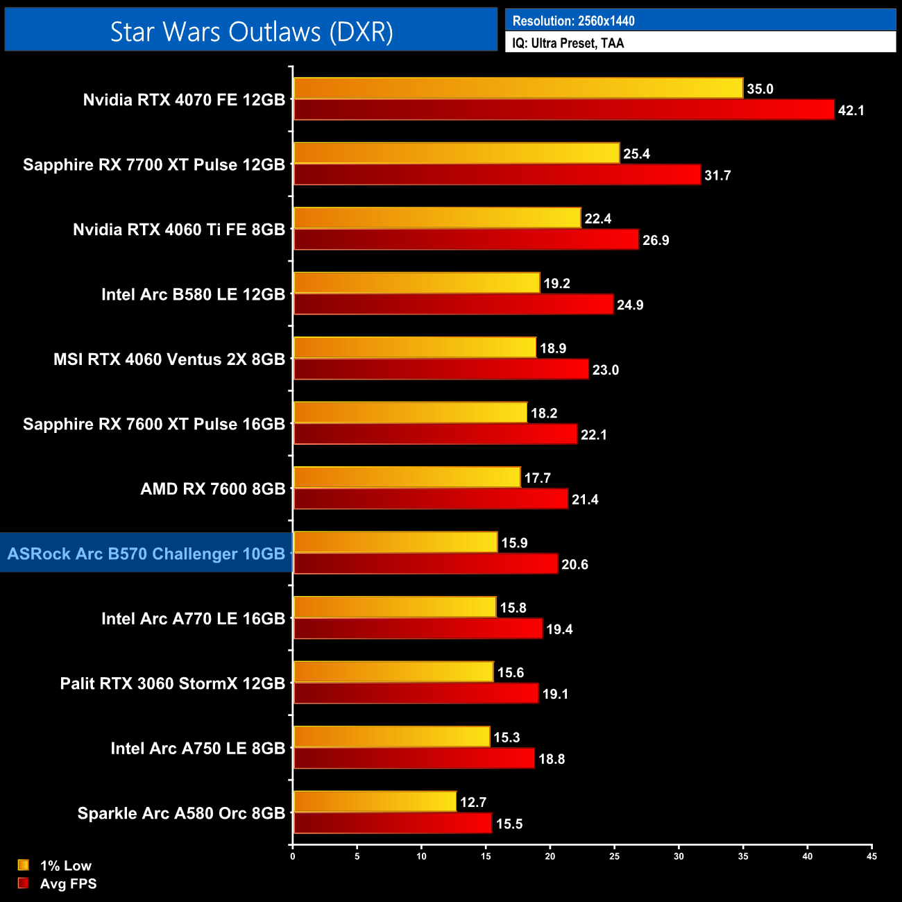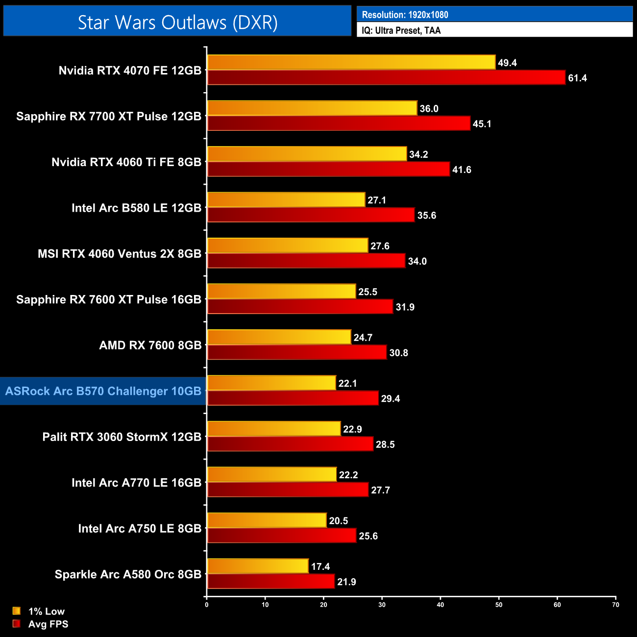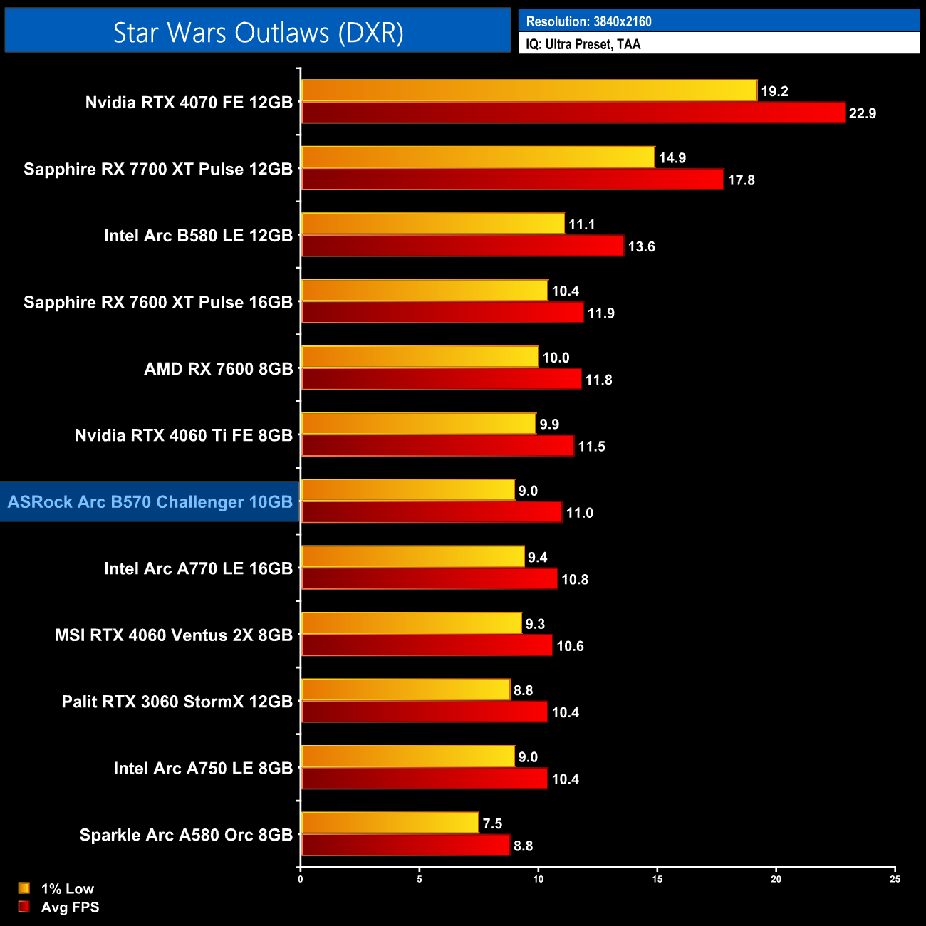 Lastly, we close with Star Wars Outlaws, a game where I unfortunately still experience regular crashing with Battlemage GPUs. When I was able to play the game, performance is decent, about level with the RX 7600, but still sub-30fps so you would want to enable upscaling. That is, if you can actually run the game longer than five minutes!