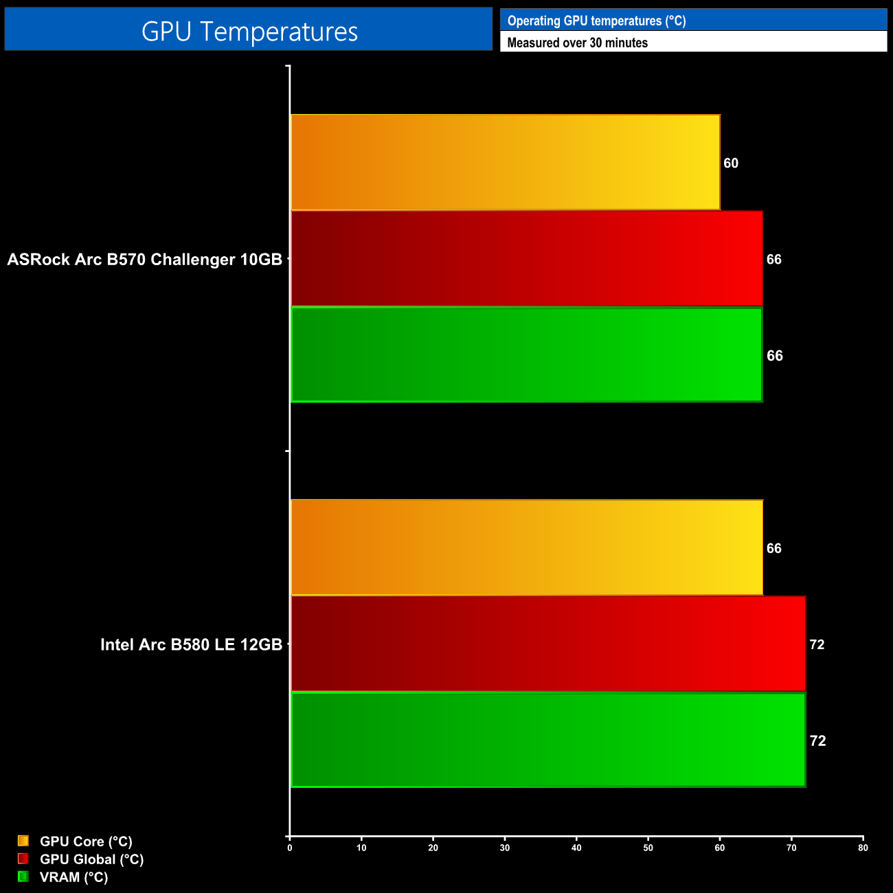 As for temperatures, I've only tested one B570 card for launch so I've included the B580 Limited Edition just as a reference point. It's not a direct comparison as the B570 draws less power, but it gives you an idea. In any case, the ASRock B570 Challenger is a very competent design, with the GPU core hitting just 60C, while the GPU Global and VRAM metrics topped out at 66C, so absolutely nothing to worry about.