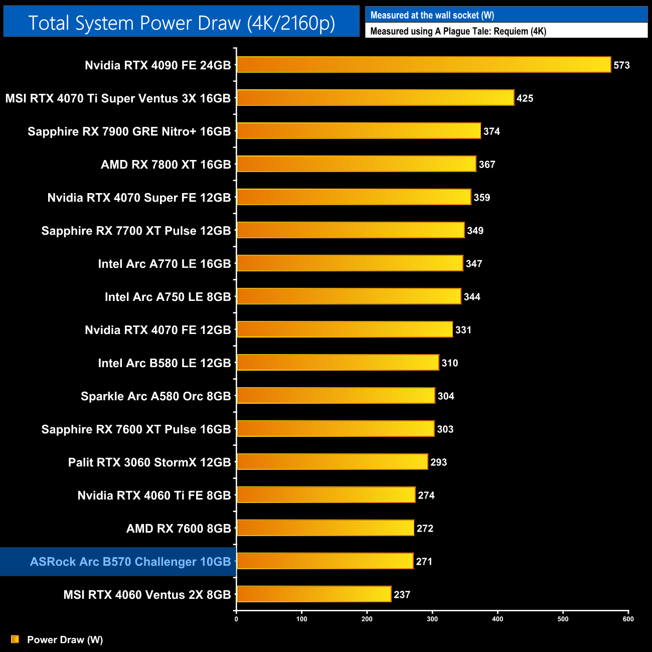 Lastly, total system power draw shows us what we already knew – the B570 is a very low-power graphics card, with the system pulling just over 270W at the wall. Only the RTX 4060 drew less.