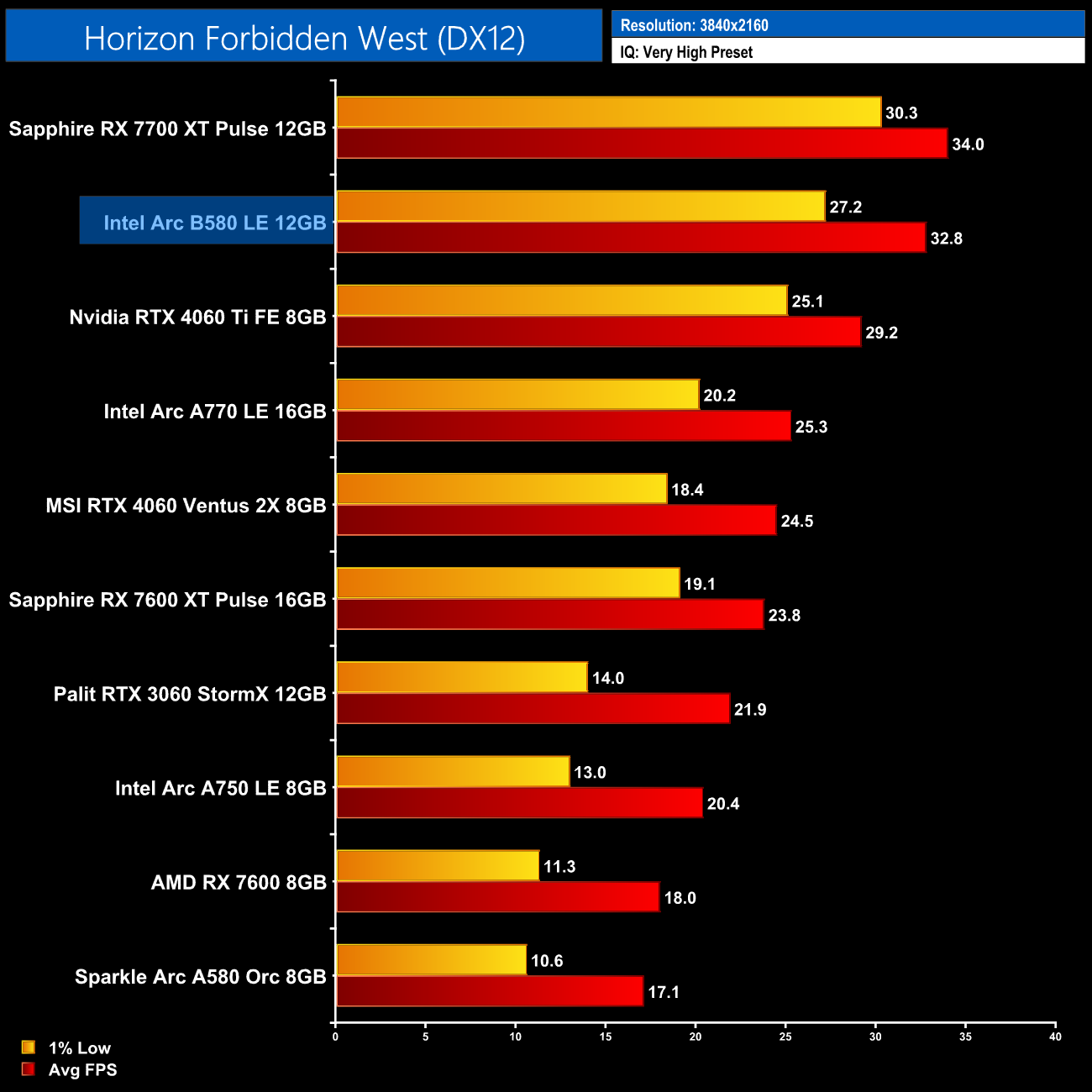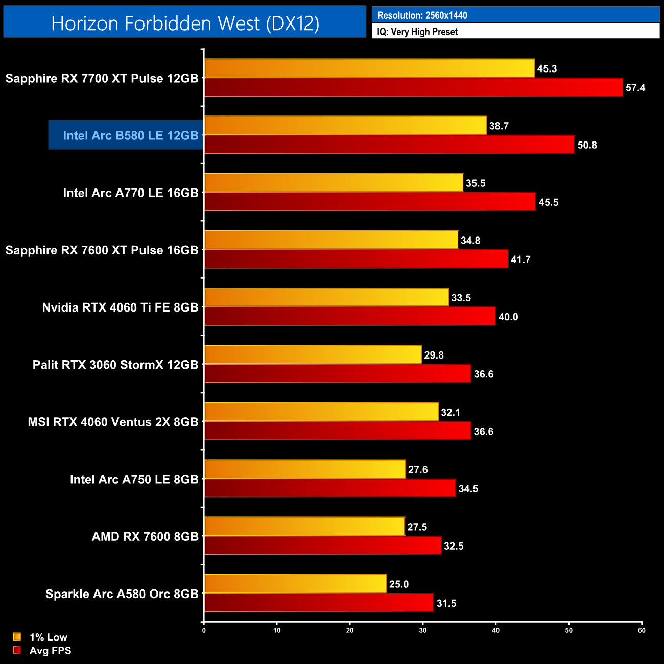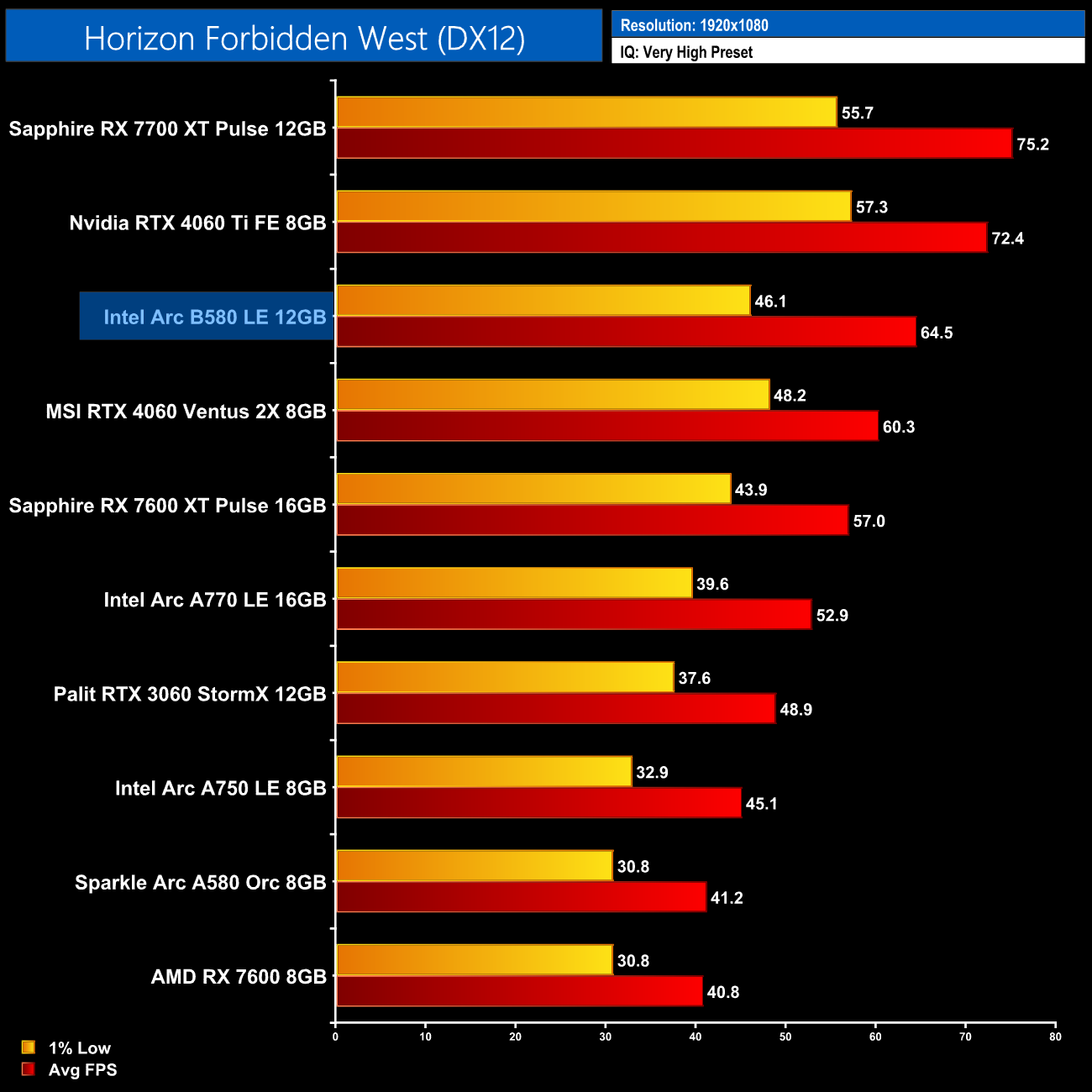 Next up is Horizon Forbidden West, where at 1080p the B580 manages 65fps, giving it a 7% lead over the RTX 4060, and a whopping 58% lead over the RX 7600 which seems to be struggling, quite possibly due to VRAM. The B580's 1% lows aren't quite as good, however, scaling slightly worse than the RTX 4060.