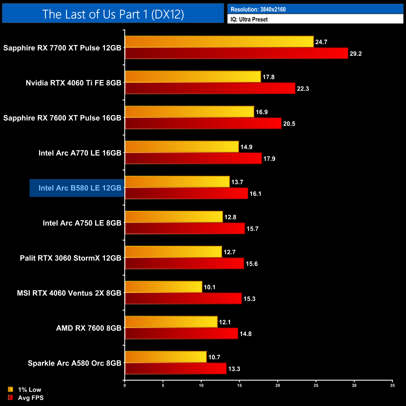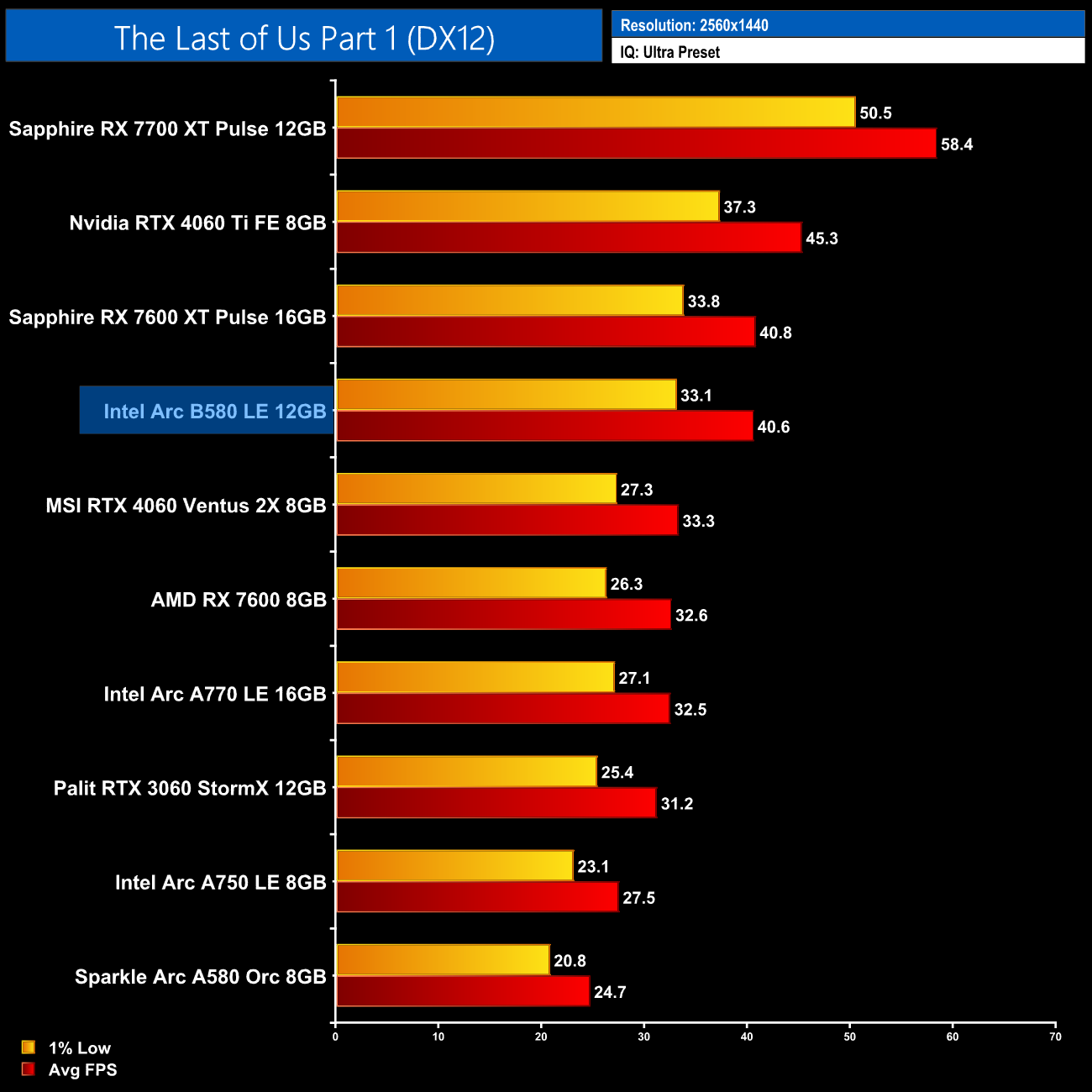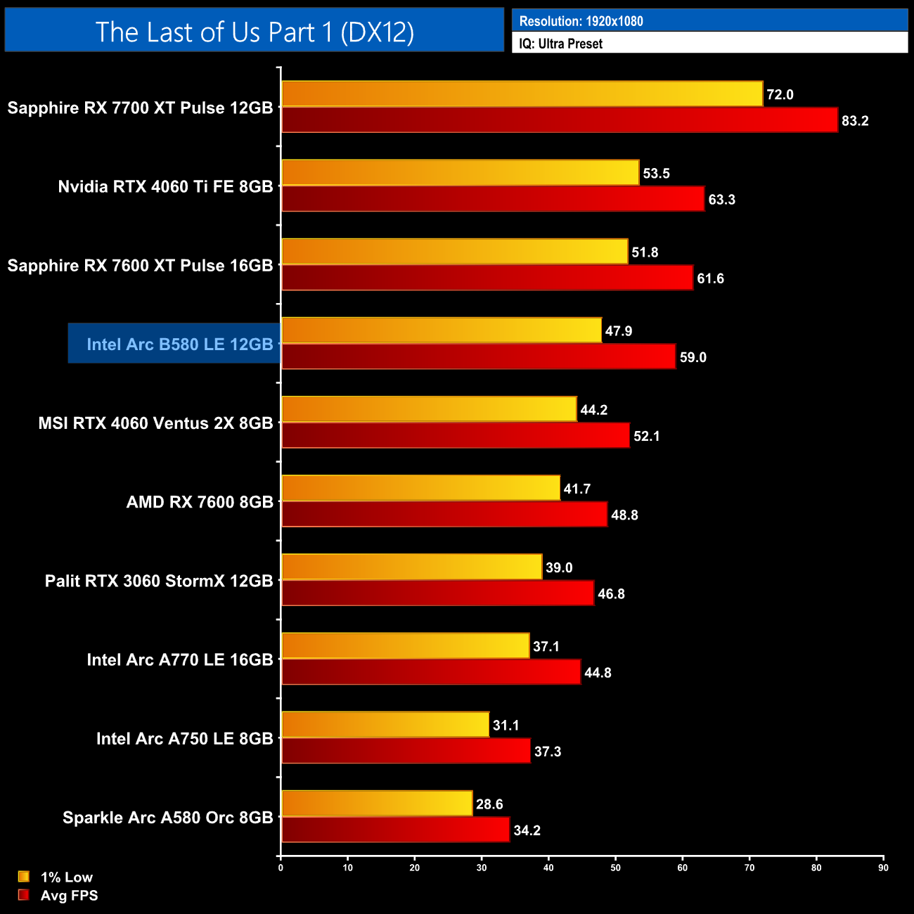 The Last of Us Part 1 is another title that is infamously VRAM-hungry, and that plays out in the B580's favour. It delivers huge gains over the likes of the A750 and RX 7600, while it's 13% ahead of the RTX 4060.