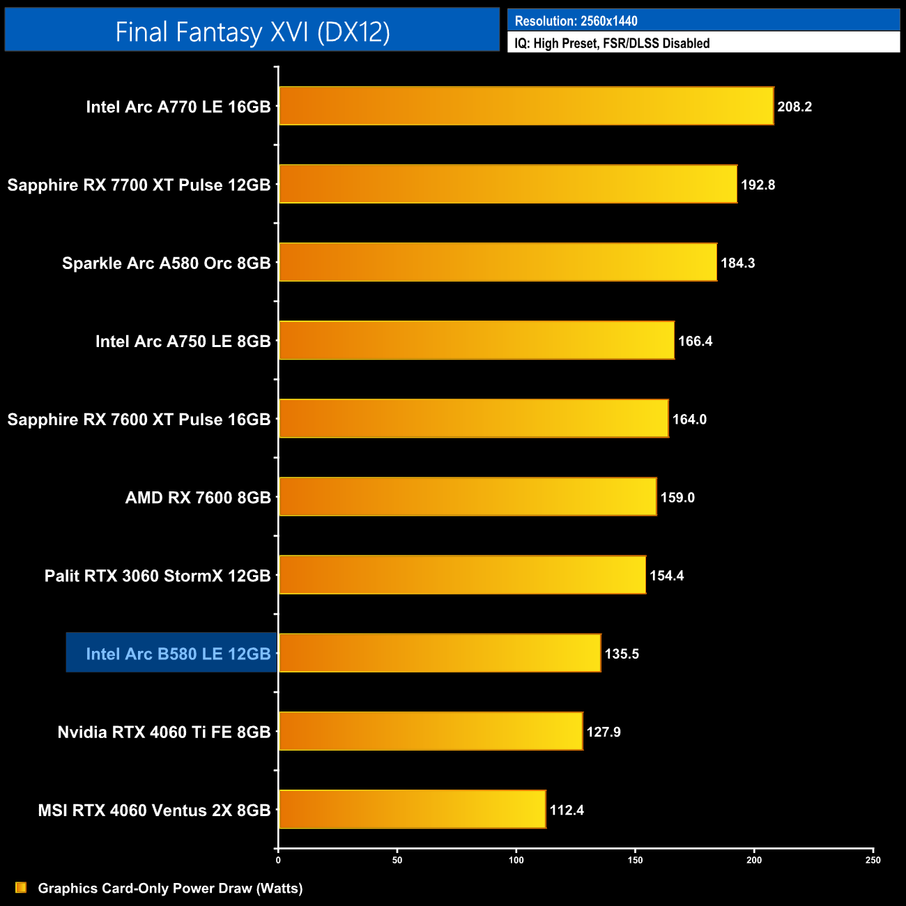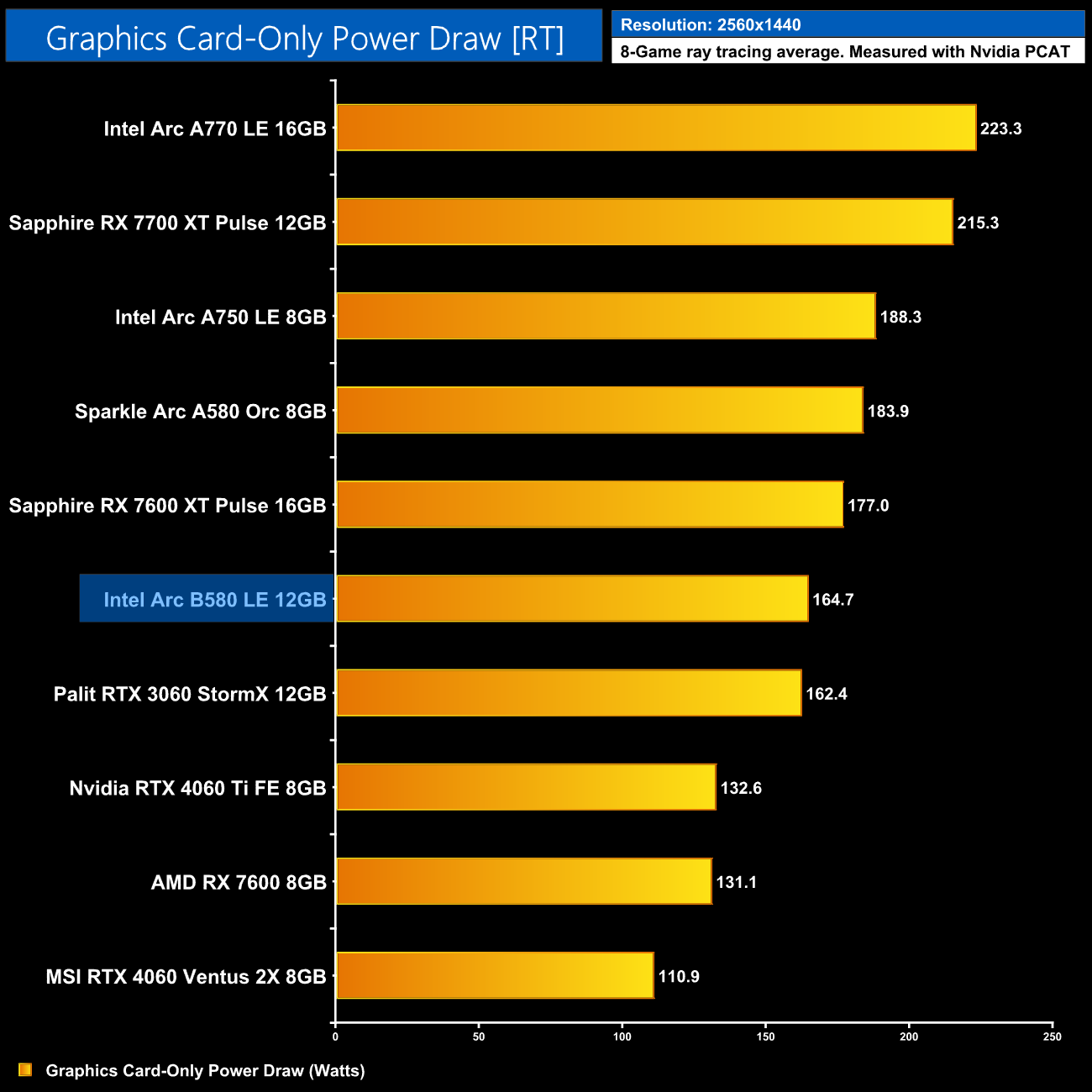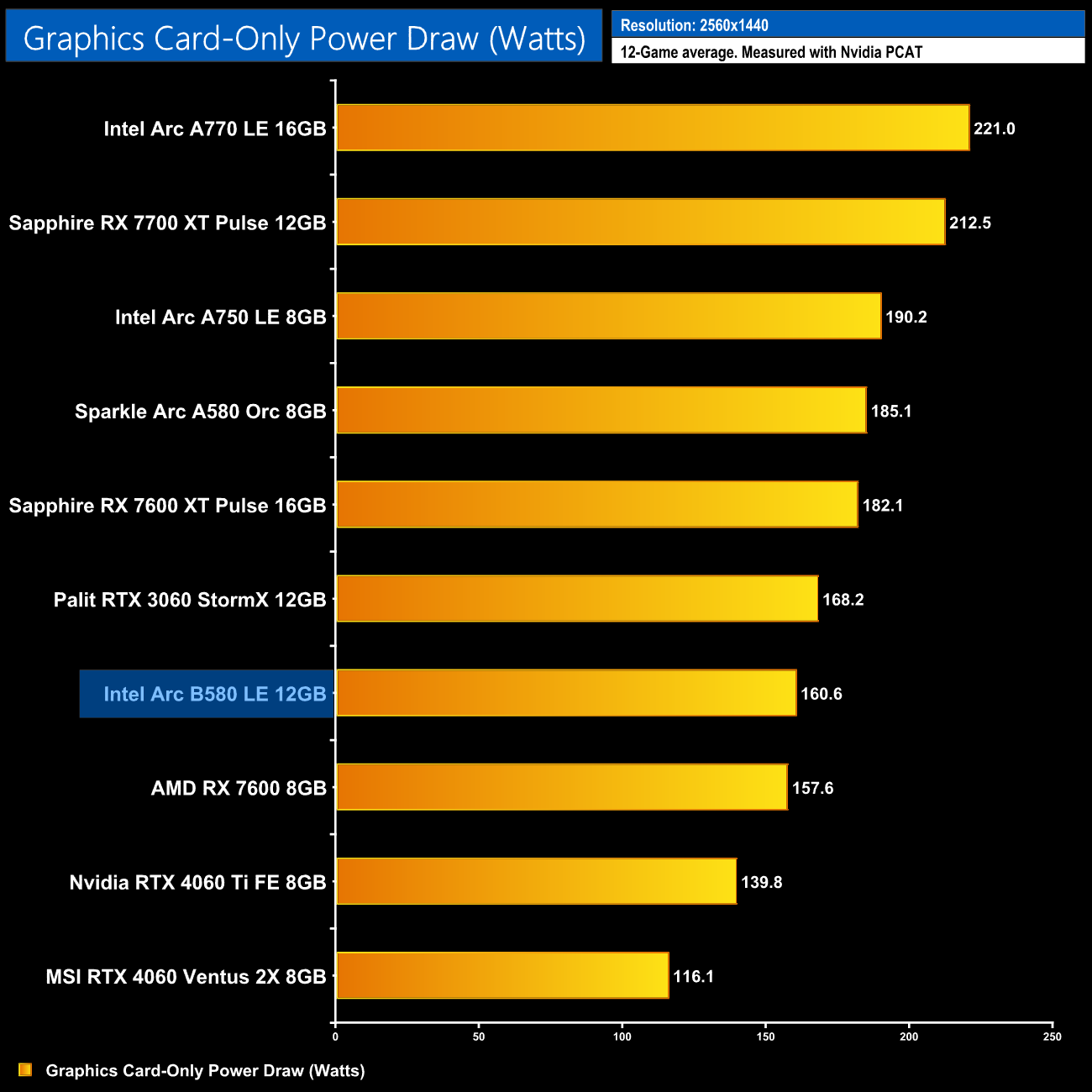 Even at 1440p, the B580 doesn't draw close to its 190W TBP, averaging 160.6W in my testing. That's about 30W less than the A750, despite being significantly faster, so that bodes well for our efficiency data which we'll get to in a minute.
